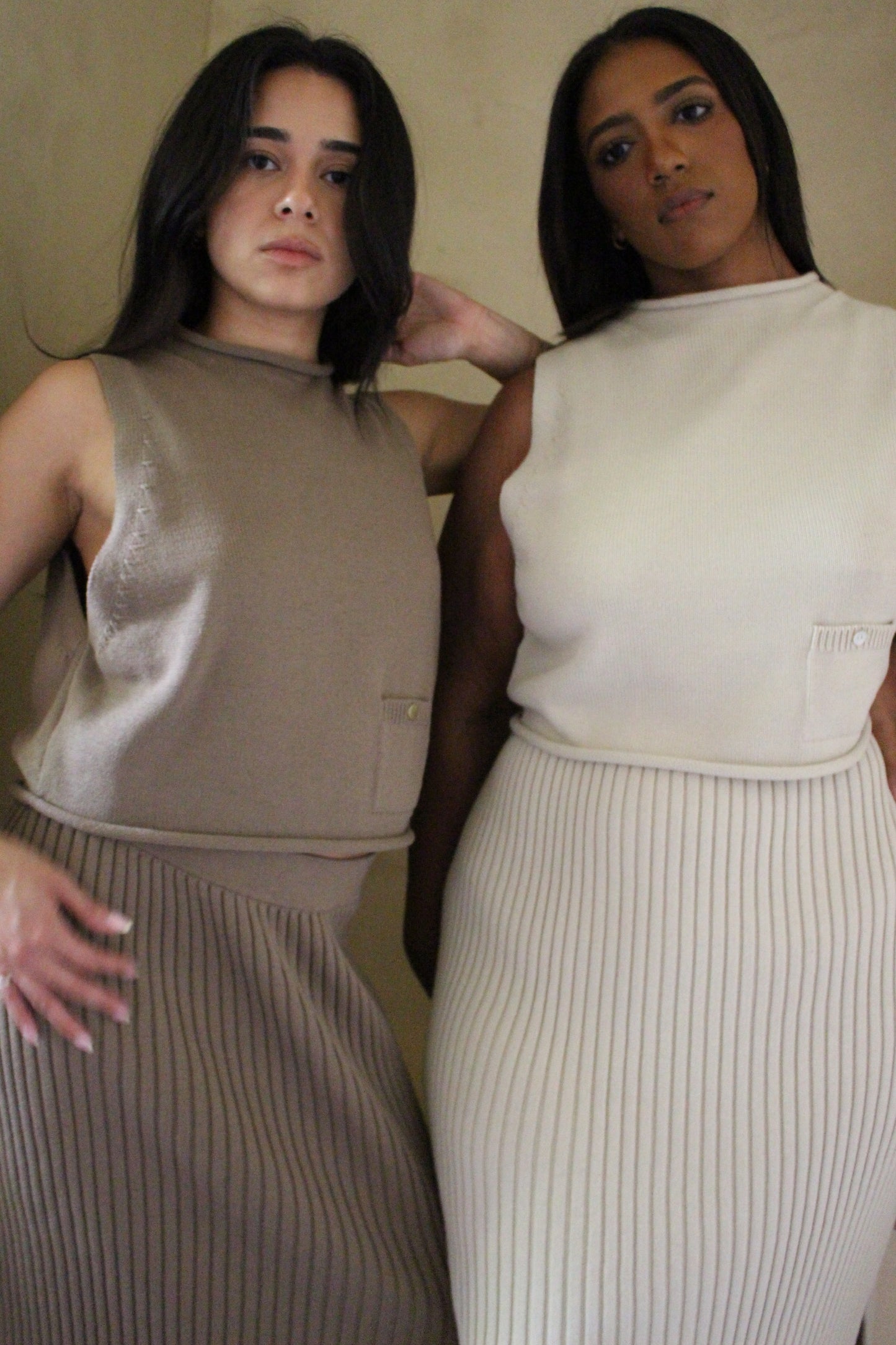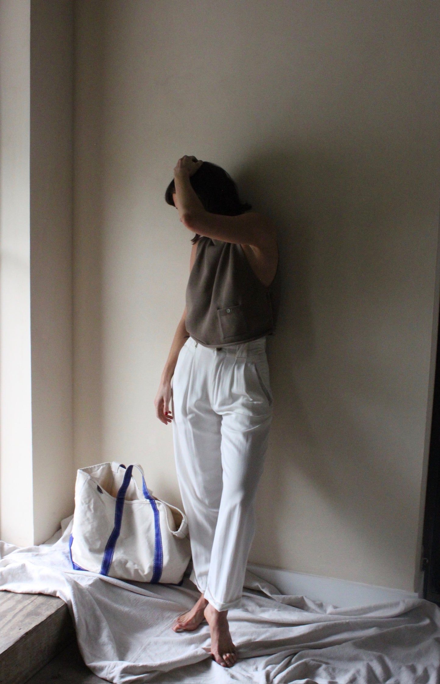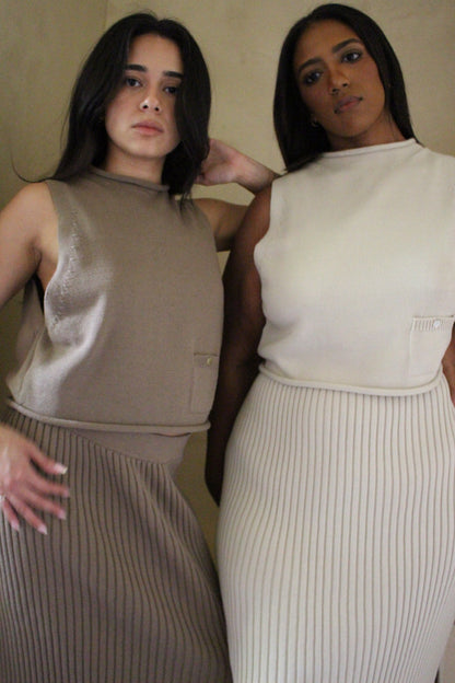 The Milo Pima Cotton Crop Vest is a charming pull-on top that includes a small rolled neckline and intricate accents all over, as well as a little front pocket. We envision pairing the Milo Crop with our Townes Trouser in cotton twill or with one's go-to vintage denim.