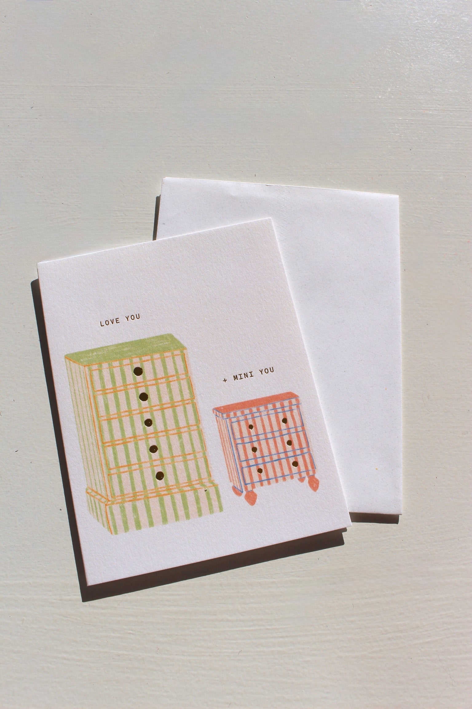 A tall dresser and a mini version with script "Love you, + mini you".