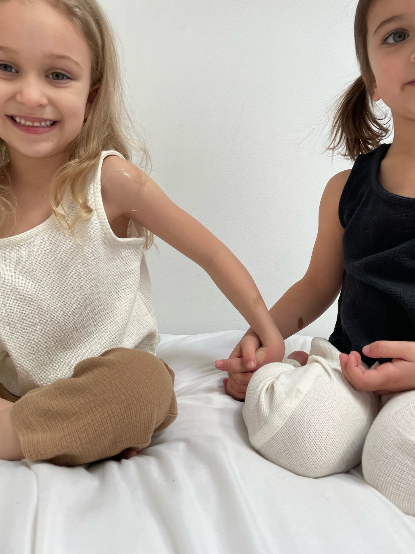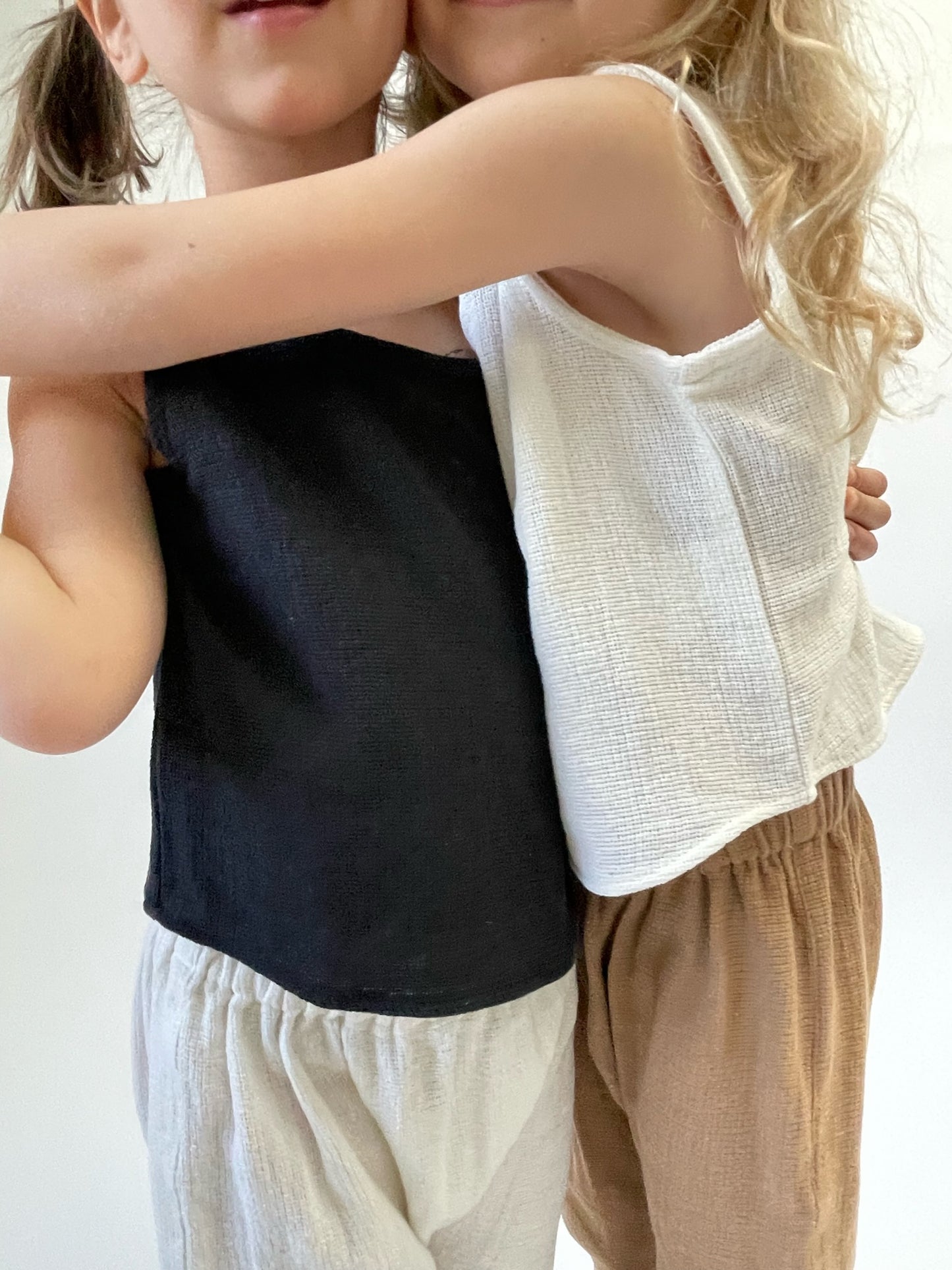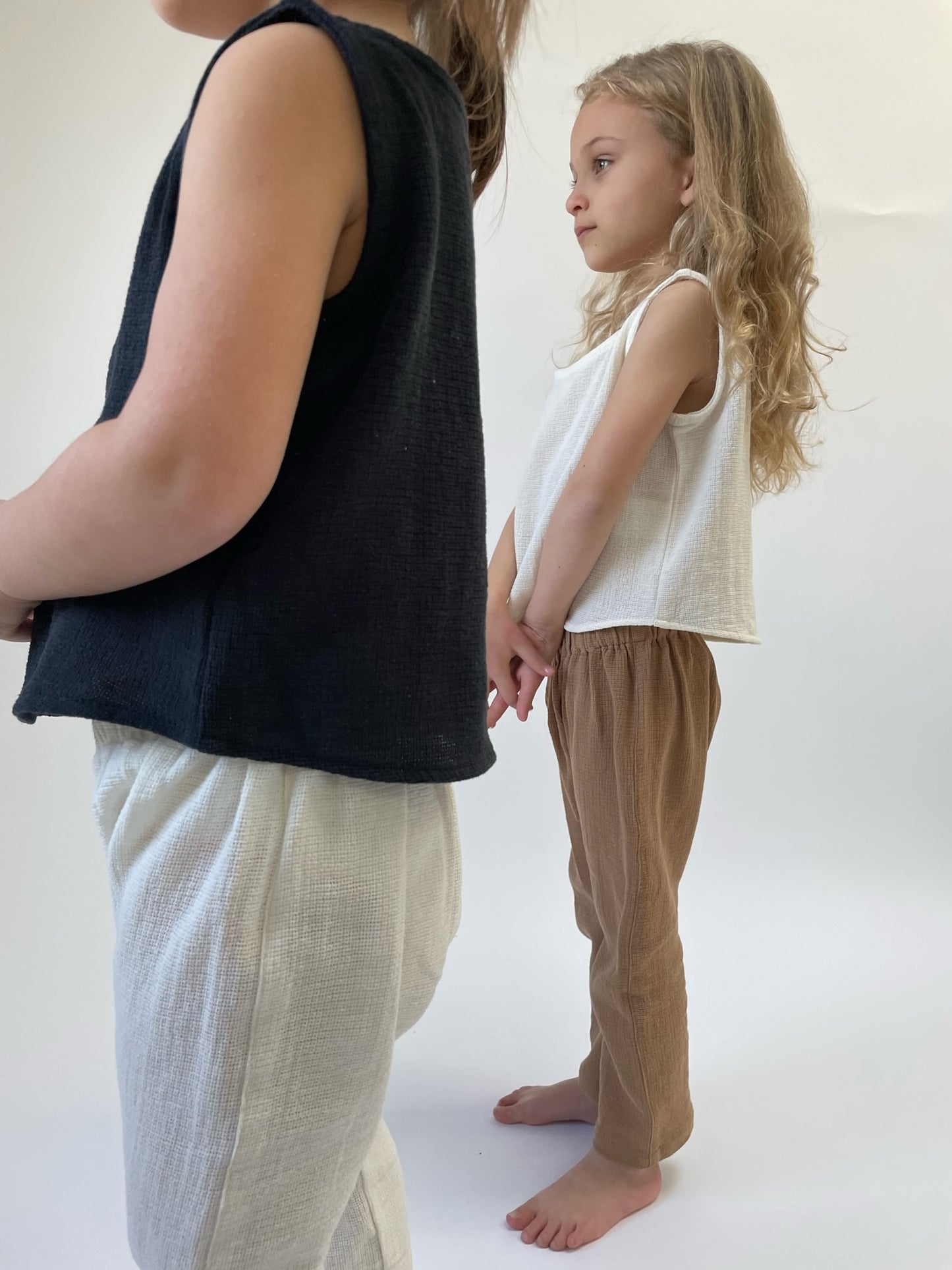 The Mini Marni Tank is our quintessential easy top made especially for our little ones. Our waffled cotton fabric is exceptionally breathable and the style lends itself for wear from daytime adventures to sleep apparel. Pair this warm weather children's top with the Scooter Waffled Cotton Harem Pant in waffled cotton for a sweet set option!