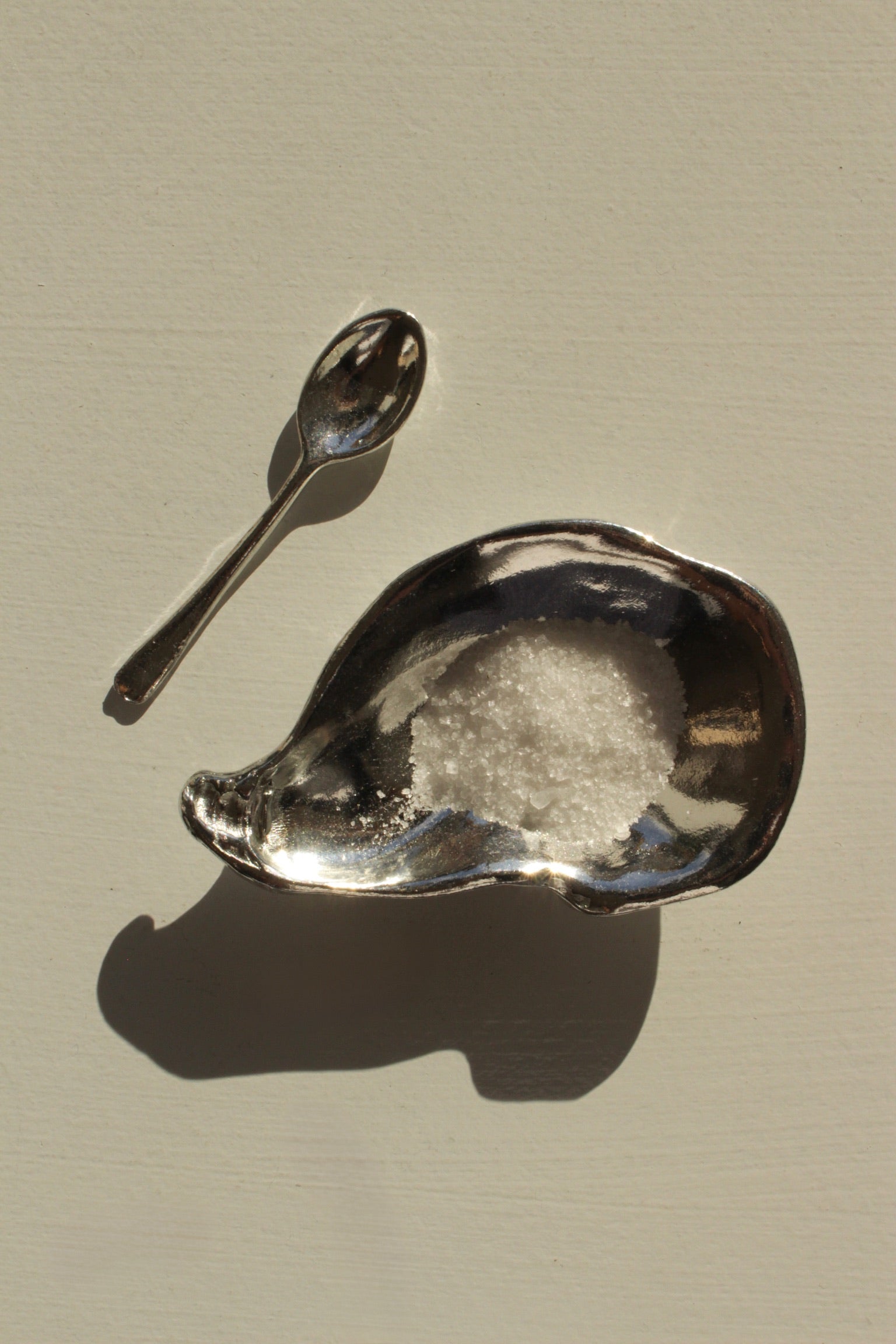 This exquisite pewter salt dish features a beautifully crafted oyster shell design, elegantly topped with a matching spoon. Its unique aesthetic not only serves as a functional kitchen accessory but also adds a touch of sophistication to any dining table. Ideal for seasoning dishes or as a decorative piece, this salt dish is a perfect blend of artistry and utility.