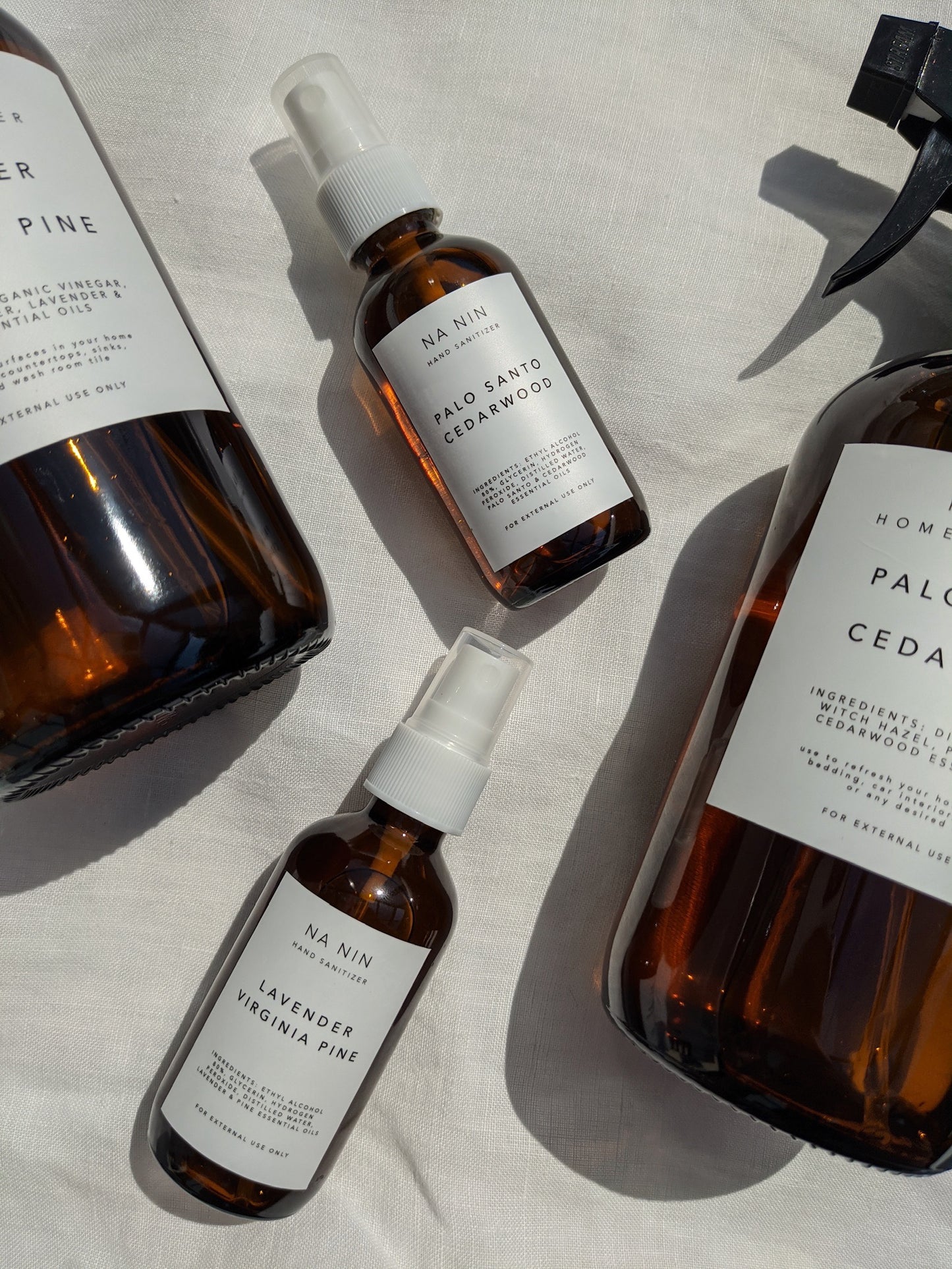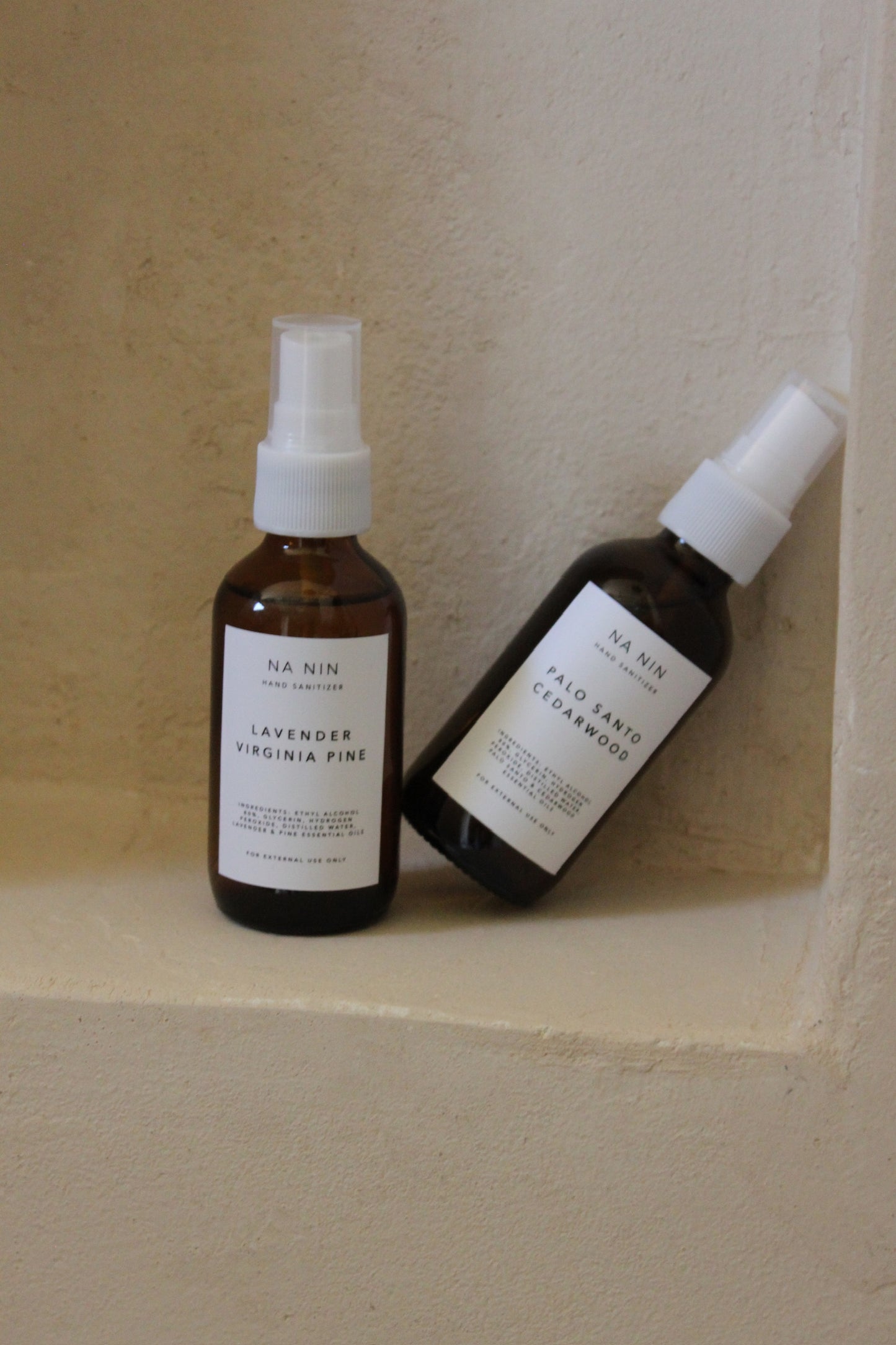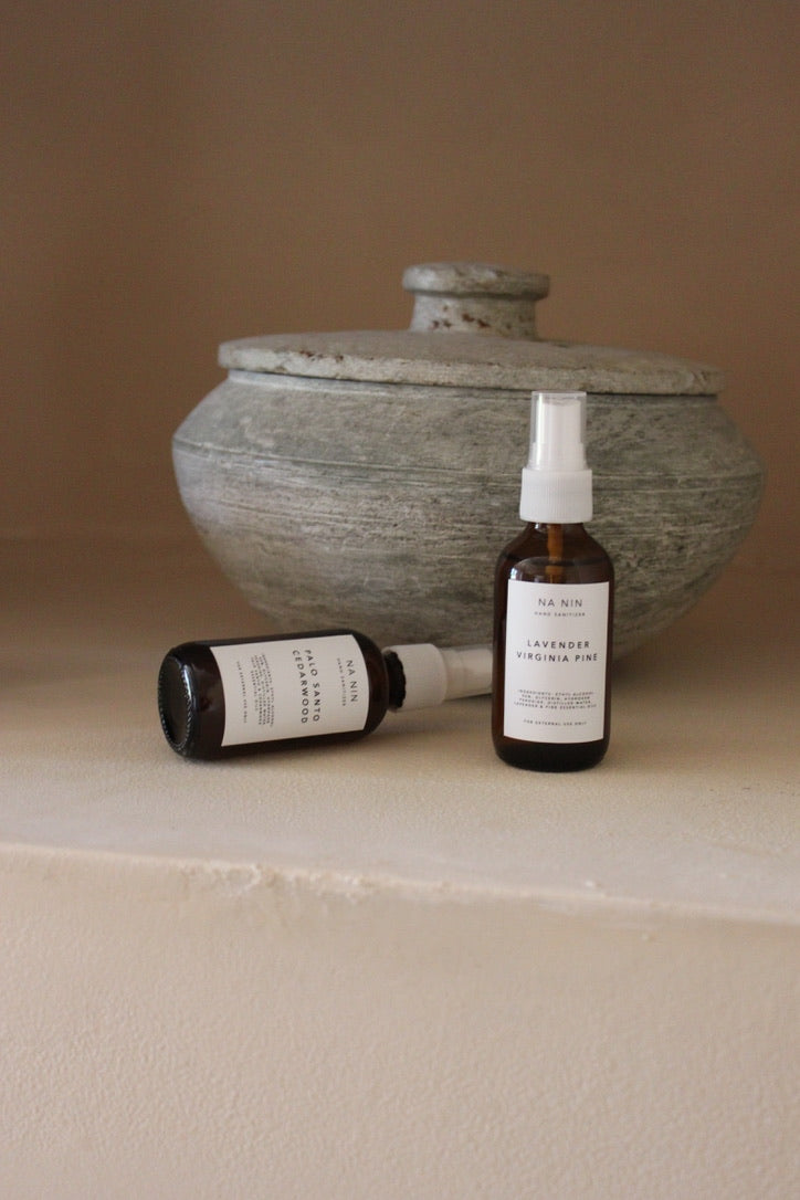 We've made essential oil-based hand sanitizers in two of our favorite natural scents - Palo Santo/Cedarwood, a woodsy purifying scent, and Lavender/Virginia Pine, a cooling herbaceous scent. Spray generously on hands and rub until dry to sanitize and refresh on the go.