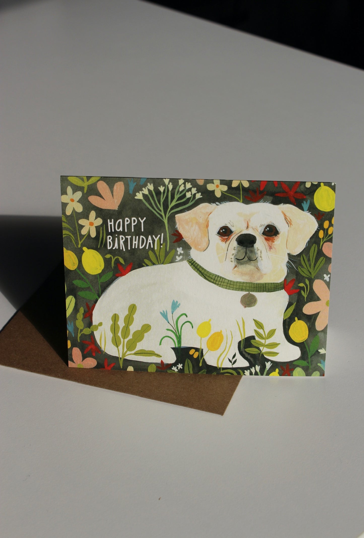 Cutest puppy in a field of flowers. Script reads "Happy Birthday".