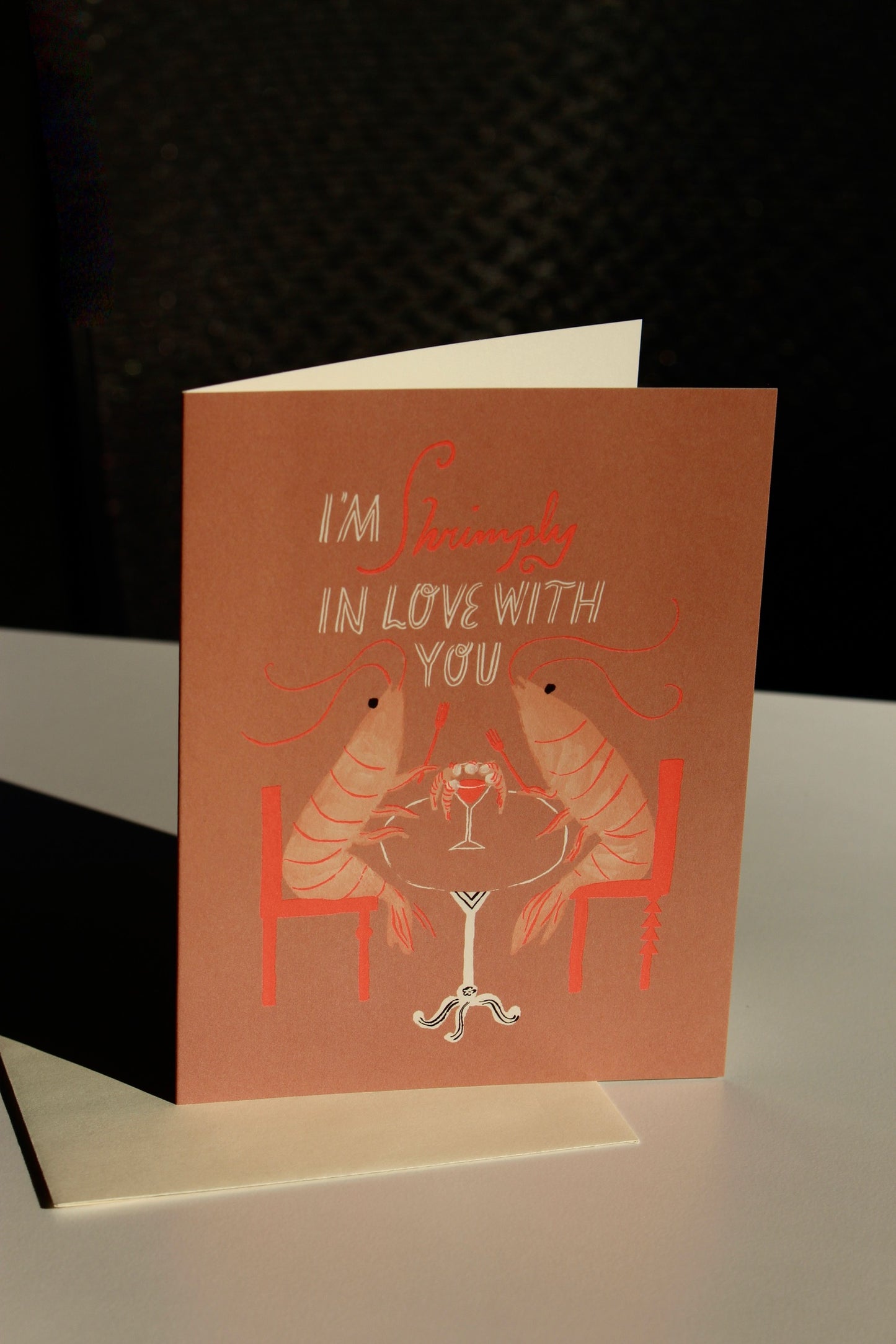 Cutest pale pink greeting card with two shrimp sitting down for a meal. The front reads "I'm Shrimply In Love With You".