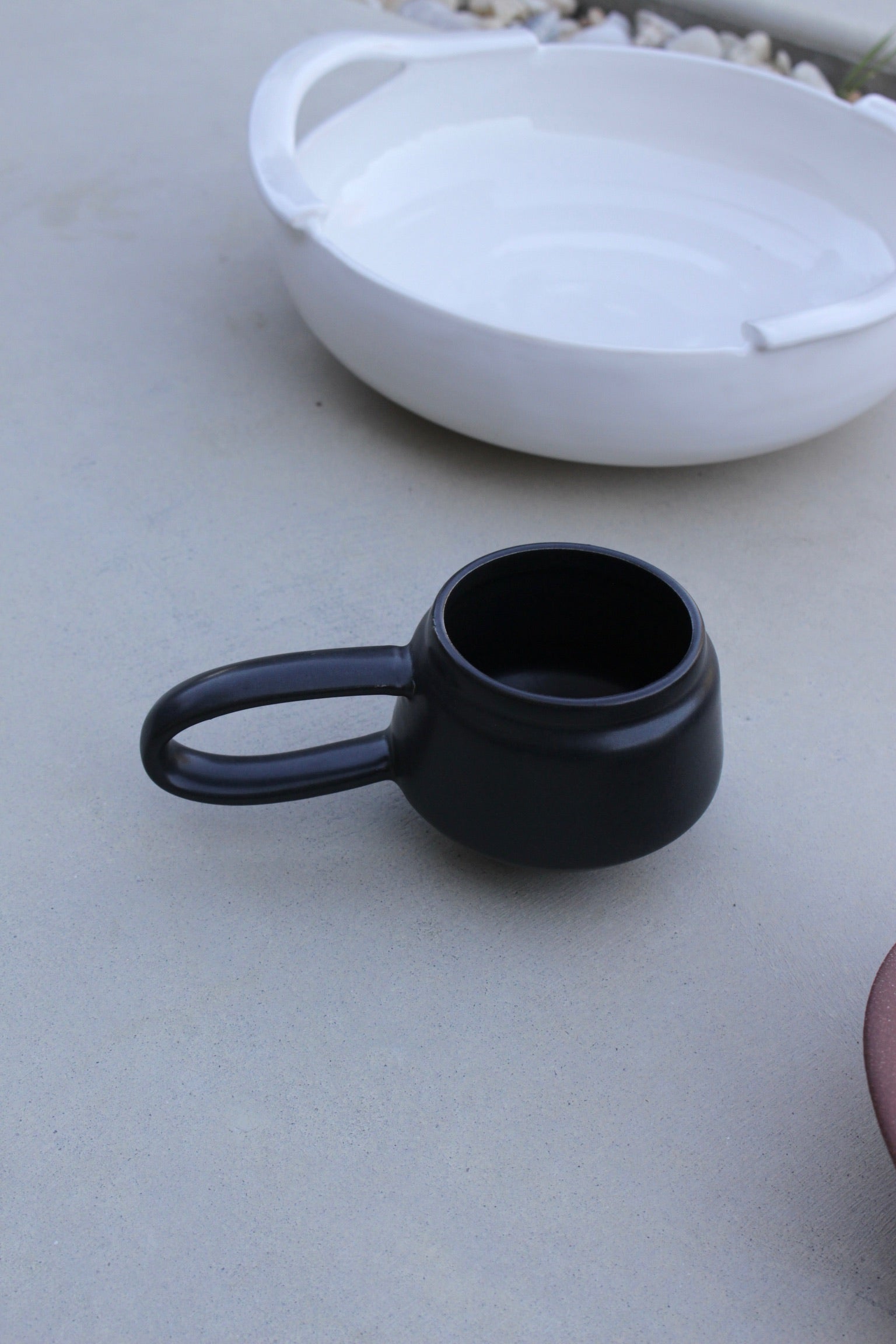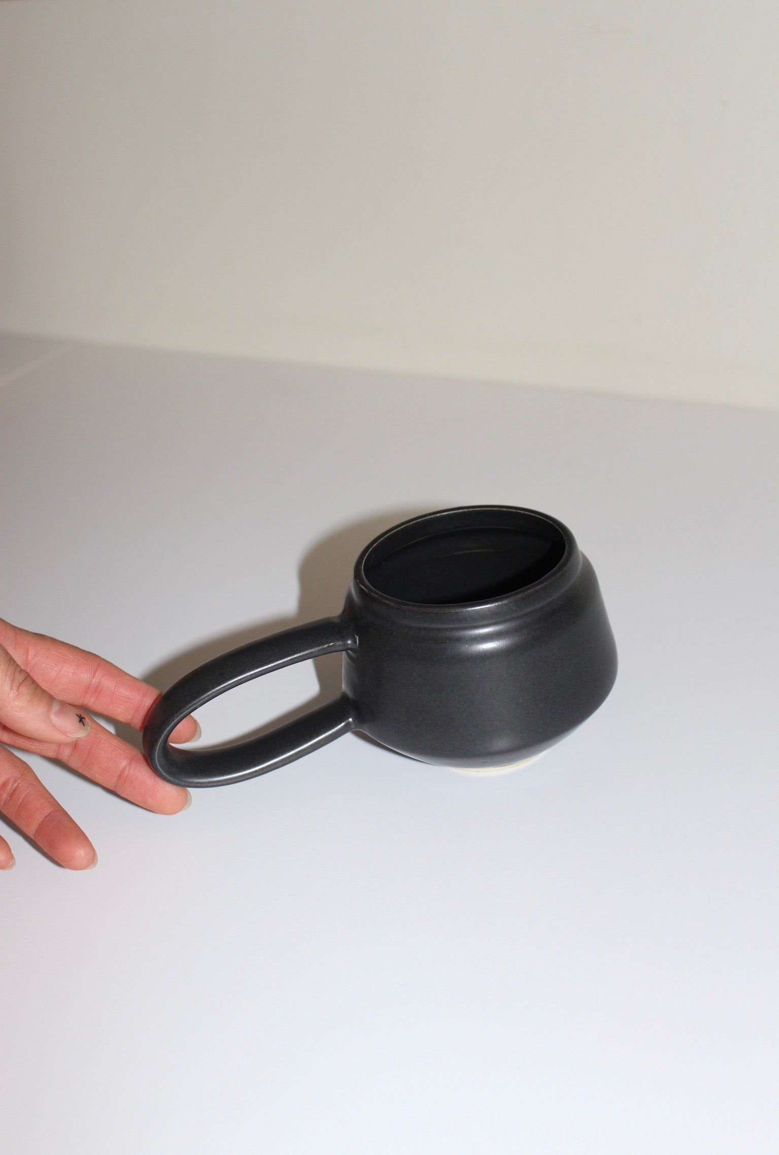 The Rian Mug by Emily Wicks is a beautifully handcrafted ceramic piece made from white stoneware clay and coated with a satin glaze. Each mug is individually thrown by hand, ensuring its uniqueness. It boasts a distinctive loop-shaped handle, a tiered lip, and an elegant, sculptural base that highlights its artisanal quality.