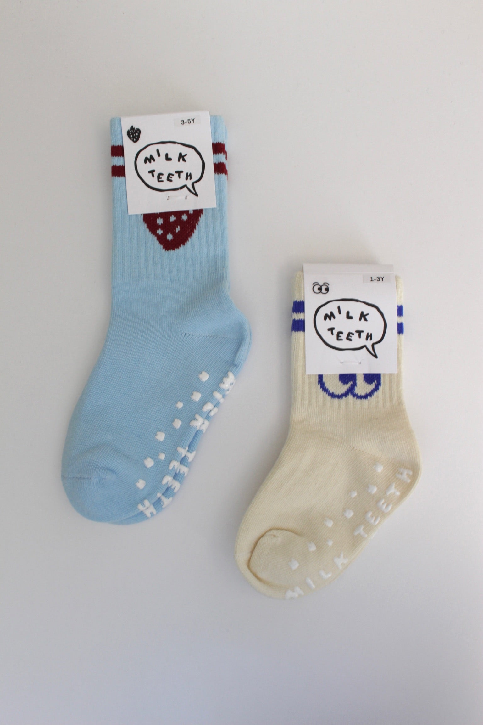 These ribbed cotton grip socks feature sporty striped accents and charming emblems of eyeballs or strawberries. Crafted from soft, stretchy cotton for comfort, they include rubber anti-slip soles to ensure secure footing.
