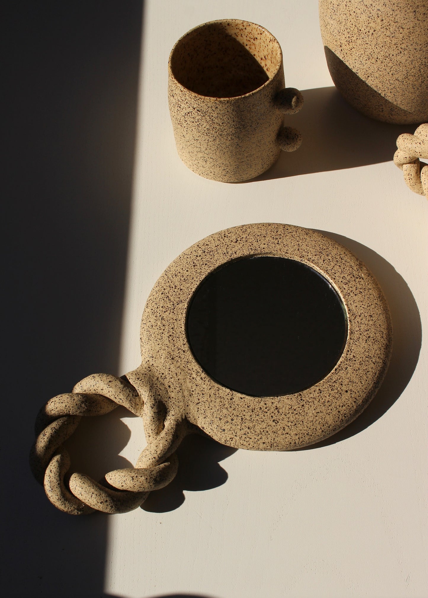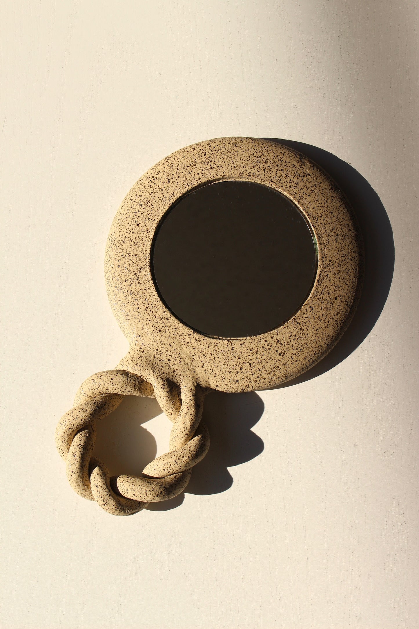 The Rope Hand Mirror boasts a unique circular braided coil handle, giving it a modern heirloom charm. It can also be utilized as a wall mirror for added versatility.