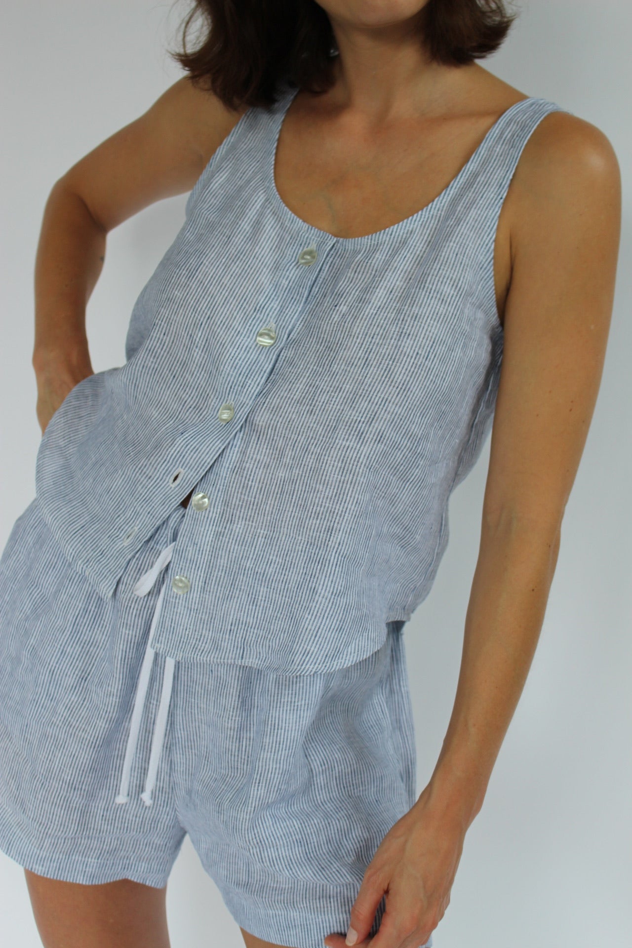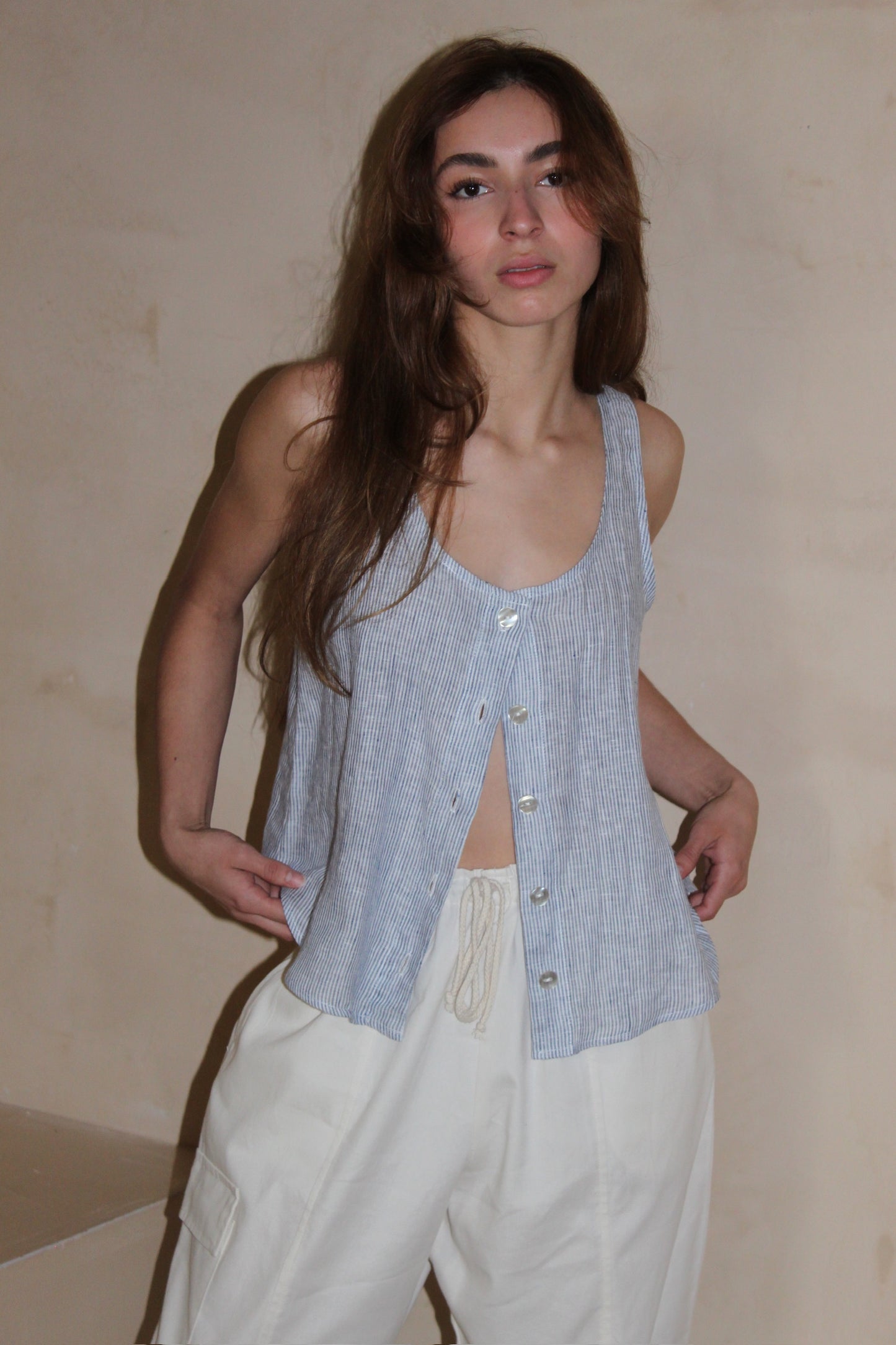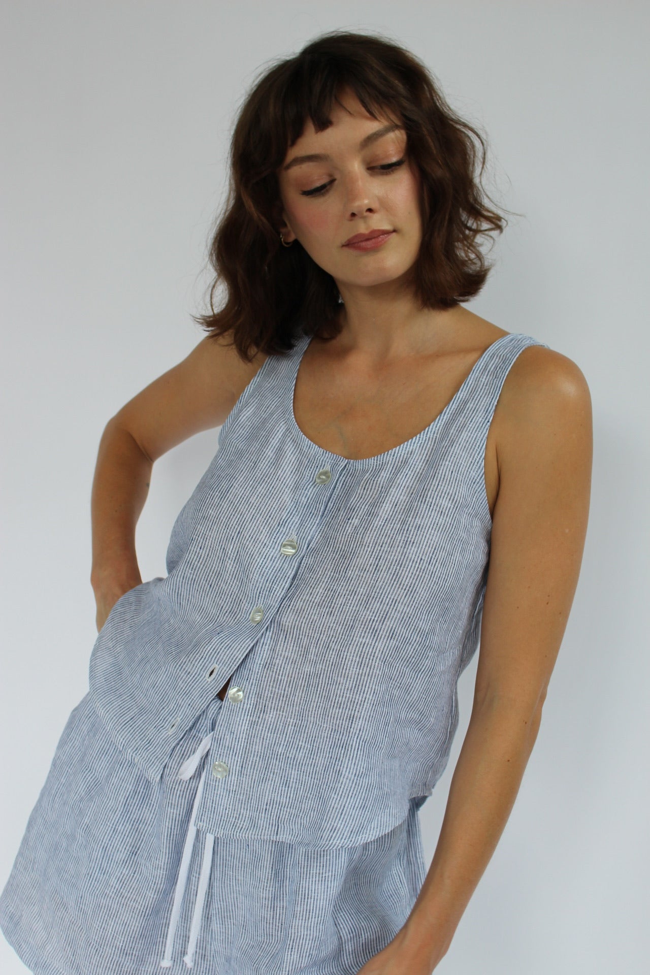 The Ryan Linen Top is a versatile addition to any wardrobe, effortlessly complementing vintage denim as well as easy pull-on styles. It boasts petite front buttons, a curved hem, and delicate straps. Made from lightweight and breathable linen, this top offers the perfect blend of softness and earthy texture for a truly stunning look and feel.