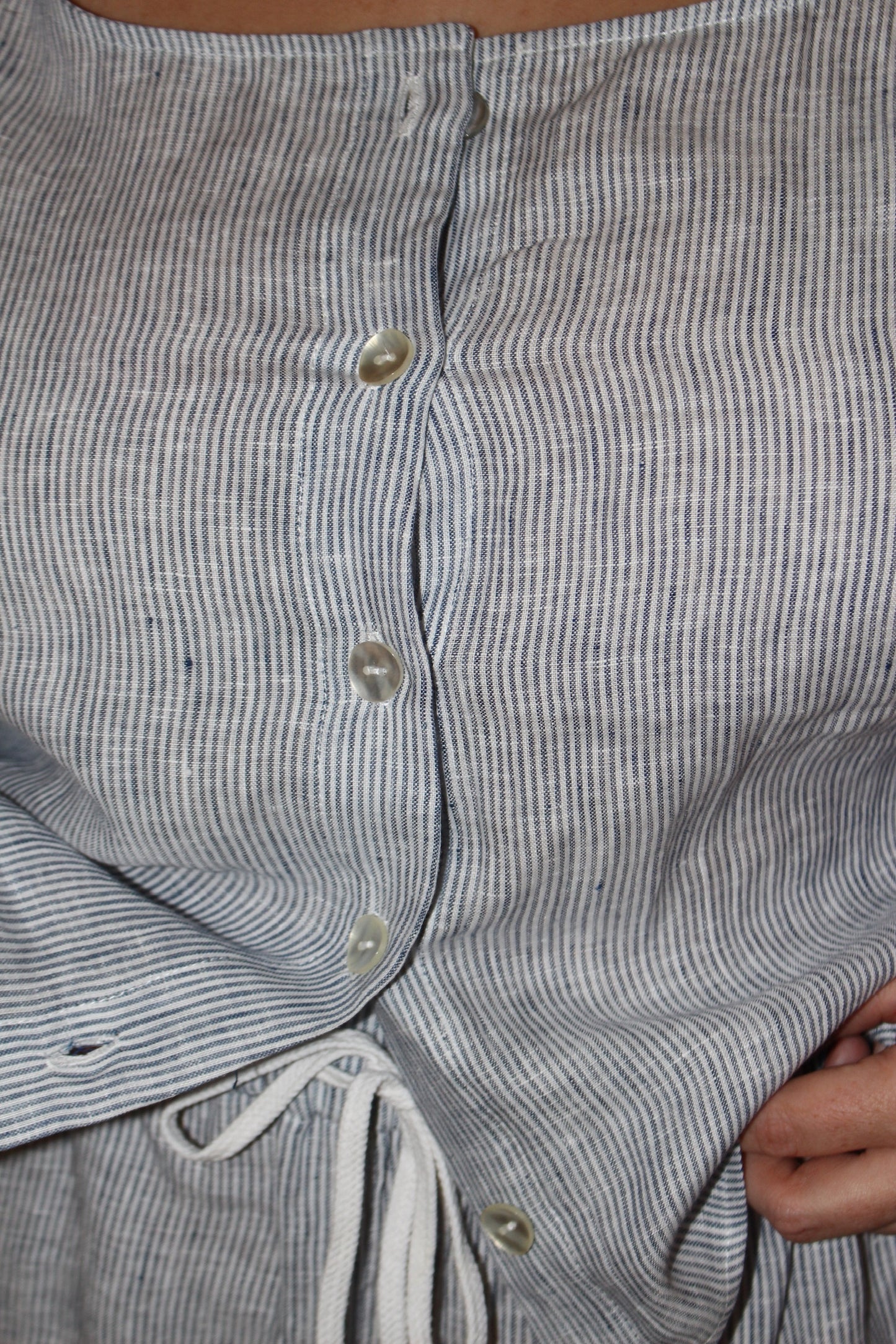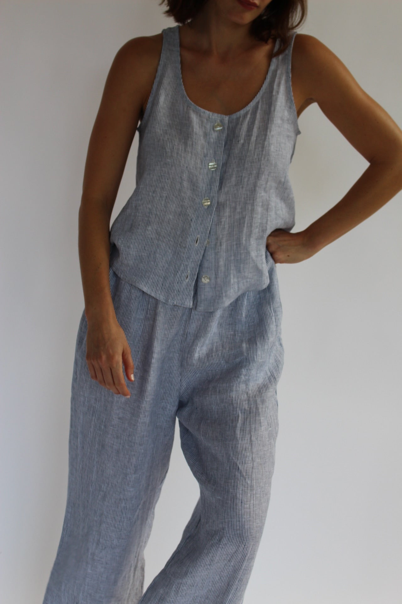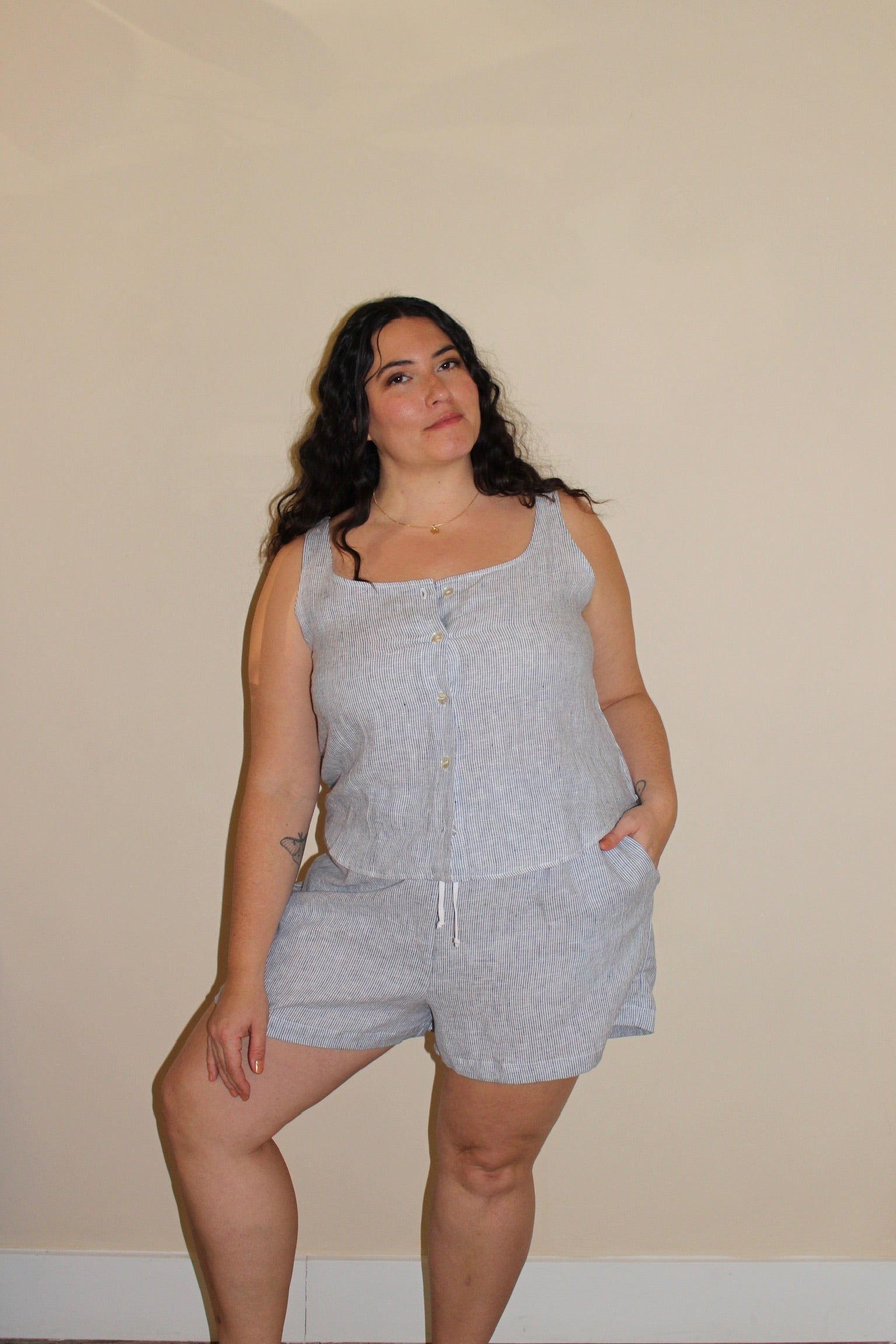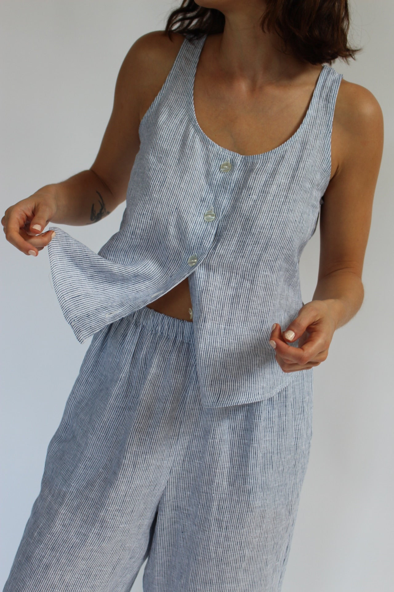 The Ryan Linen Top is a versatile addition to any wardrobe, effortlessly complementing vintage denim as well as easy pull-on styles. It boasts petite front buttons, a curved hem, and delicate straps. Made from lightweight and breathable linen, this top offers the perfect blend of softness and earthy texture for a truly stunning look and feel.