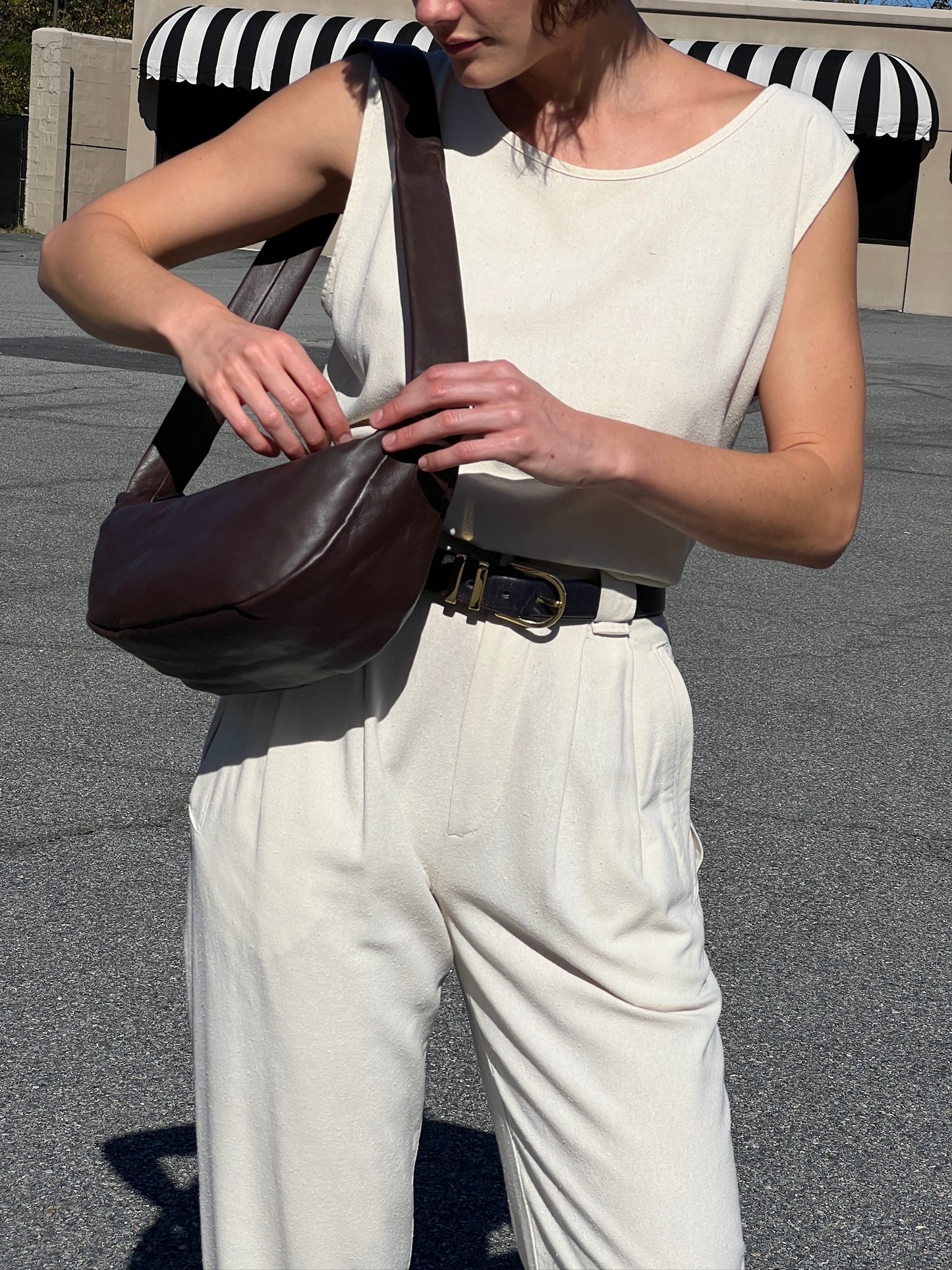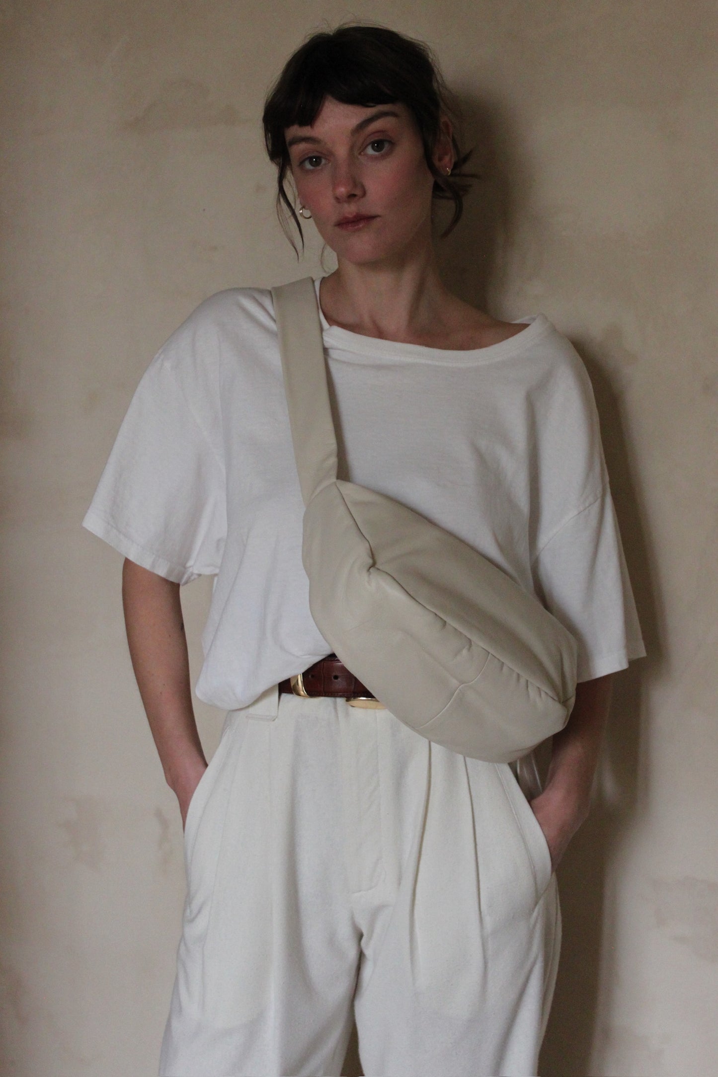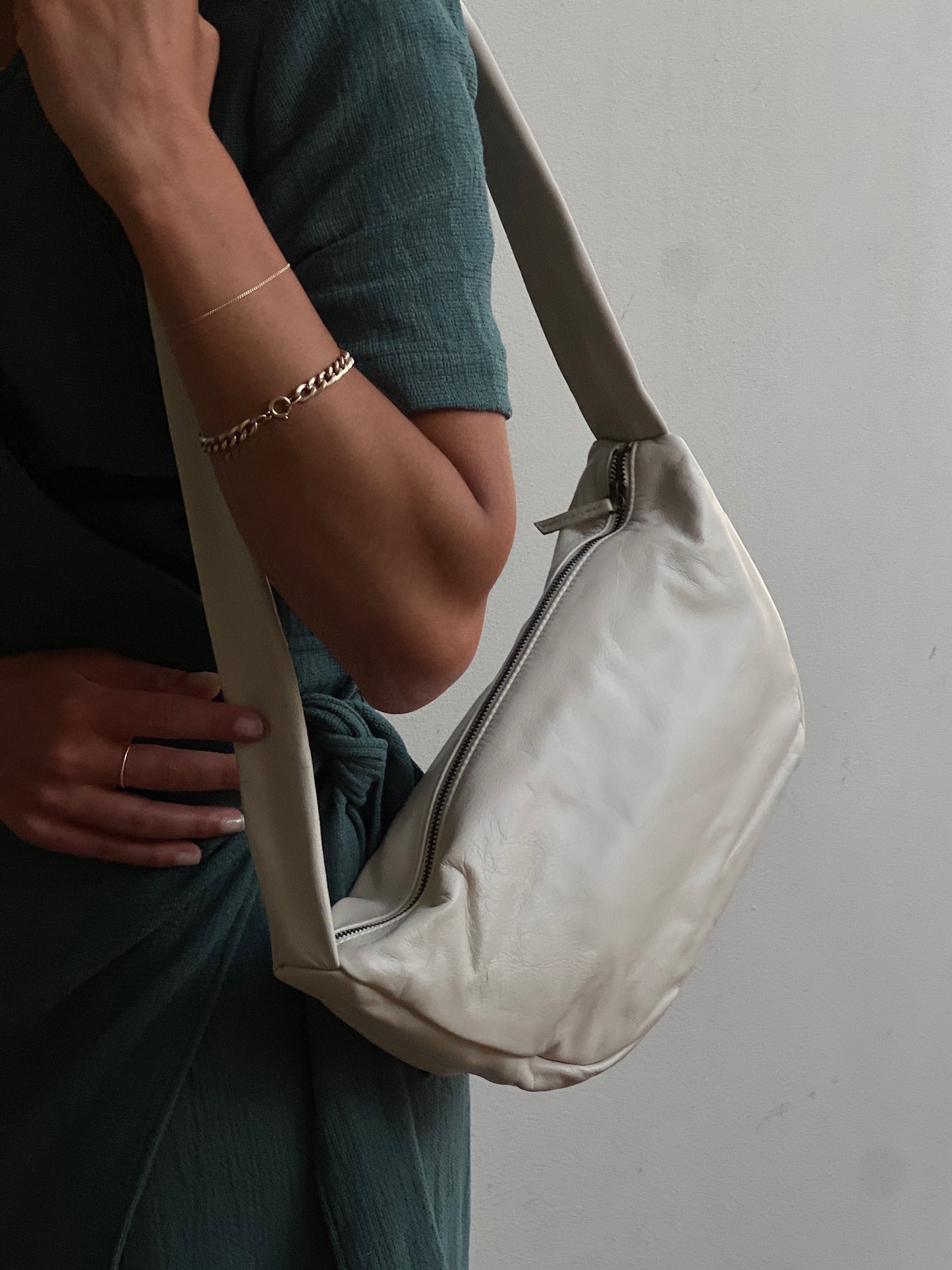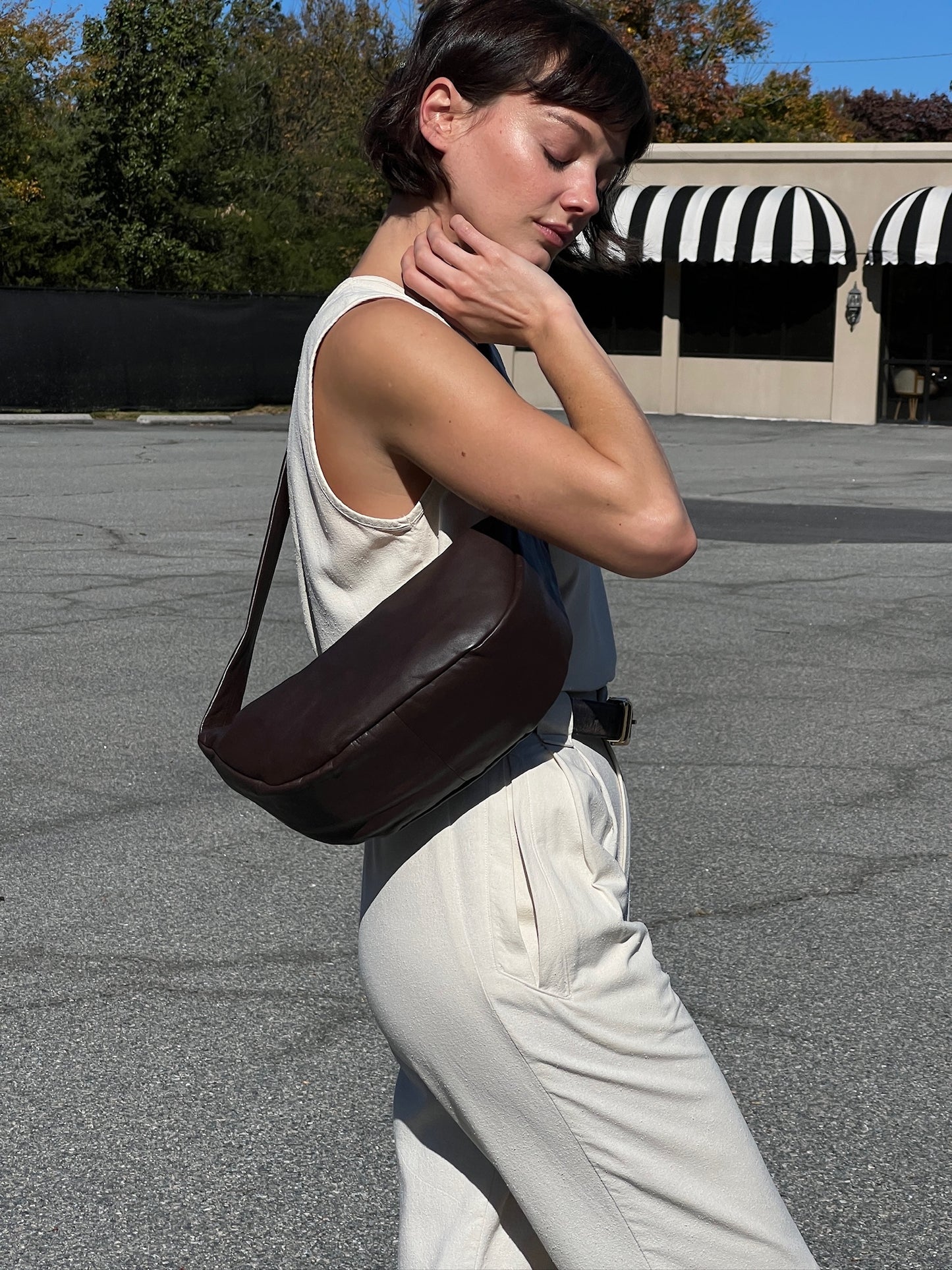 The Soft Crescent Bag from St. Agni is a petite carry-all design and a new season staple for someone on the go. Intended to be worn cross body or over the shoulder for an effortless look, this bag is a staple for any capsule wardrobe. The Soft Crescent Bag features a relaxed structure, a single shoulder strap, seam detailing, and a secured zipper closure. Pair the Soft Crescent Bag with our Stella Waffled Cotton Top and our Bobbie Wrap Skirt in Vintage Wash Modal for a time-honored look.