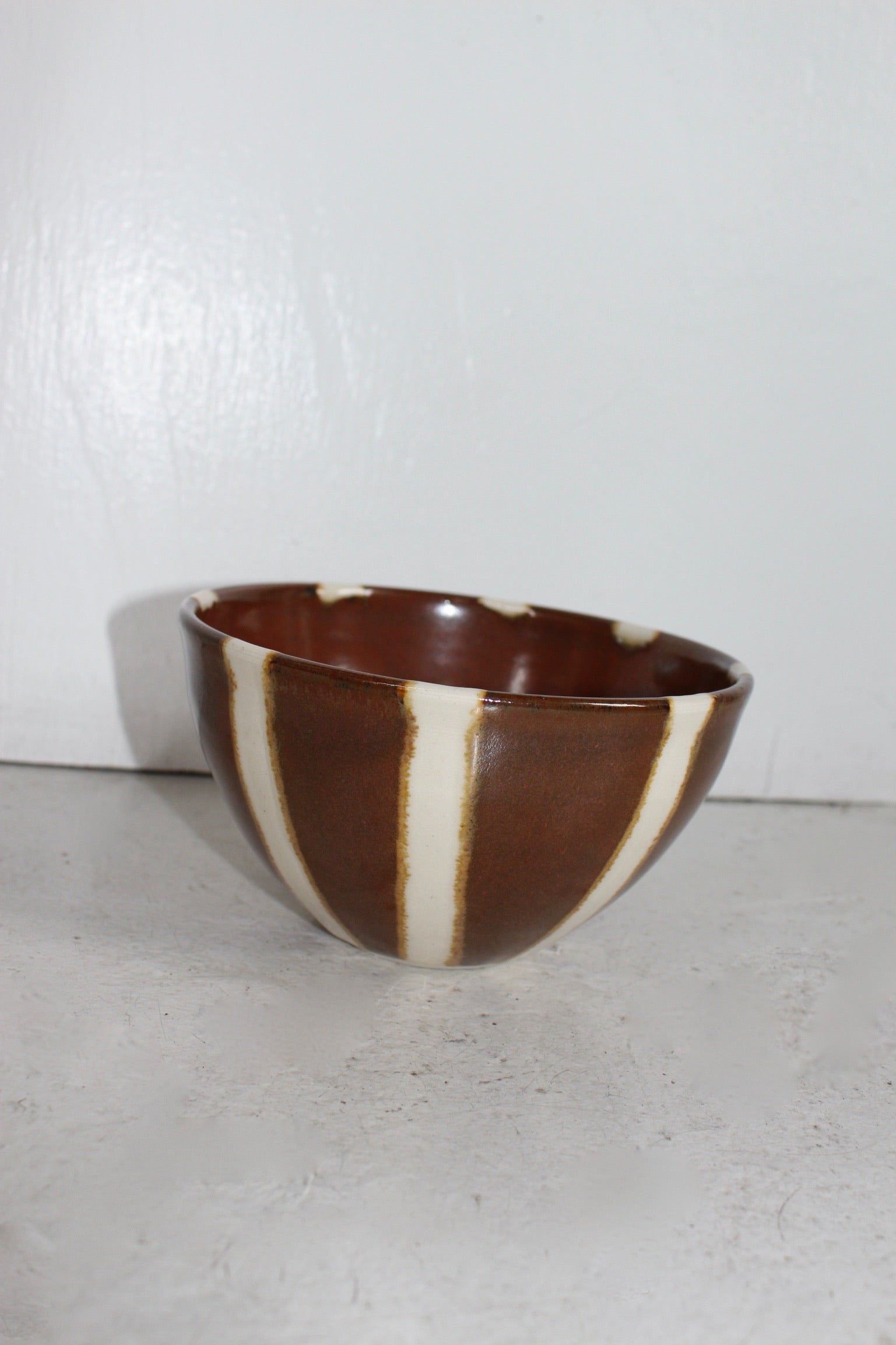The Stripe Bowl, crafted by Emily Wicks, showcases elegant stoneware with a tall rim and a smooth, custom satin stripe glaze. Made for everyday use, this bowl complements any side, soup, or oatmeal with refined style.