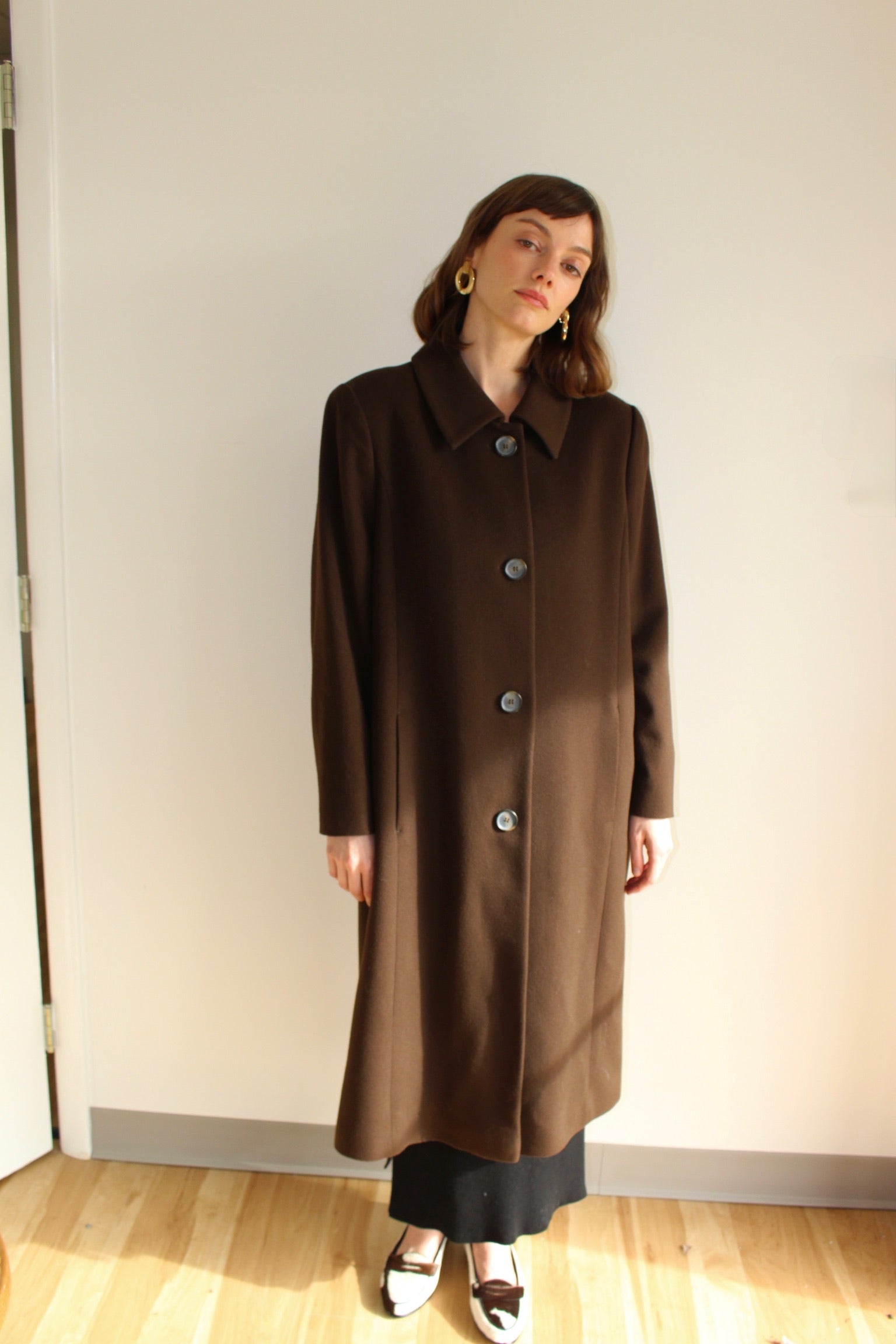 Stunning Escada coat in a covetred wool & cashmere blended fabric. Coat is set in a deep cocoa brown - the perfect winter color! Features buttons up the front, side pockets and a lined interior. A truly elegant & sleek design.