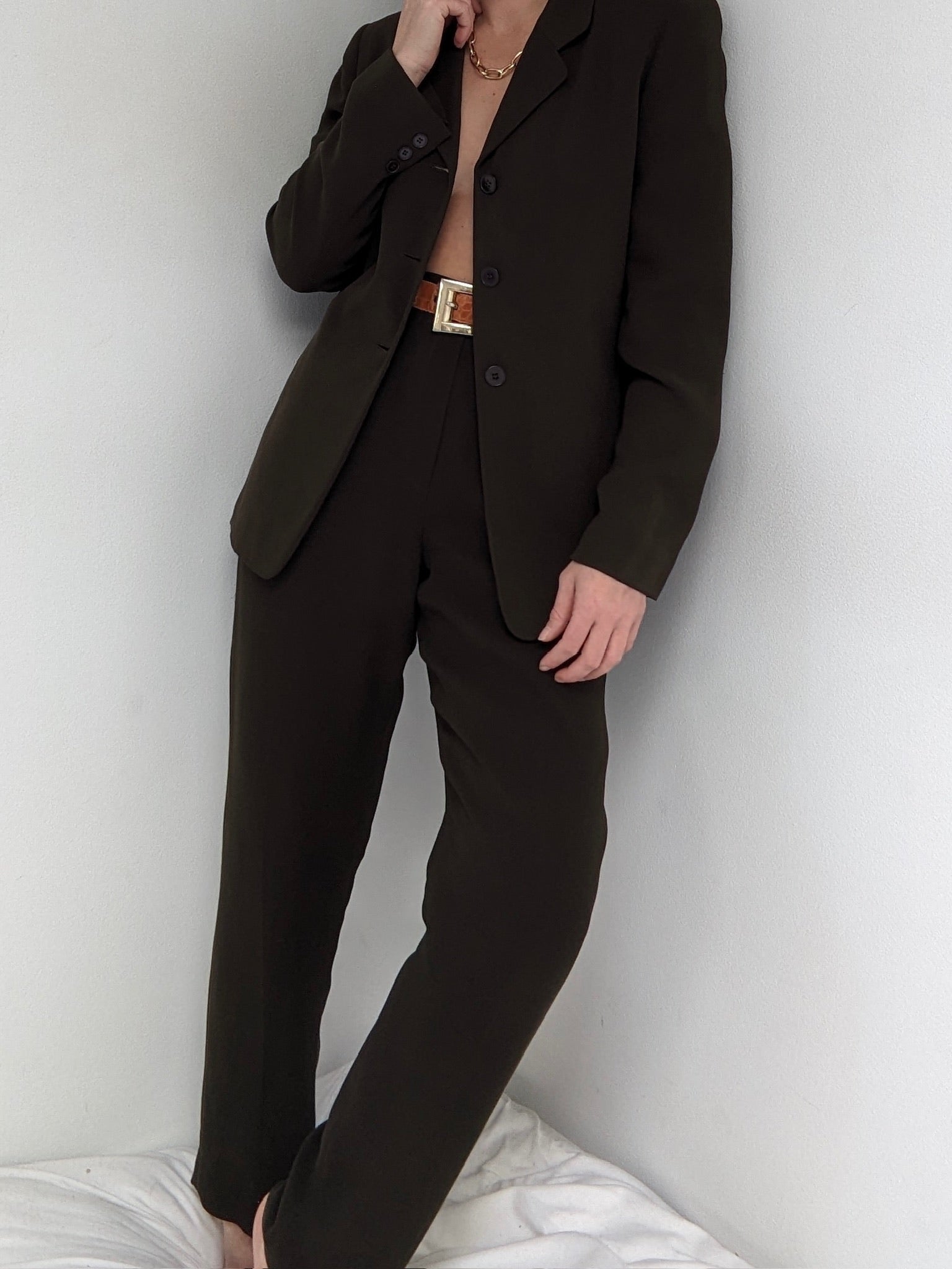Stunning vintage pantsuit in a luxurious silk fabric & deep olive hue. Blazer has a notched collar, front button closures and side slit pockets. Bottoms have a high-rise fit with belt loops, front pleating and side pockets. Both pieces include lined interiors.