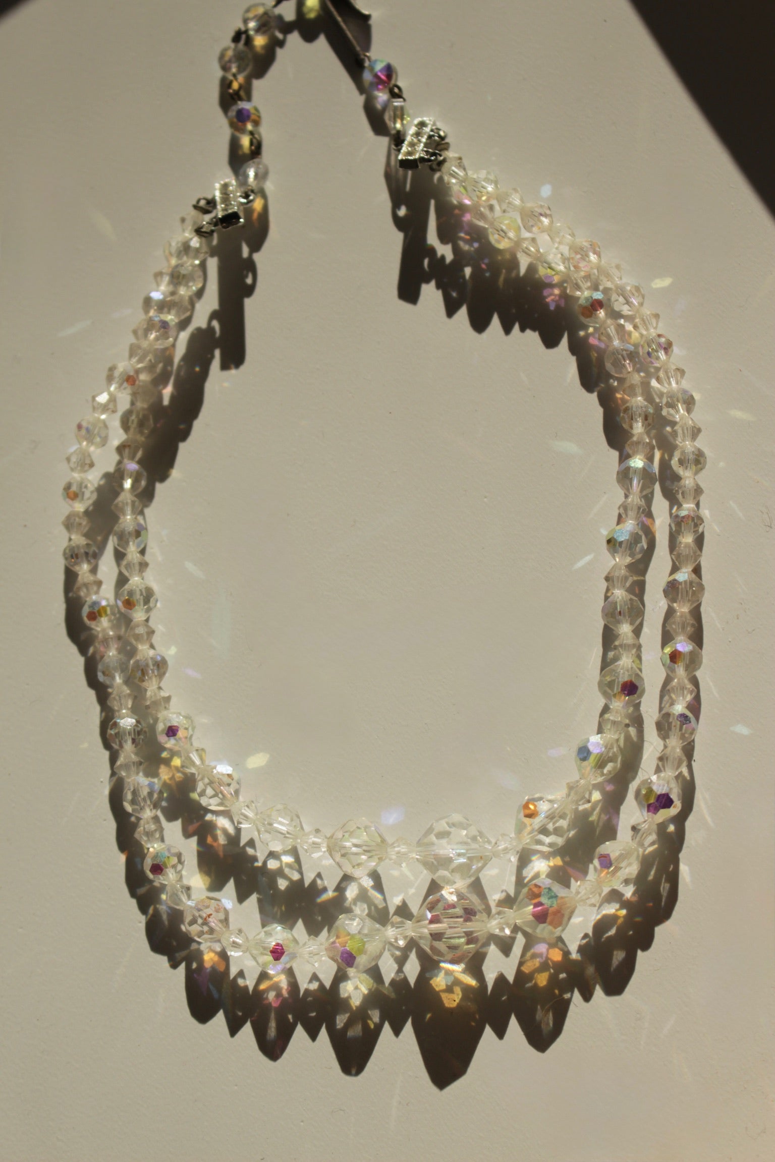 Stunning vintage necklace with faceted, multi-sized glass beads strung throughout layered strands. Necklace has a simple back hook closure and an adjustable fit.