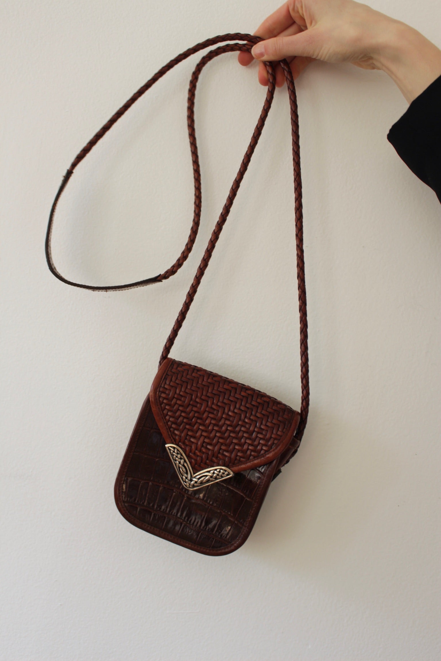 Sweetest vintage purse by Brighton in a petite square shape with a structured design! Bag has a long woven leather strap, matching woven leather flap, silver hardware with magnetic closure and our favorite embossed leather accents.