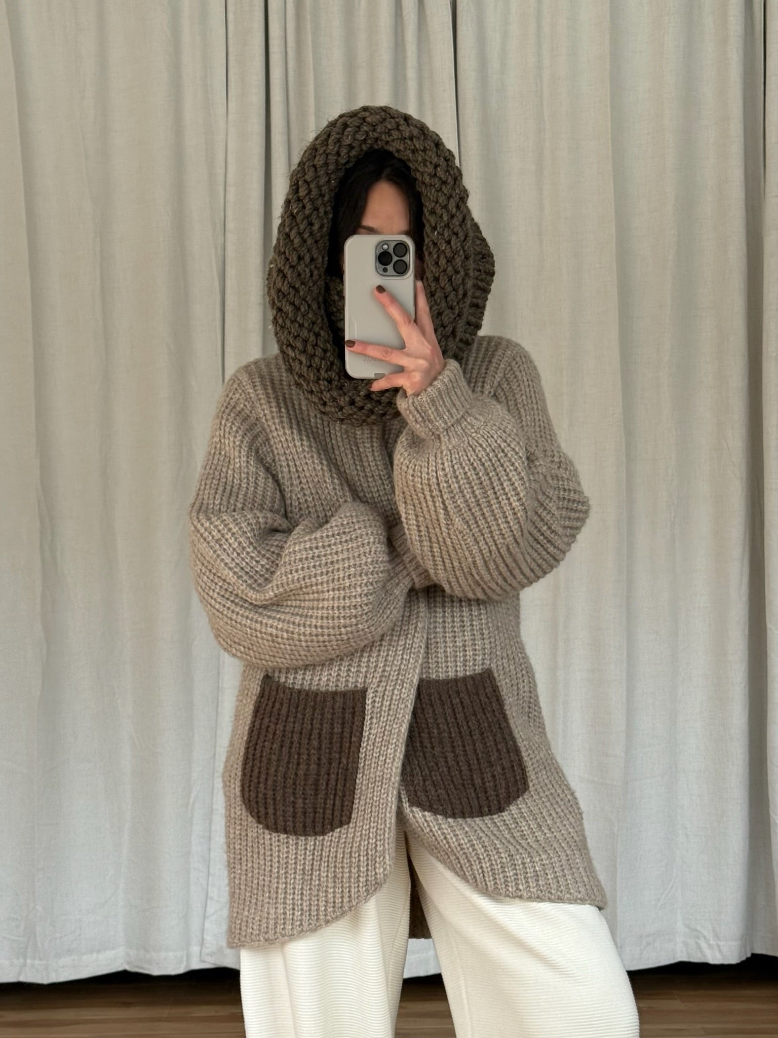Hand-knitted by Rachel, our founder's sister, The Sal Scarf features a voluminous funnel design with macro stitching and substantial loft. Crafted from a warm wool blend, it drapes with generous proportions while delivering genuine warmth. The textured construction adds visual depth—a refined piece that works equally well layered loose or wrapped close.