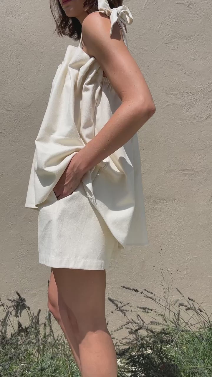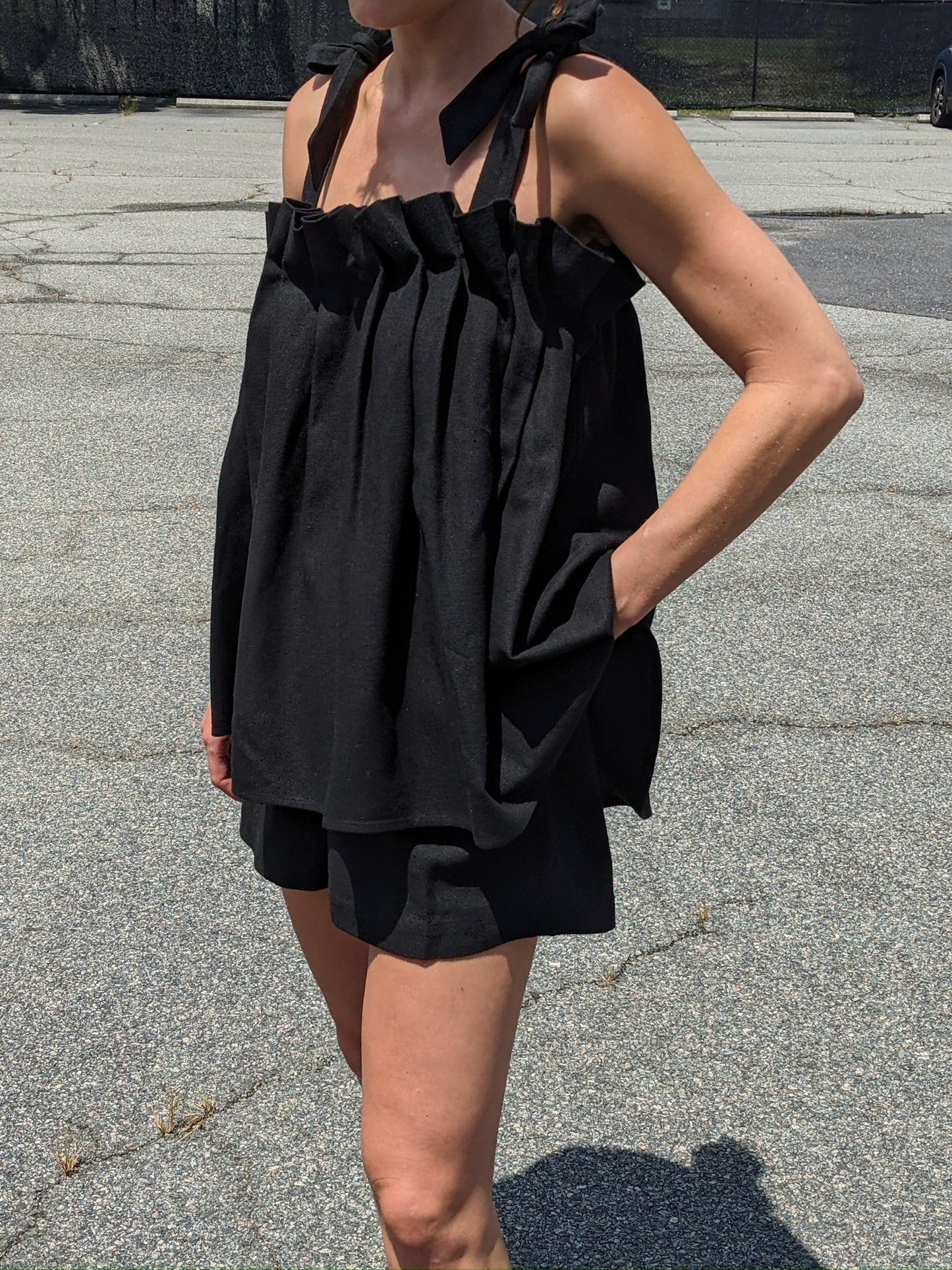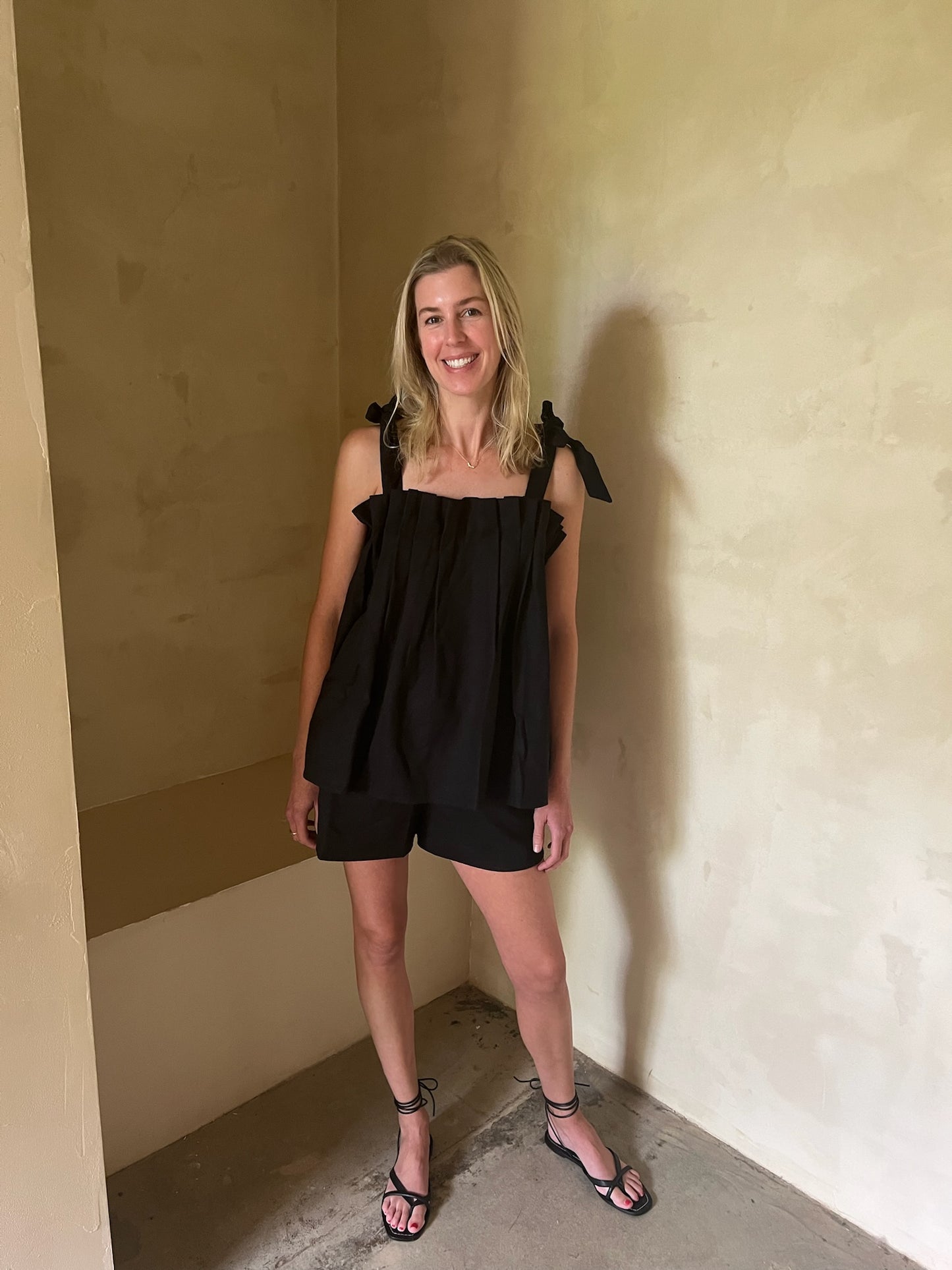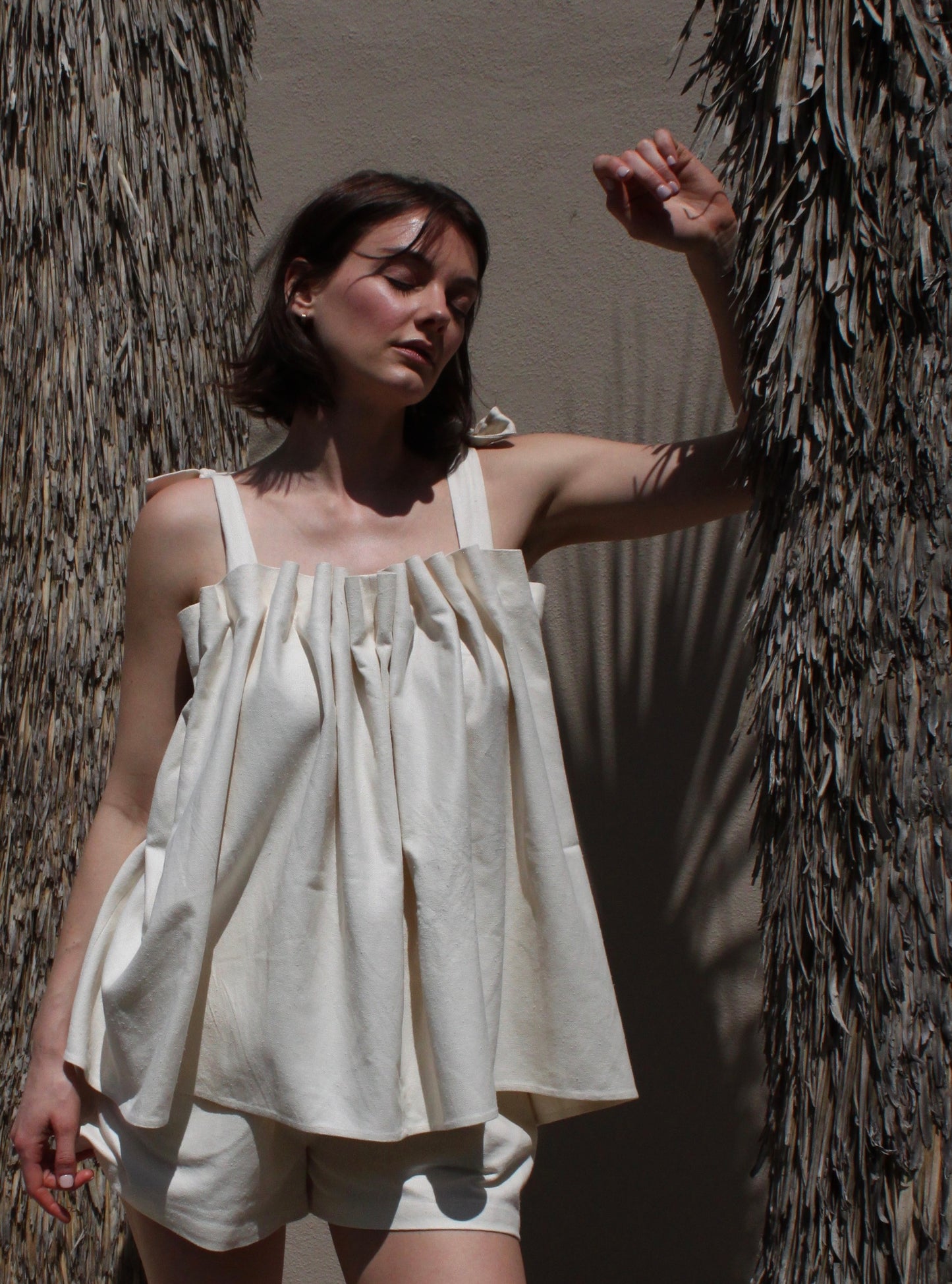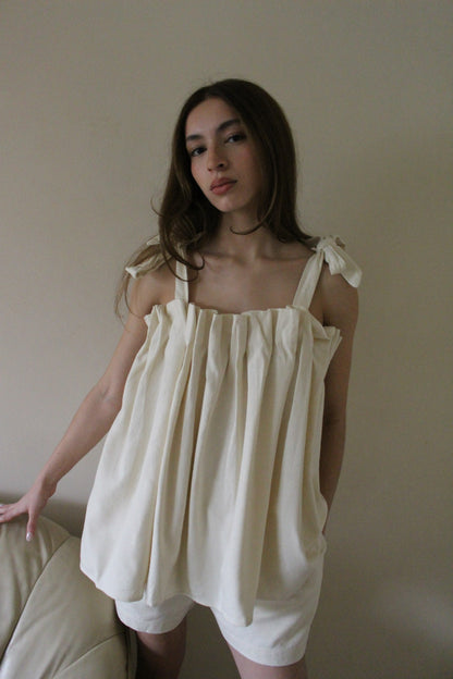 The Toni Woven Silk Top features an air of elegance and whimsy, making it a versatile blouse suitable for any time of year. Its top is adorned with intricate pleat detailing, while the delicate elastic and adjustable straps provide a comfortable fit. Perfect for both formal and relaxed settings, this top pairs seamlessly with the Dimitri Short or Pant, adding effortless style to any outfit.