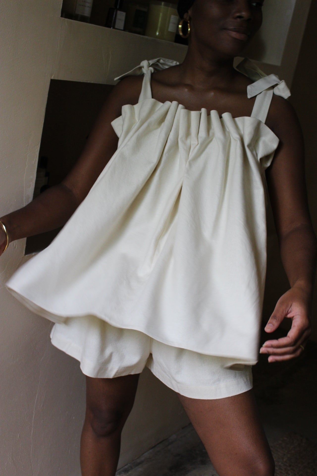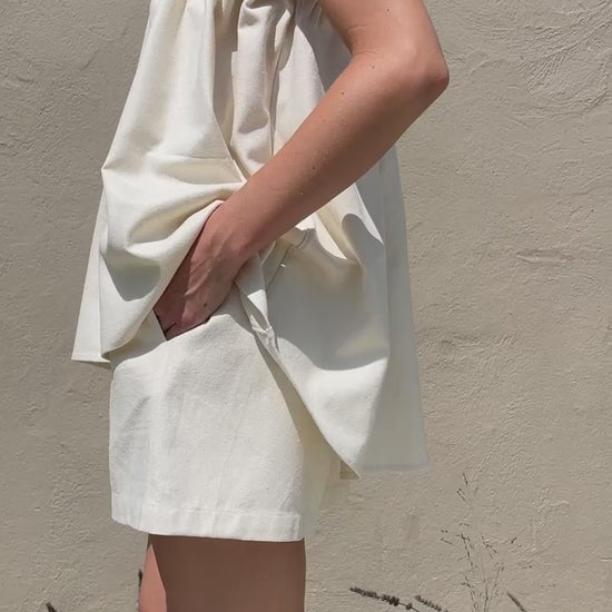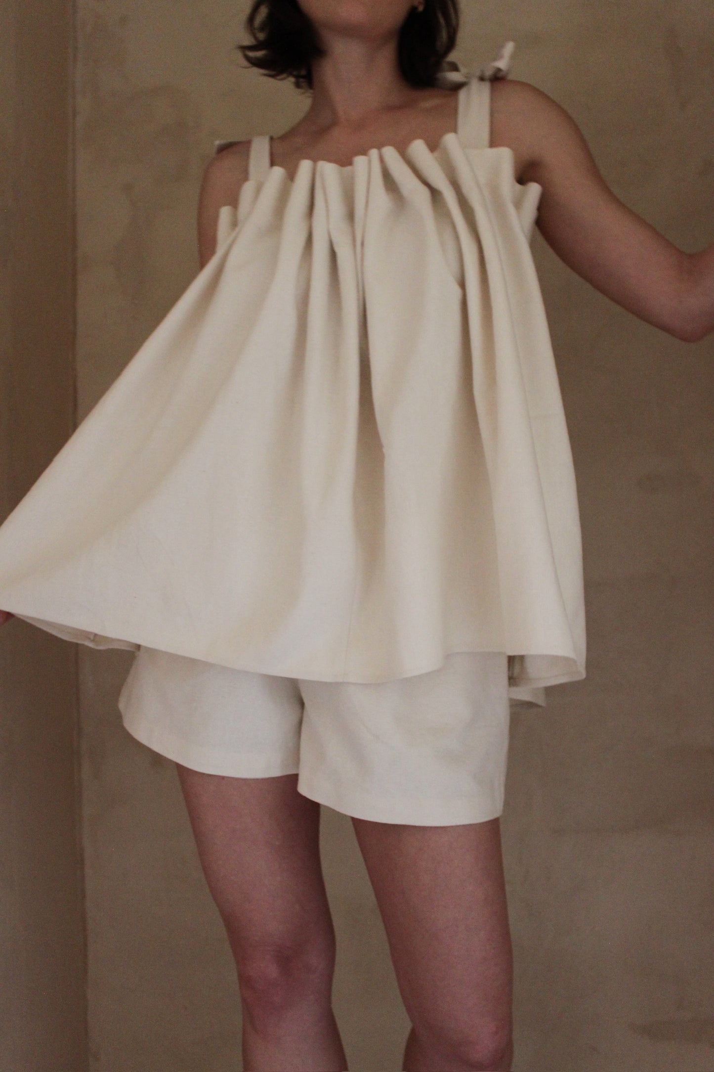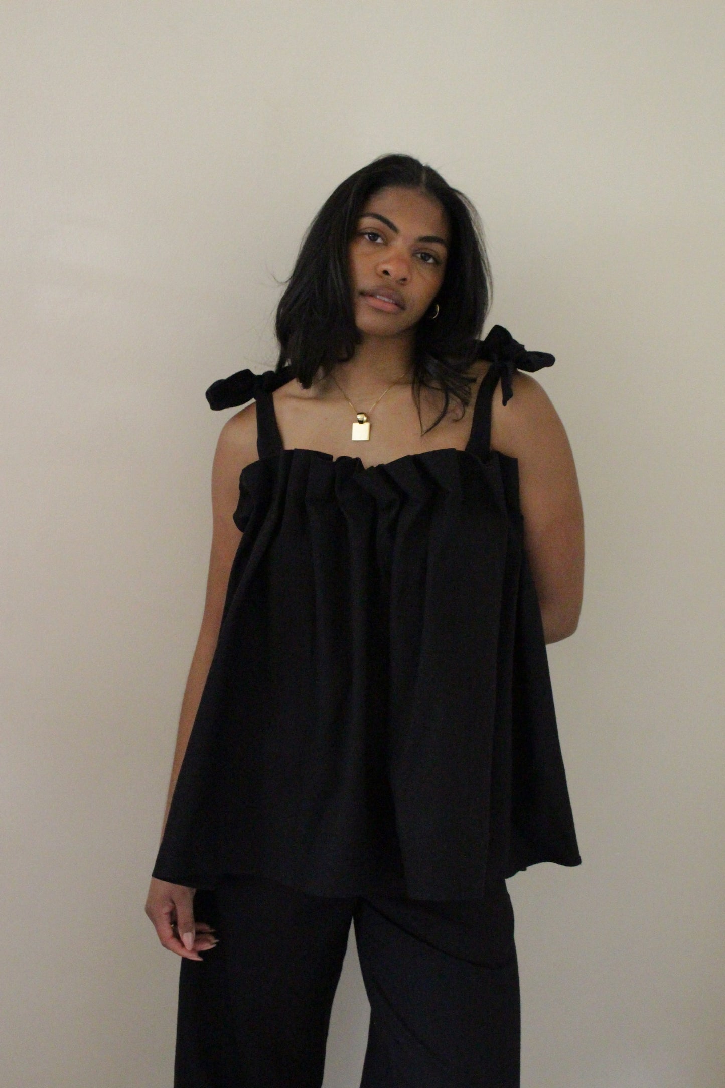 The Toni Woven Silk Top features an air of elegance and whimsy, making it a versatile blouse suitable for any time of year. Its top is adorned with intricate pleat detailing, while the delicate elastic and adjustable straps provide a comfortable fit. Perfect for both formal and relaxed settings, this top pairs seamlessly with the Dimitri Short or Pant, adding effortless style to any outfit.