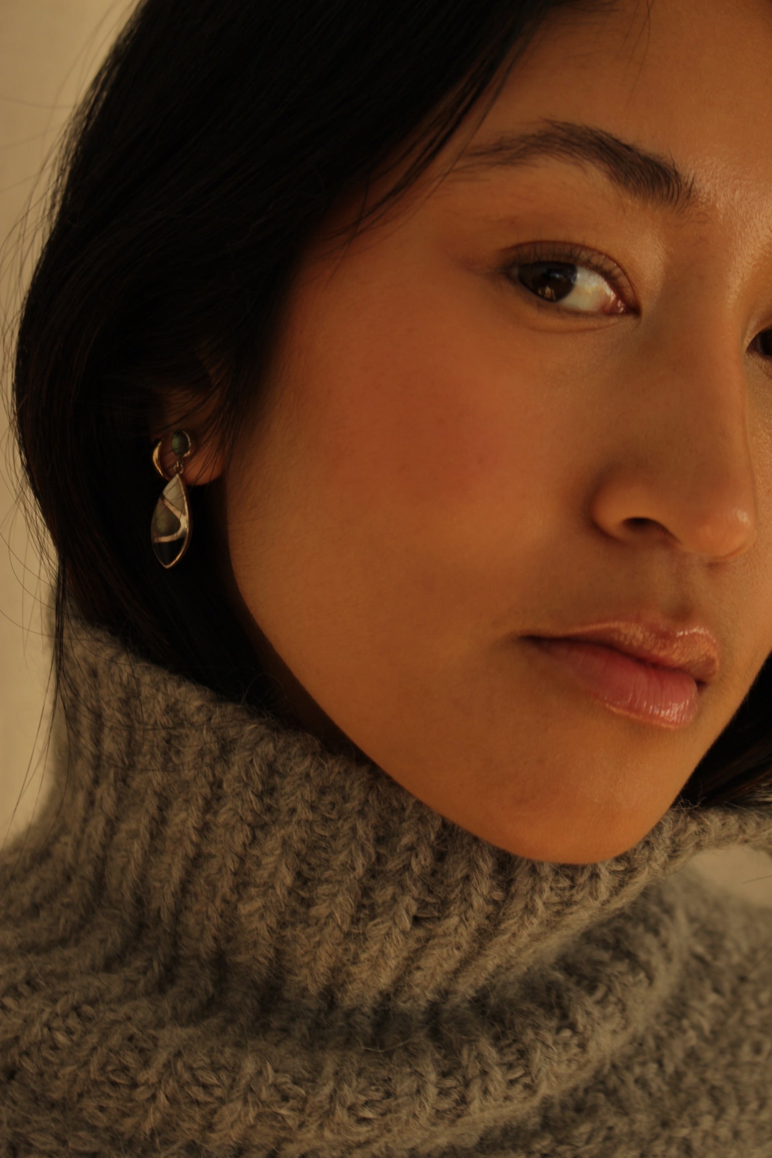 Loveliest vintage earrings featuring a tear-dropped sterling silver pendant with inlaid onyx & mother of pearl. Earrings have post backings and a beautiful iridescent sheen.
