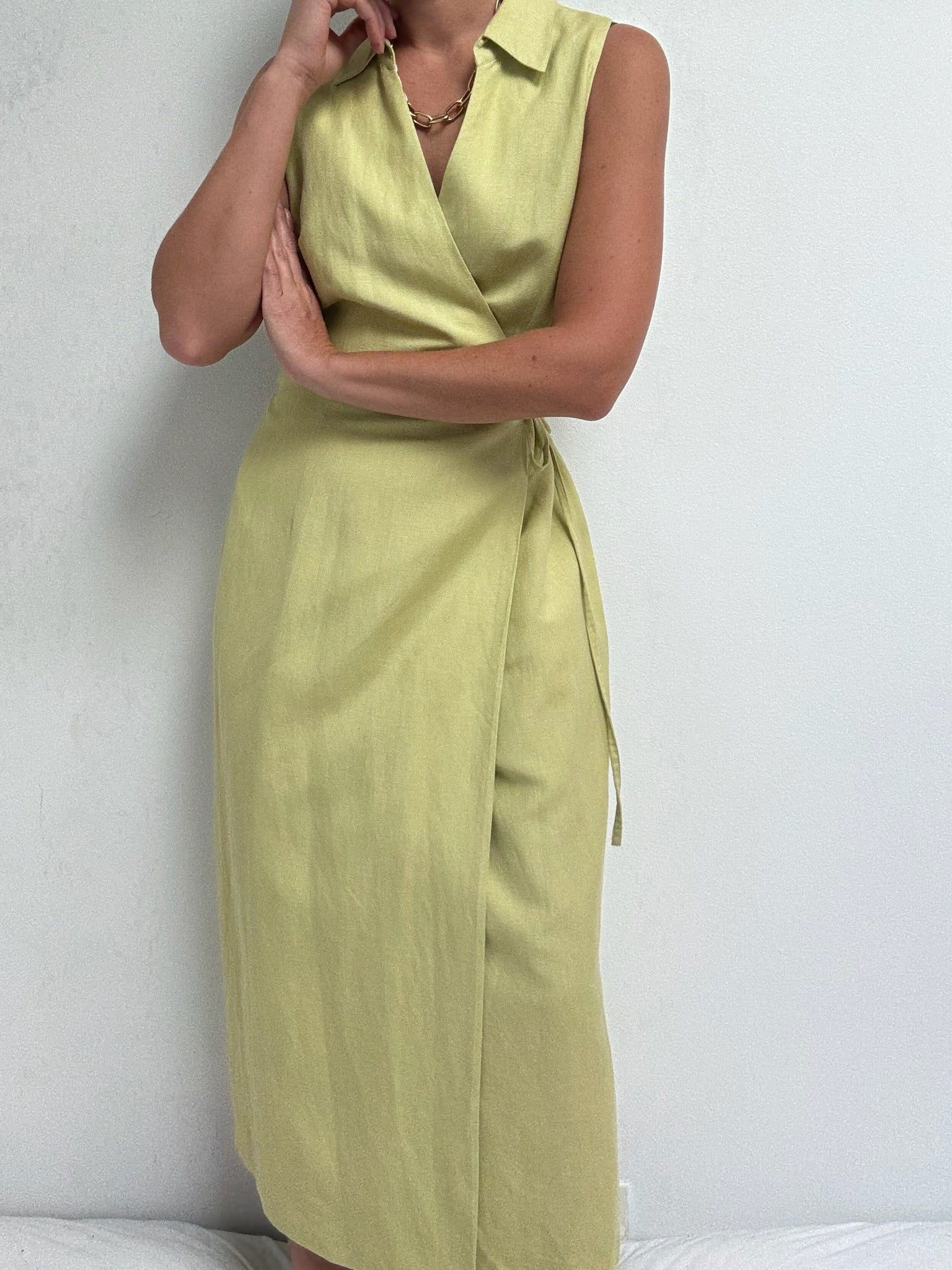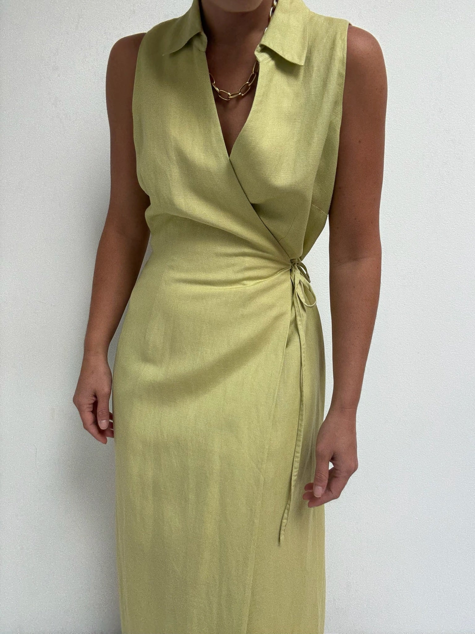 Beautiful vintage dress in a pale avocado green & a tightly woven linen fabric. Dress has a sleeveless, wrap design with collared neckline and long fit. Includes an inner lining for added comfort.