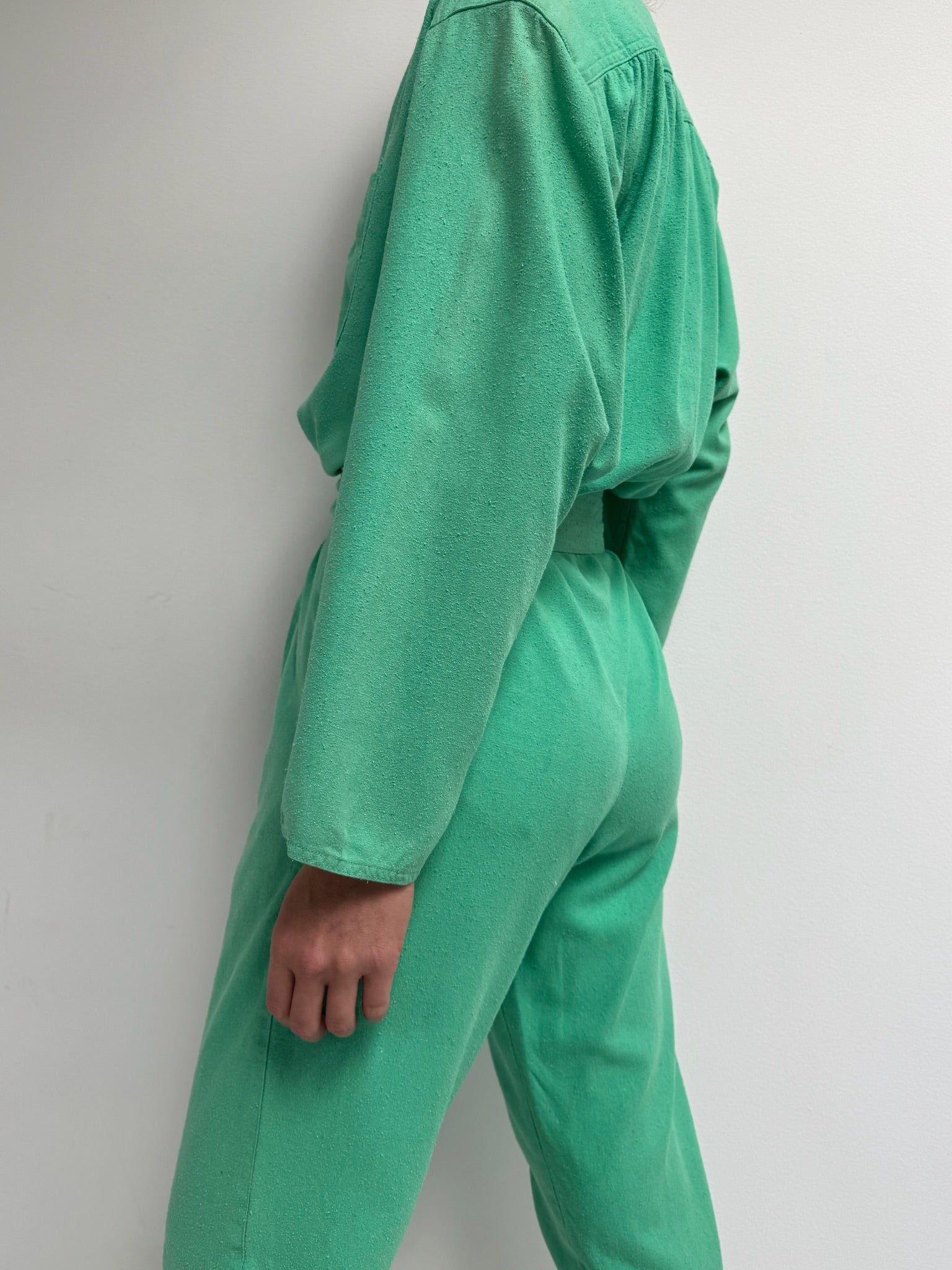 Brightest jade green jumpsuit in our absolute favorite textured raw silk fabric. Jumpsuit has an amazing belted design with a v-cut neckline, buttons at the upper, a single chest pocket and side pockets.