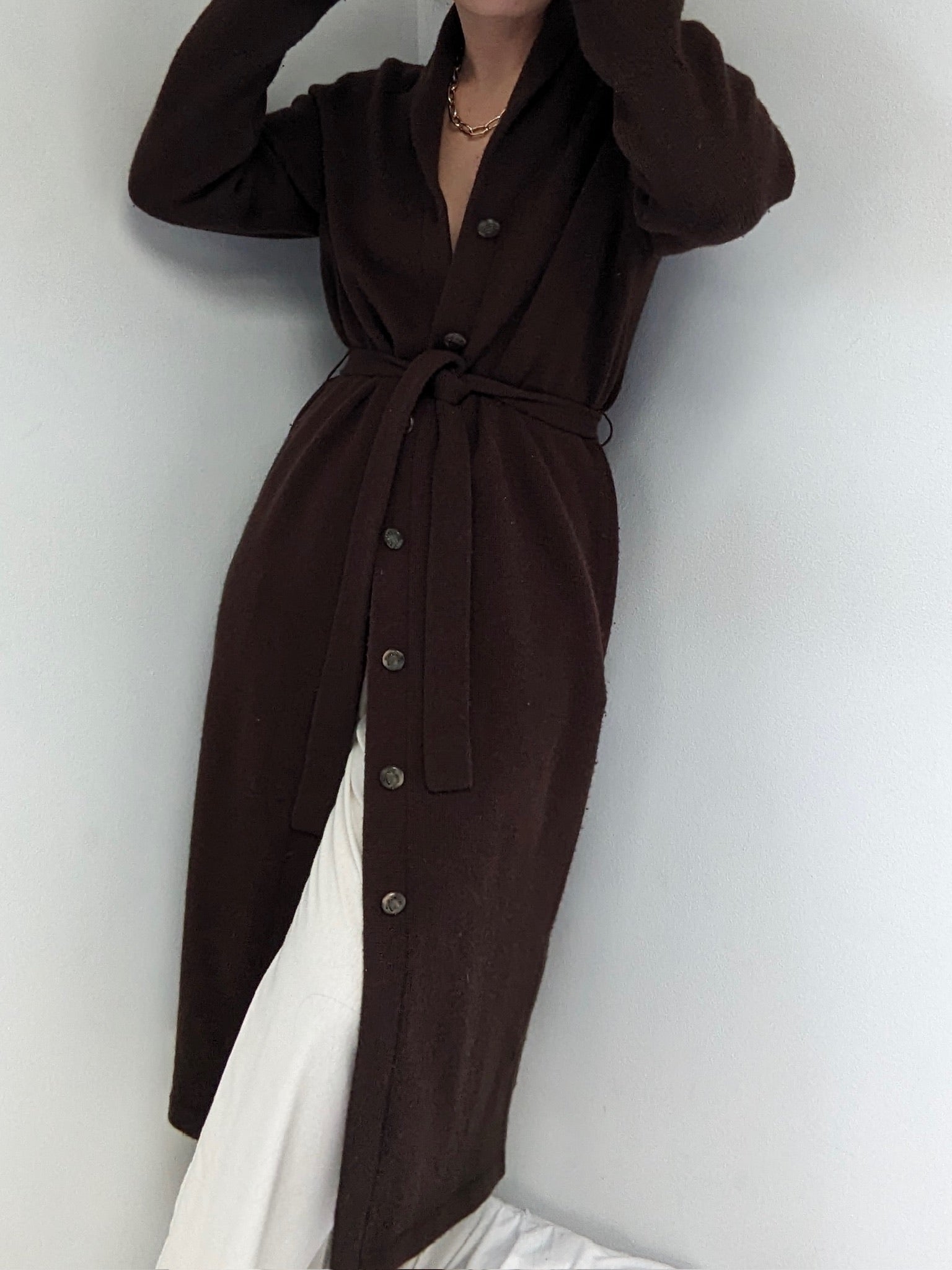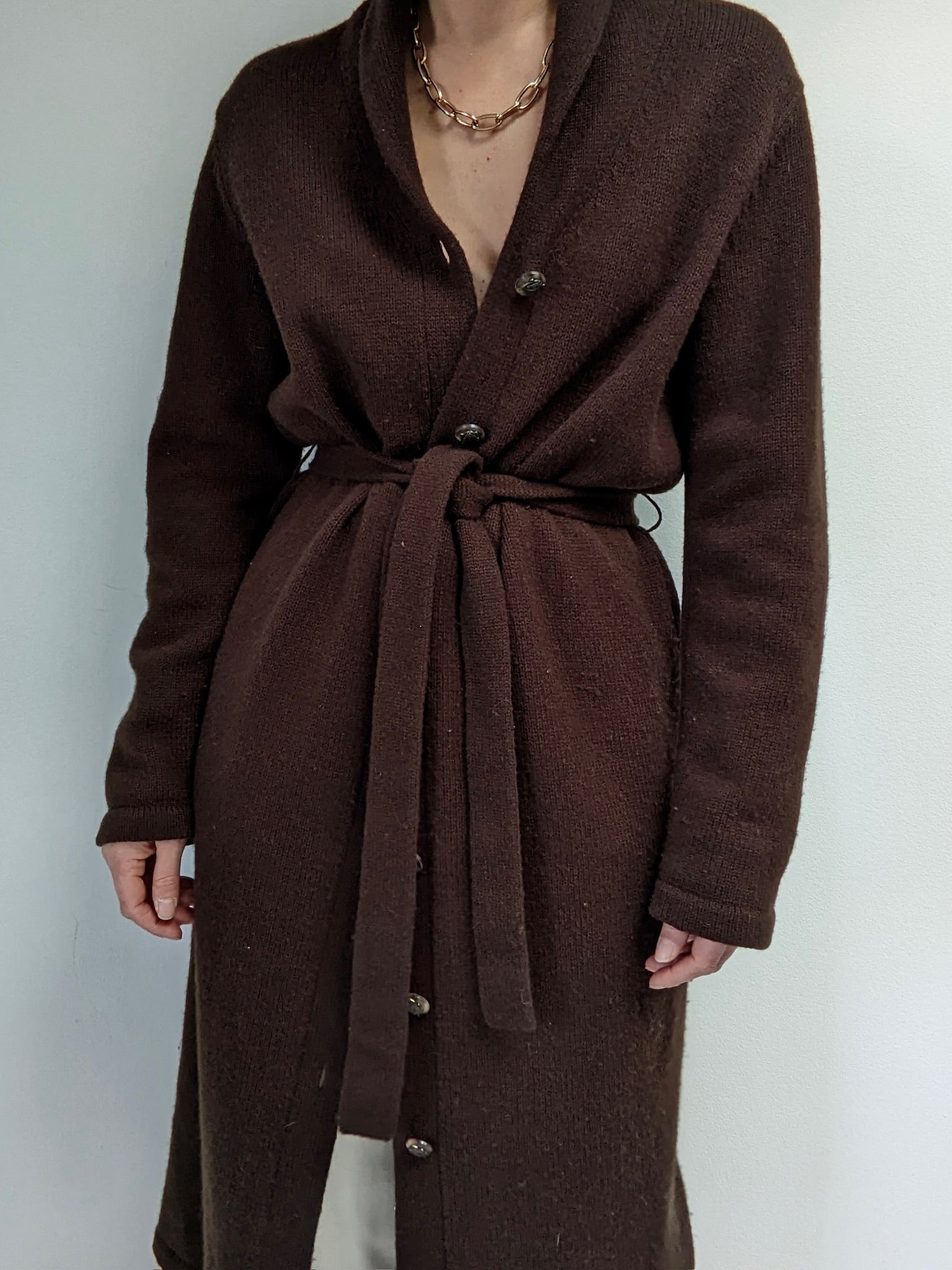 Stunning vintage Ralph Lauren knit coat in a deep cocoa brown color & plush knitted lambswool. Features a long, cozy drape with buttons up the front, a shawl-collared neckline and a matching tie belt for the waist.