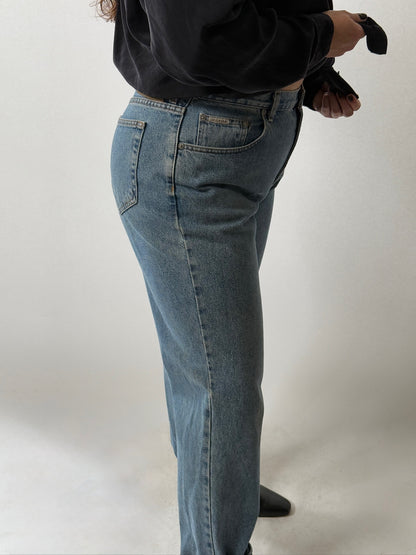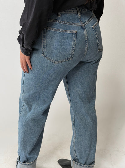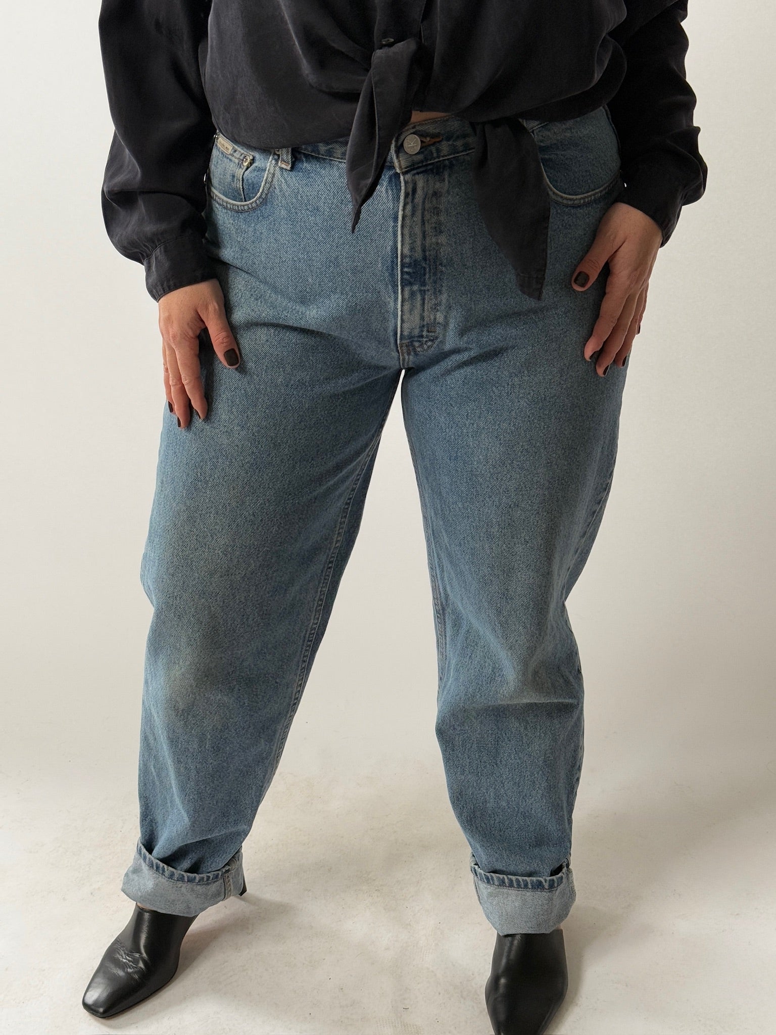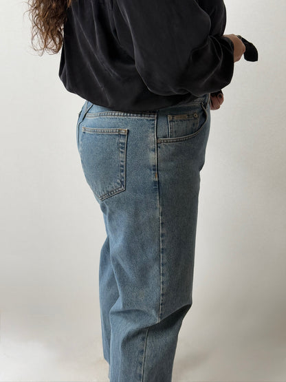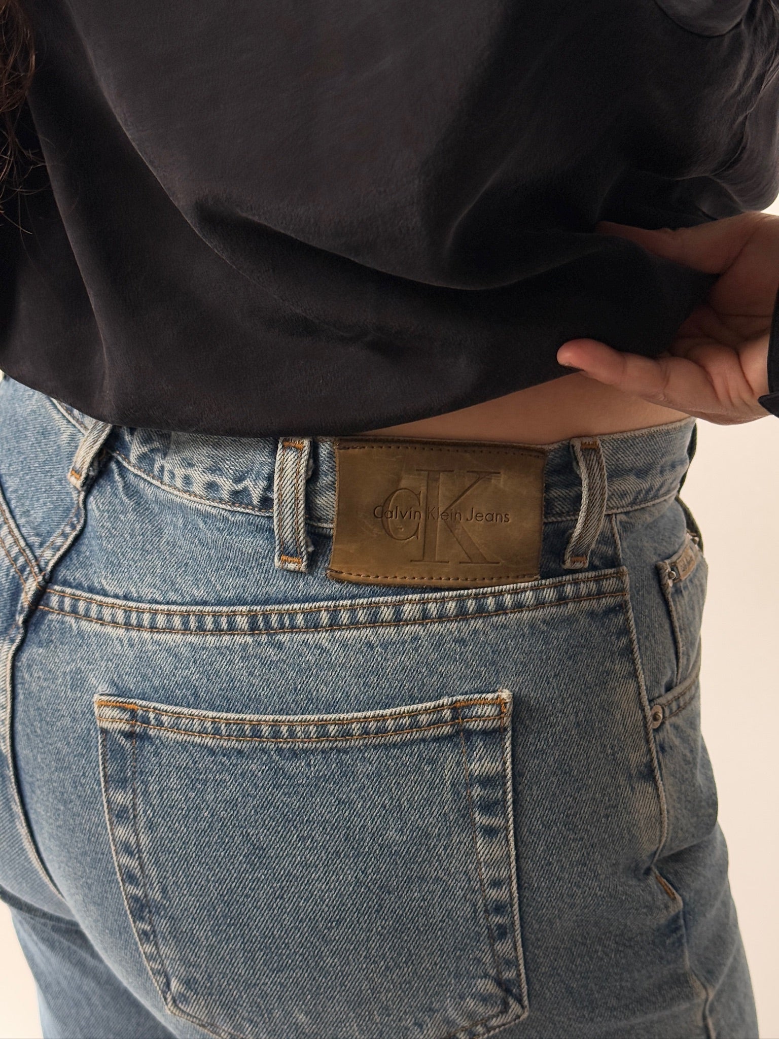 Lovely easy fit style Calvin Klein denim with a 5 pocket design. The denim has a tapered leg with a classic leather CK patch at the back waistband, tapered leg and silver toned hardware.