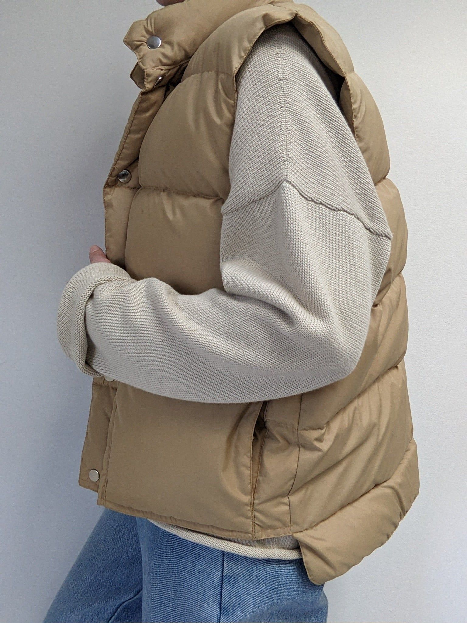 Camel puffer vest with a cozy down fill. Vest has both a zipper & snap buttons up the front, four front pockets and a box fit.