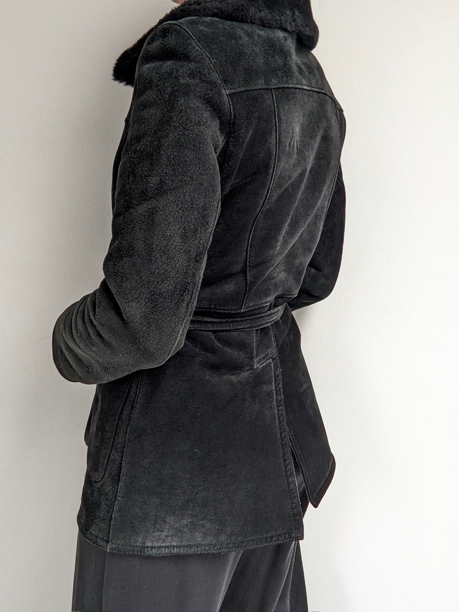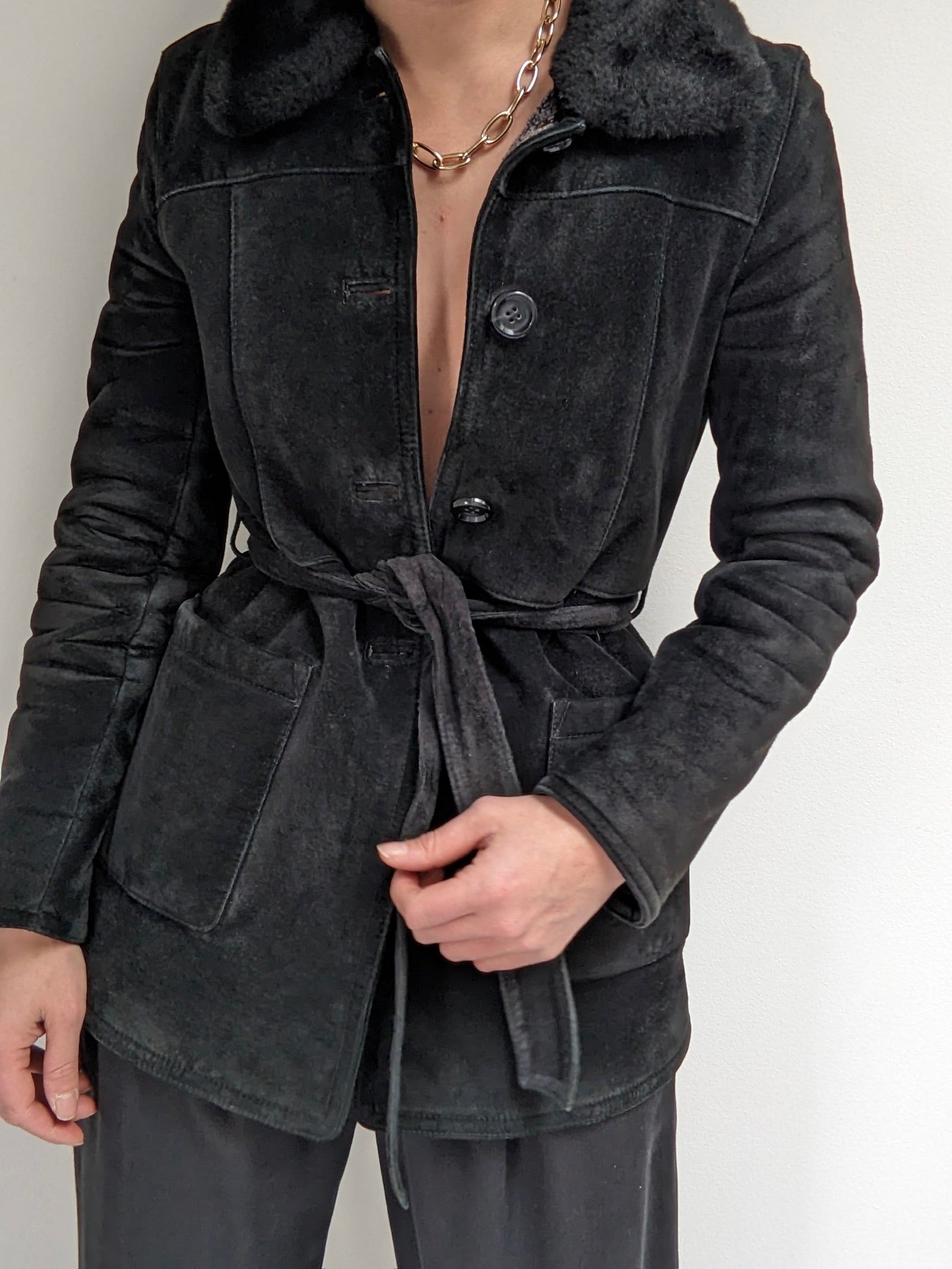Caviar black jacket in a smooth sueded leather. Jacket has a faux fur collar, a cozy sherpa lining, buttons up the front, patch pockets and a matching tie belt for the waist.