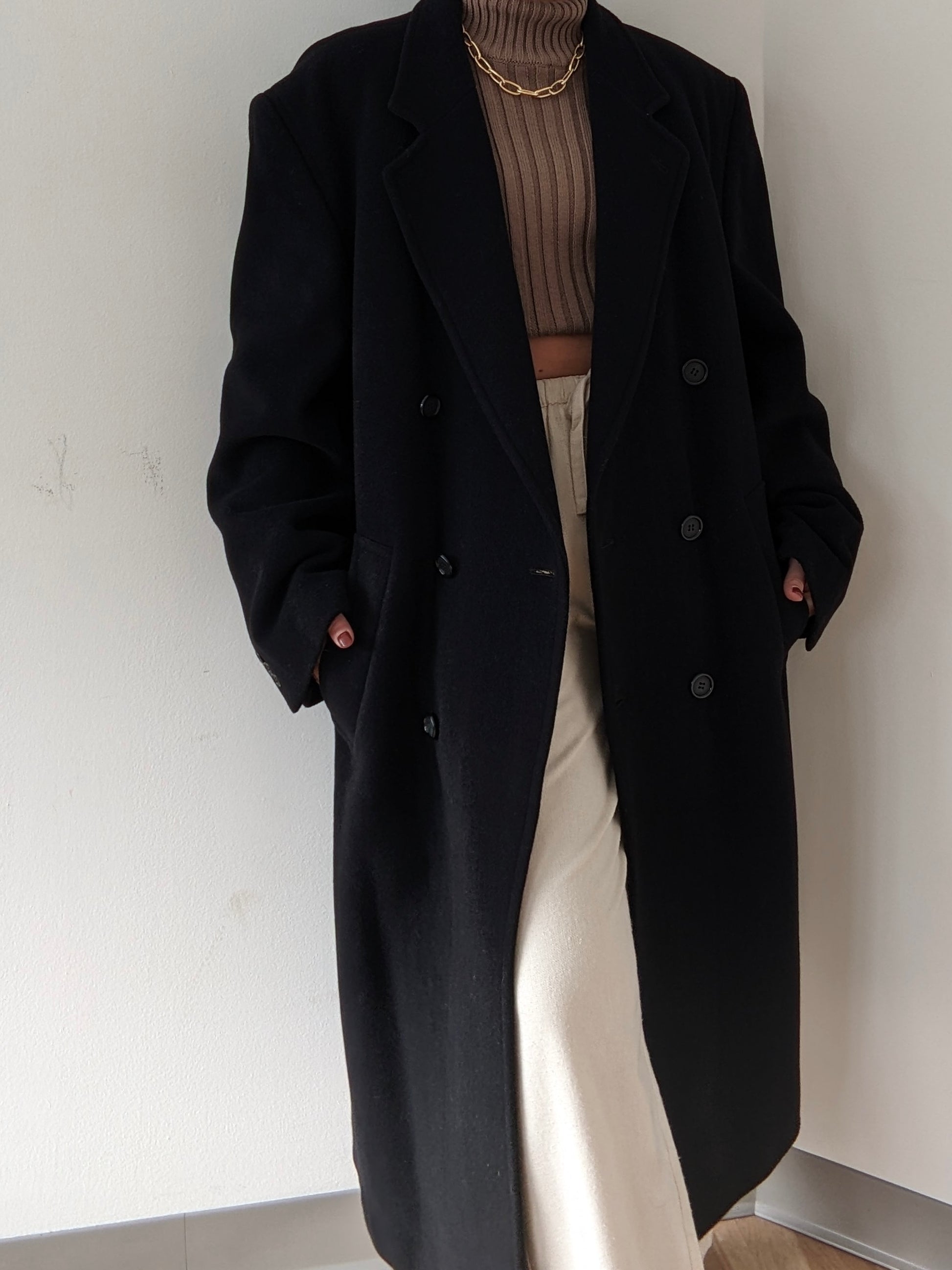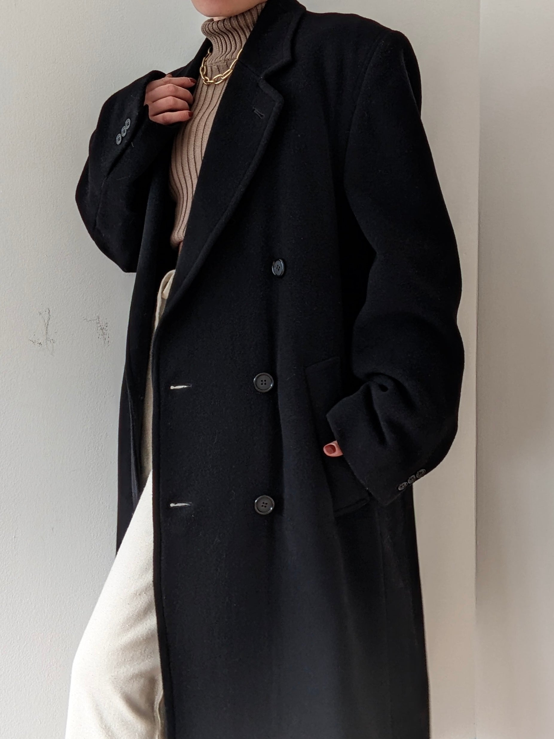 Coziest vintage coat in a dark caviar tone and luxurious, cashmere blended fabric! Coat has a long drape with double-breasted front button closures, a notched collar and a lined interior for added warmth & comfort. Features deep side pockets and three hidden inner pockets.