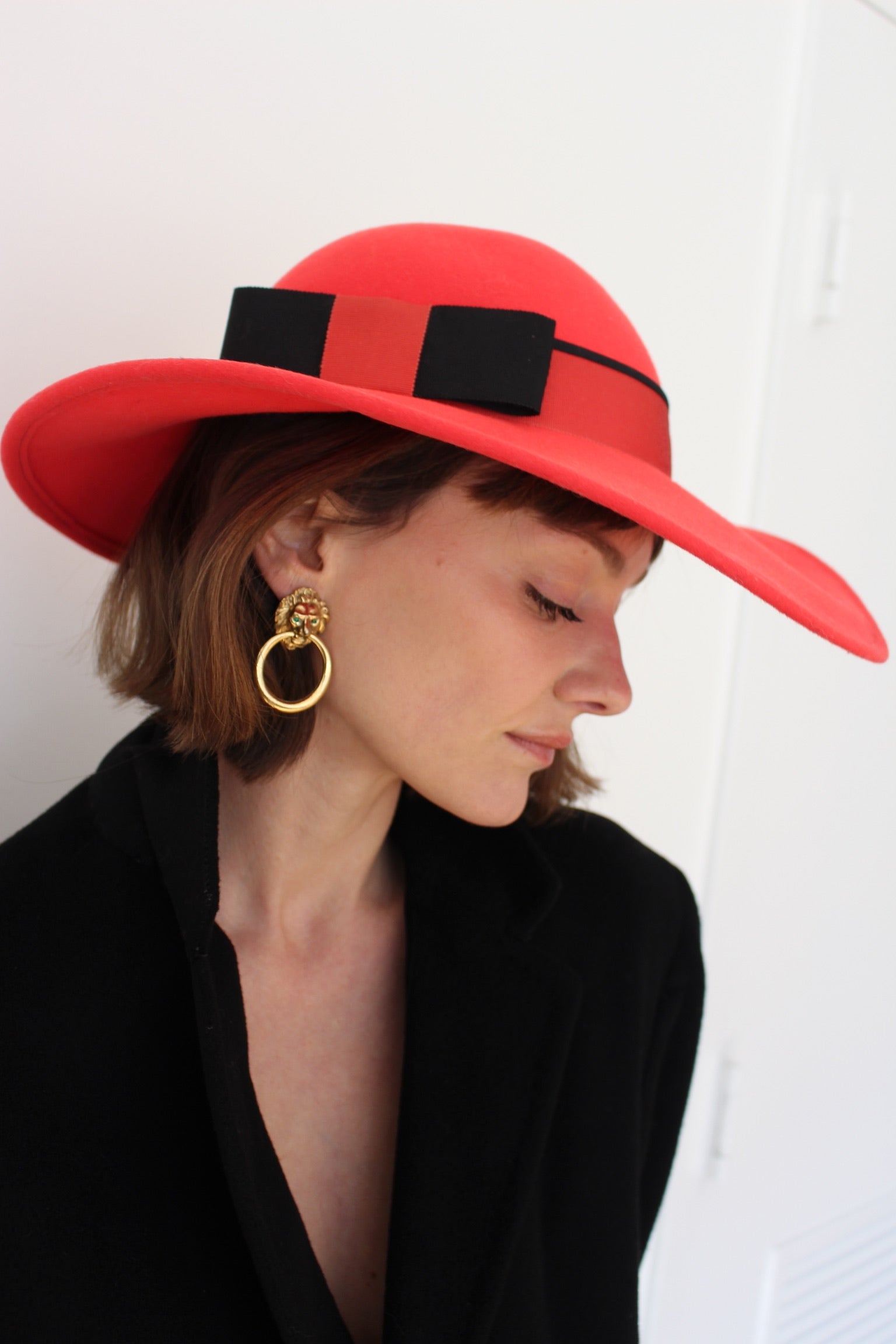 Stunning bright red felt wool hat with a lovely rounded hat and wide statement brim. The hat has a gross grain bow at the base in both a red and black.