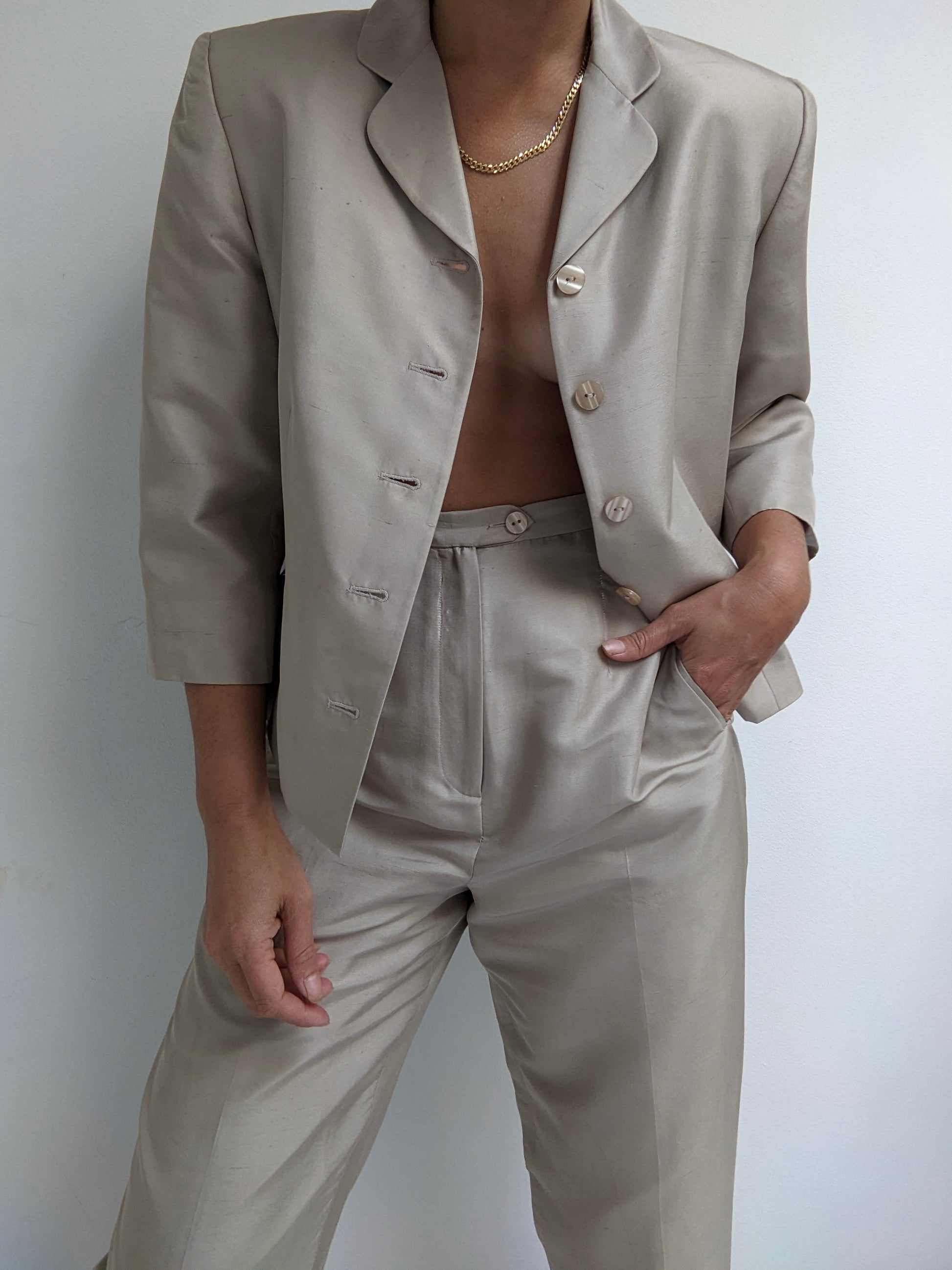 Lightweight, brushed silk pant set in a champagne tone. Top is a cropped jacket with cropped sleeves, buttons up the front and a notched collar. Bottoms have a high-rise / tapered leg design with side pockets.