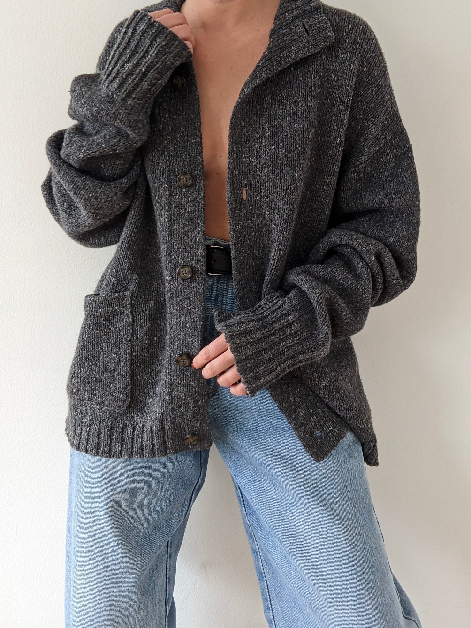 Dark charcoal grey cardigan in the softest knitted wool fabric - made of luxurious Italian tweed yarn. Cardigan has a collared neckline, large tortoise buttons up the front, pockets at the lower & thick ribbing along the ends.