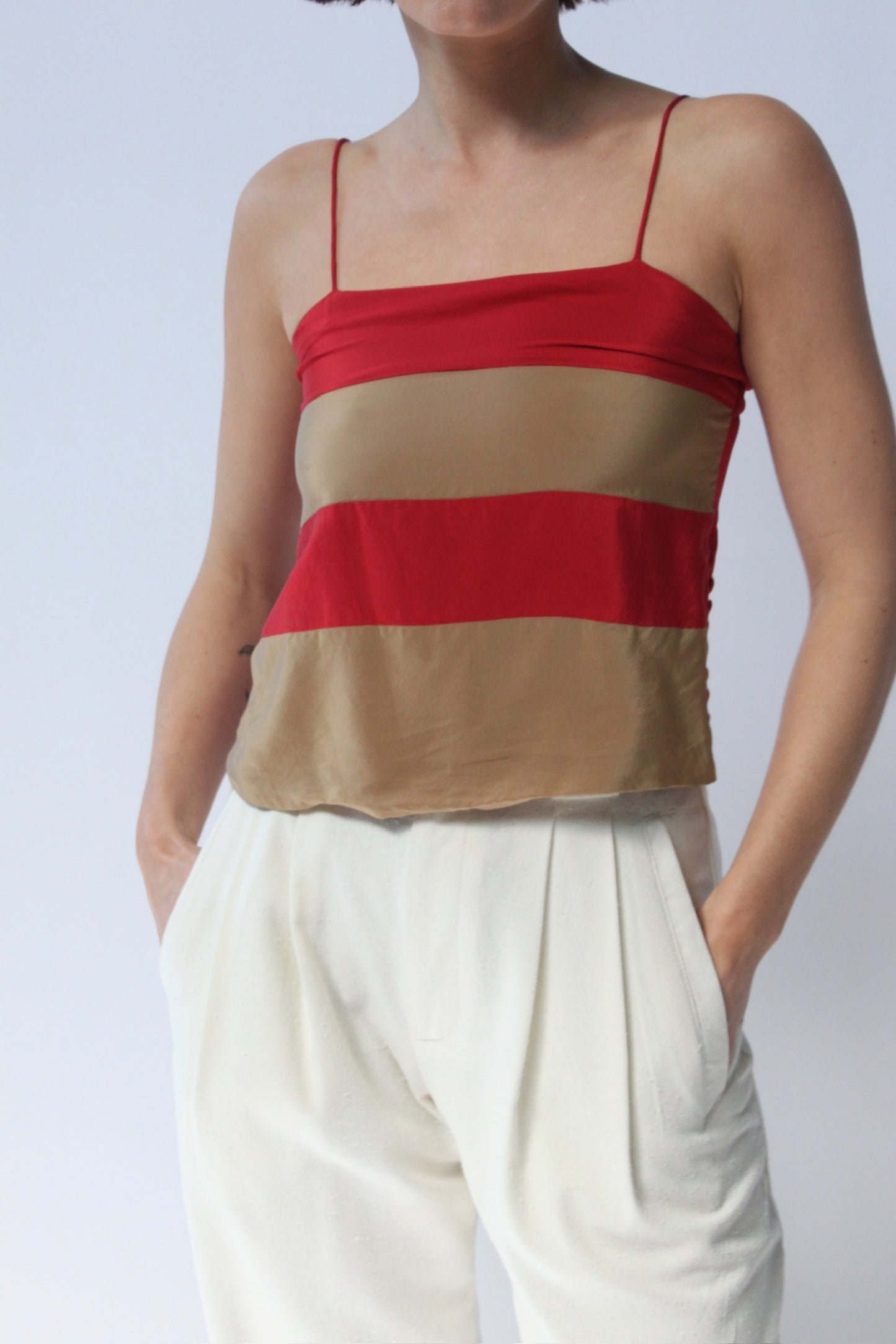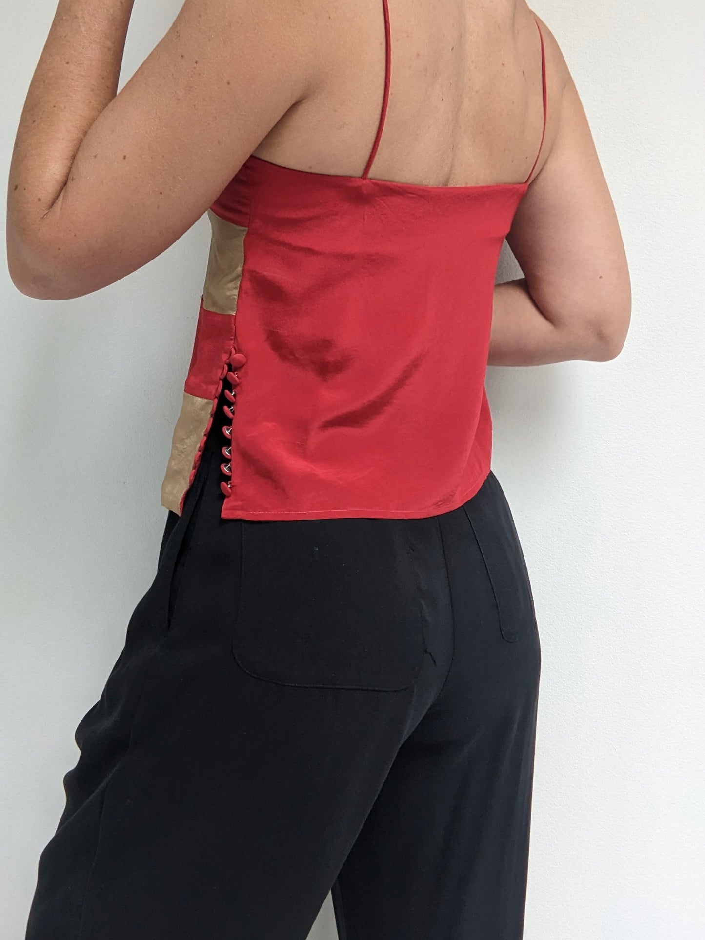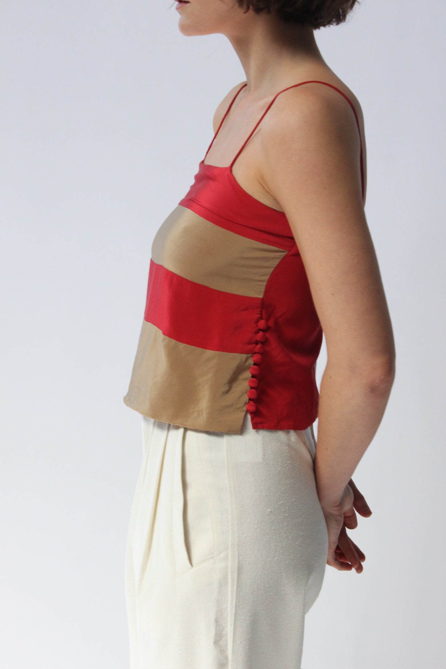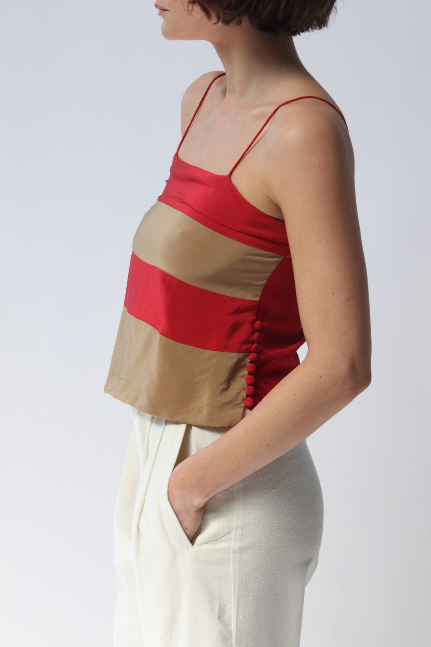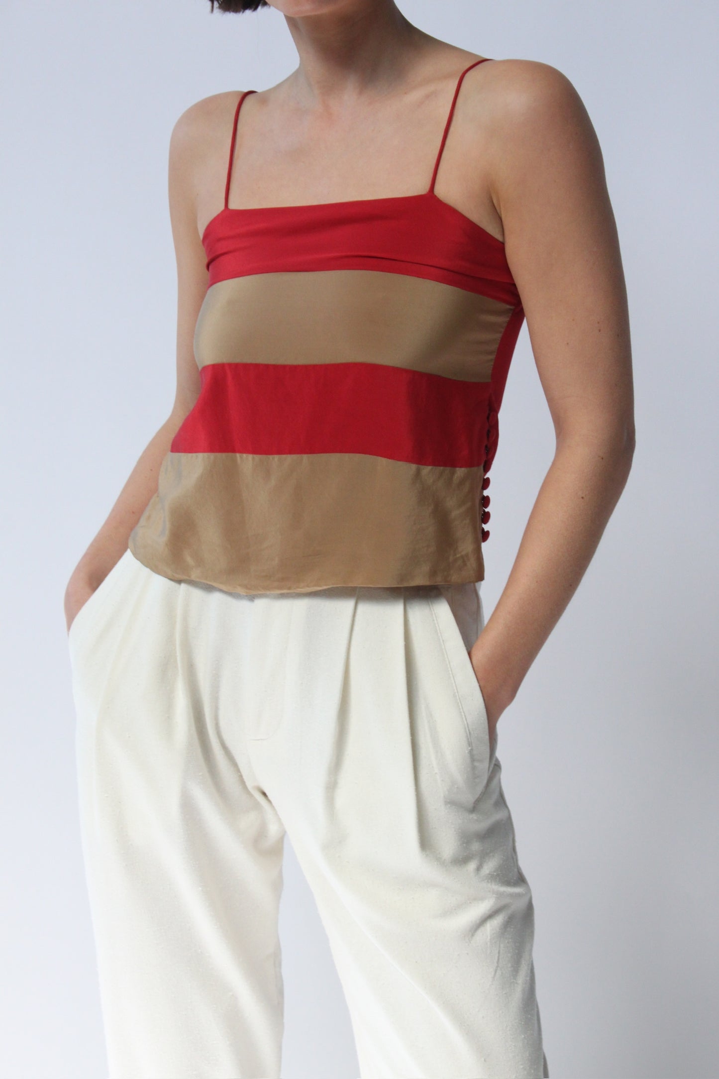 Favorite cherry and taupe silk camisole with button closures at the side, a delicate shoulder strap and cropped design.