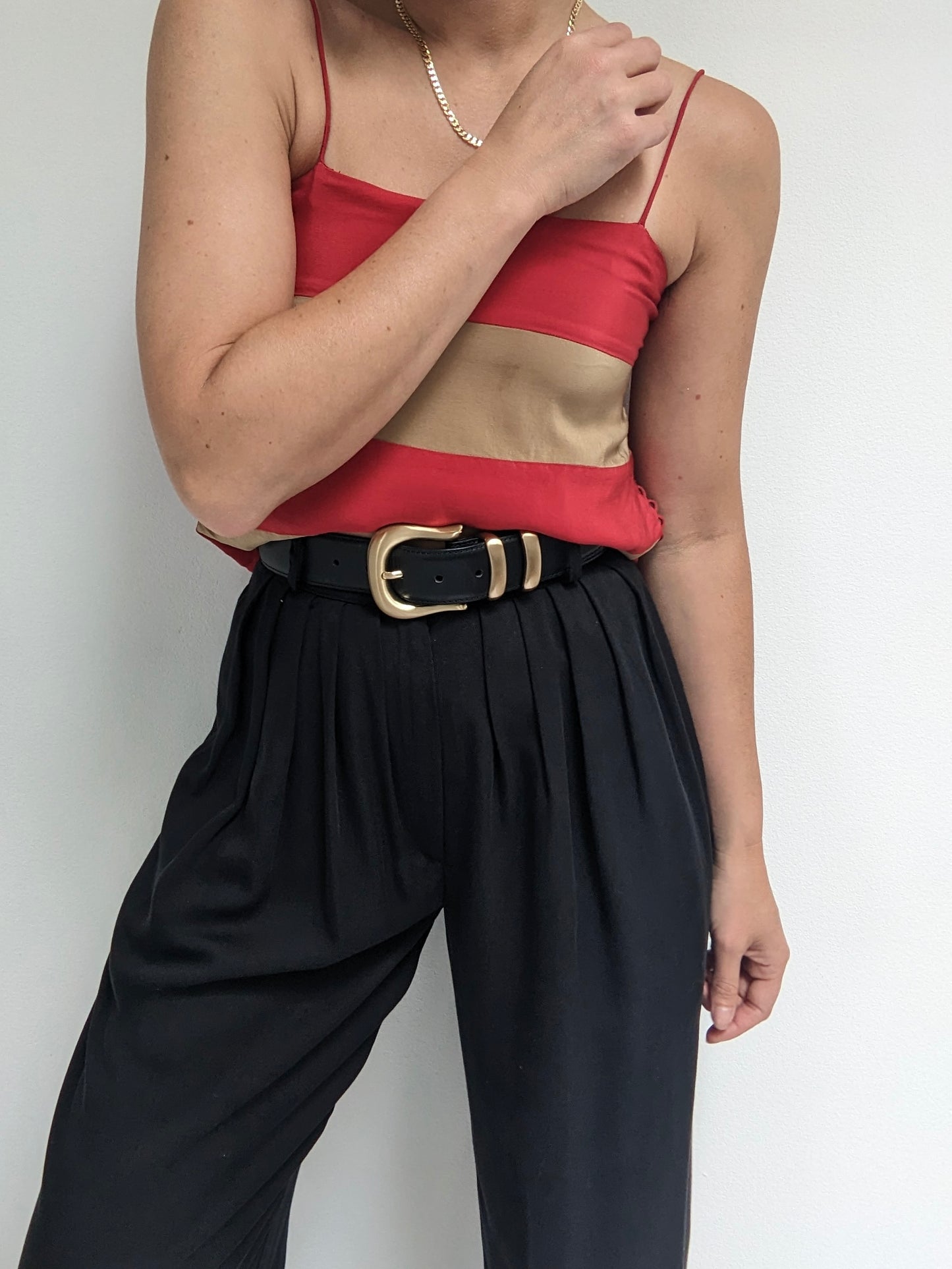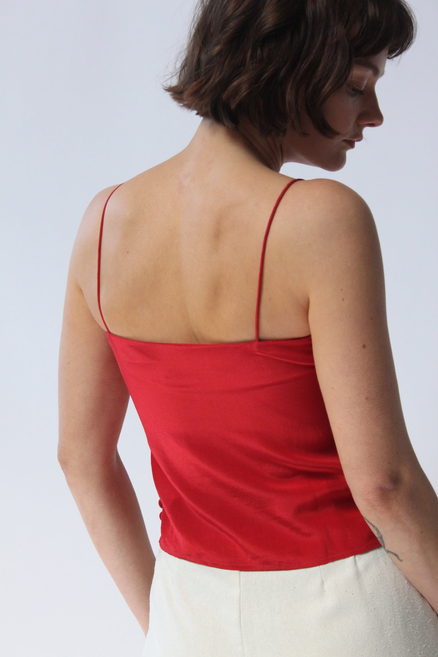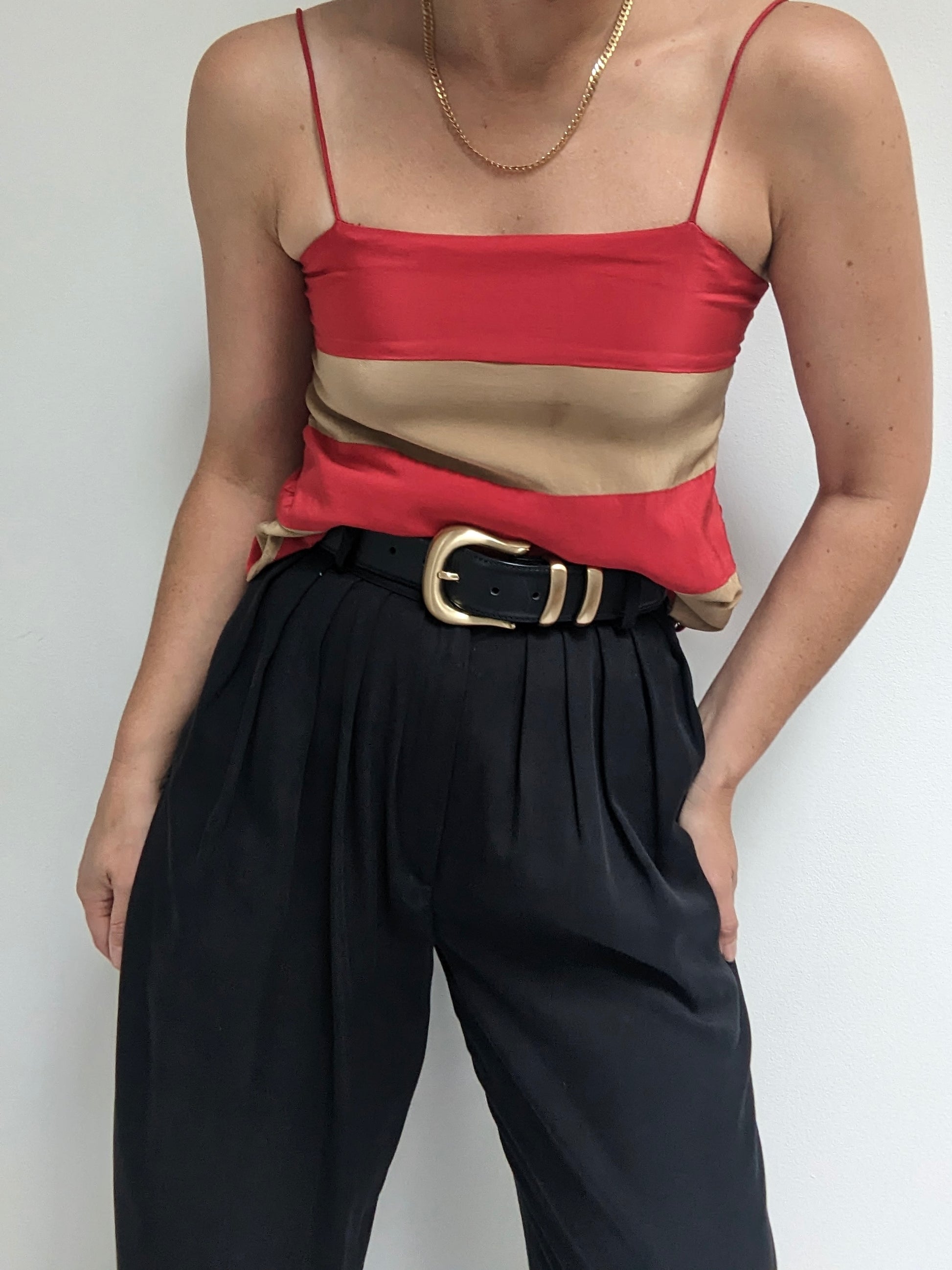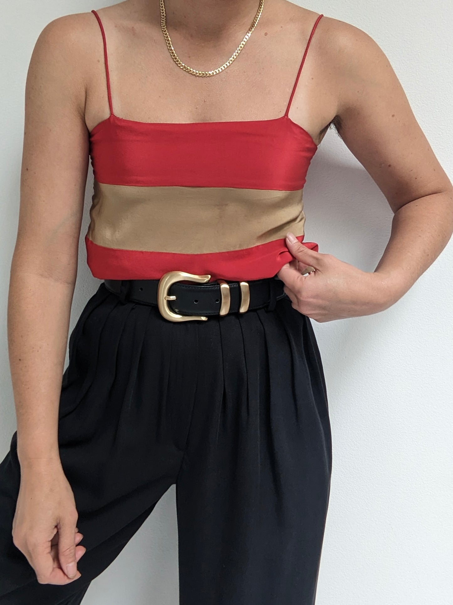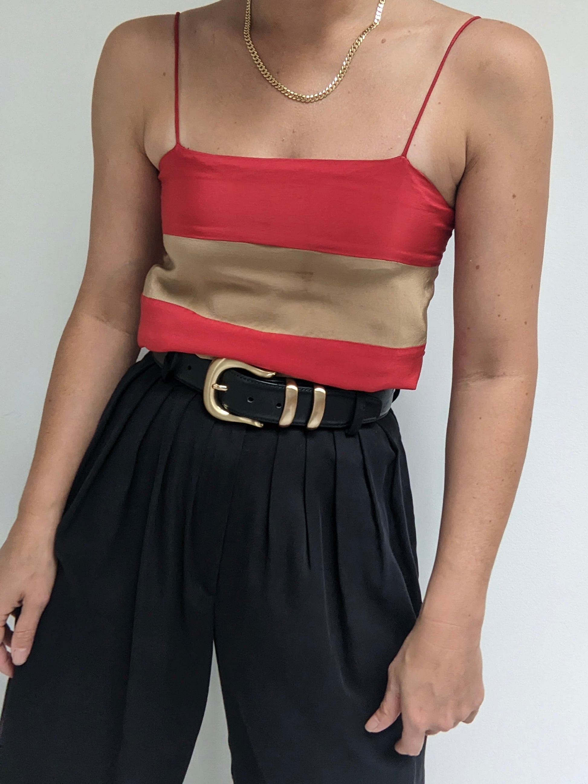 Favorite cherry and taupe silk camisole with button closures at the side, a delicate shoulder strap and cropped design.