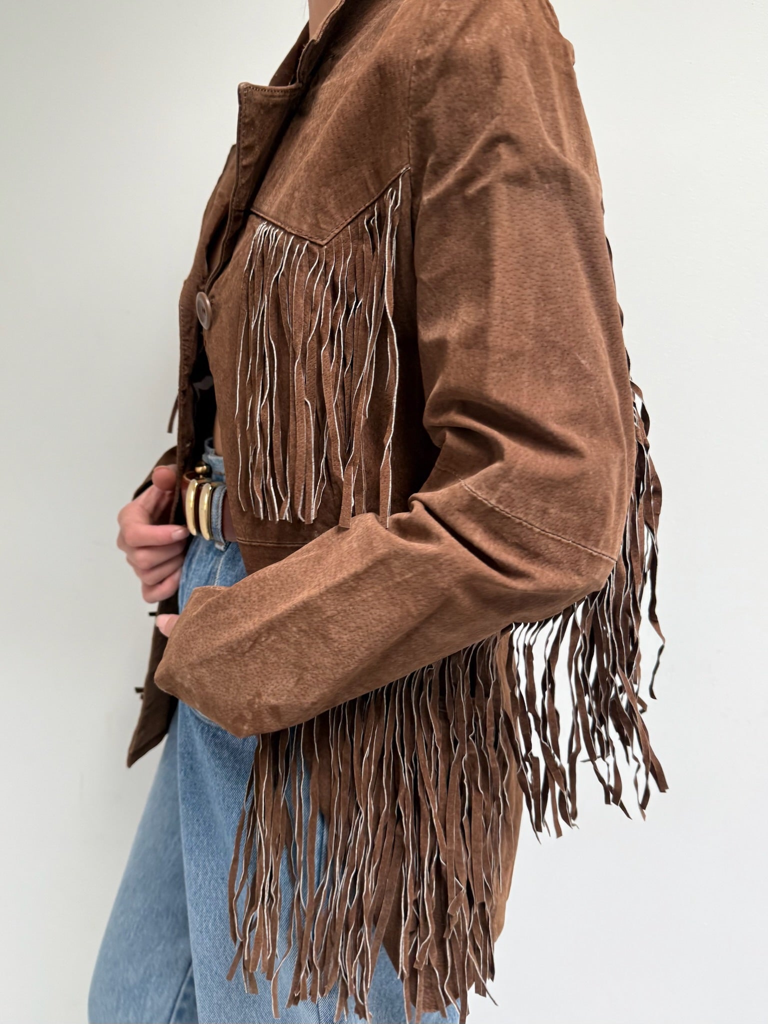 Chocolate brown jacket in a smooth sueded leather fabric with our absolute favorite fringed detail throughout. Jacket has monochrome buttons up the front, a notched collar and side pockets. Includes a lined interior for added comfort.