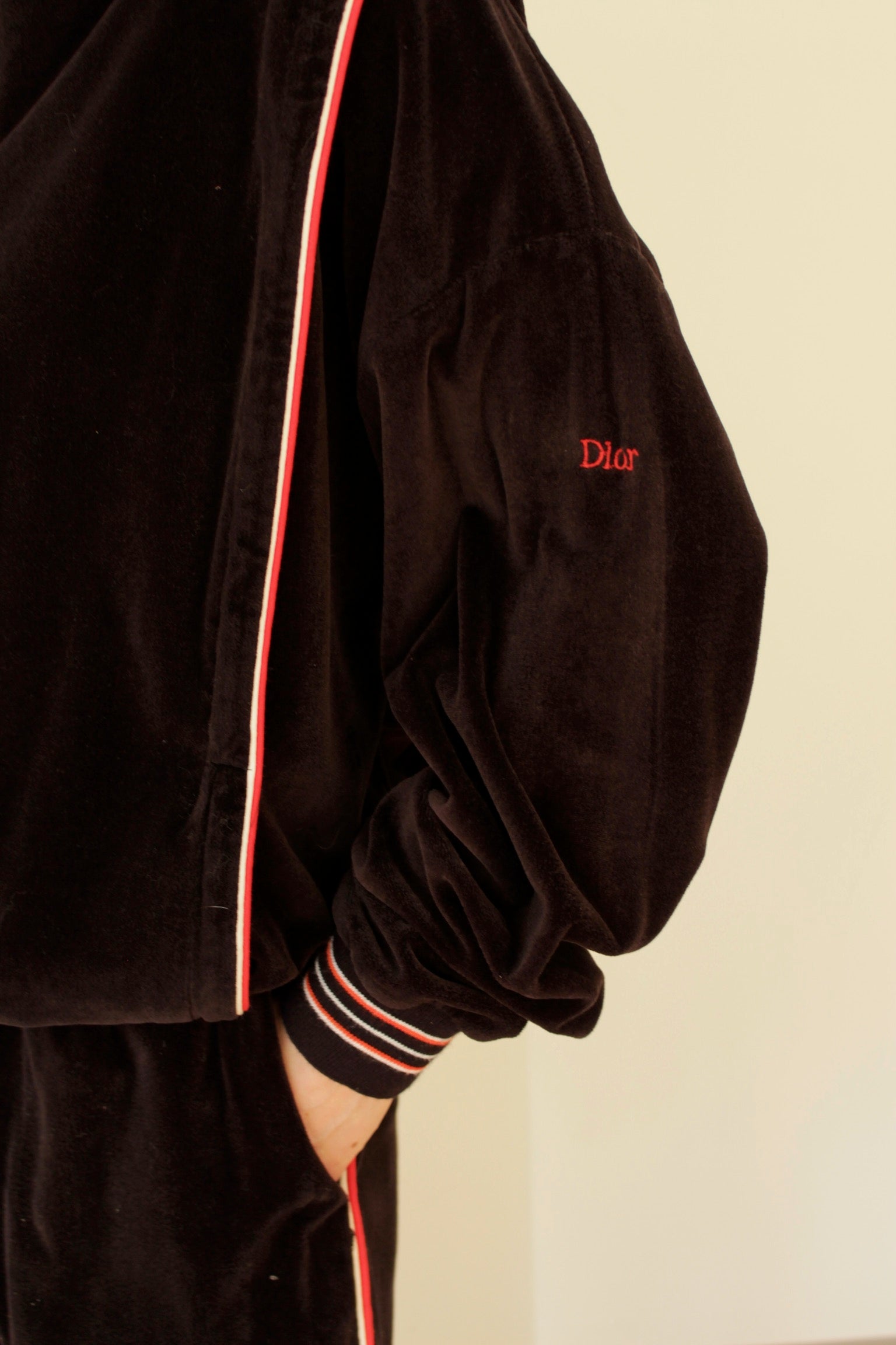 Incredible velour set by Christian Dior Monsieur. The set is jet black with red and white accents down the side, at cuffs, waistband and neckline. The set has the Dior logo embroidered on the upper sleeve.
