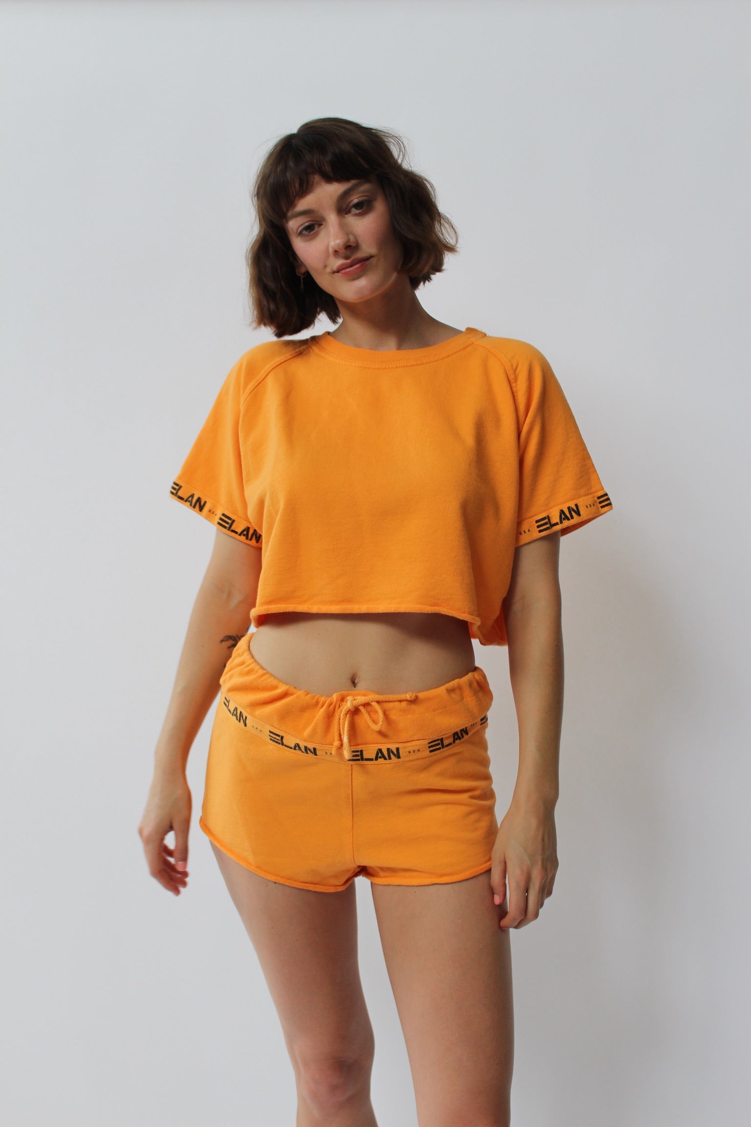 Lovely soft and worn citrus cropped short set. This sporty set includes a cropped t-shirt and ultra short drawstring shorts. This piece is perfect for beach volleyball :) and we adore the ELAN details at the waistband and sleeve ends.