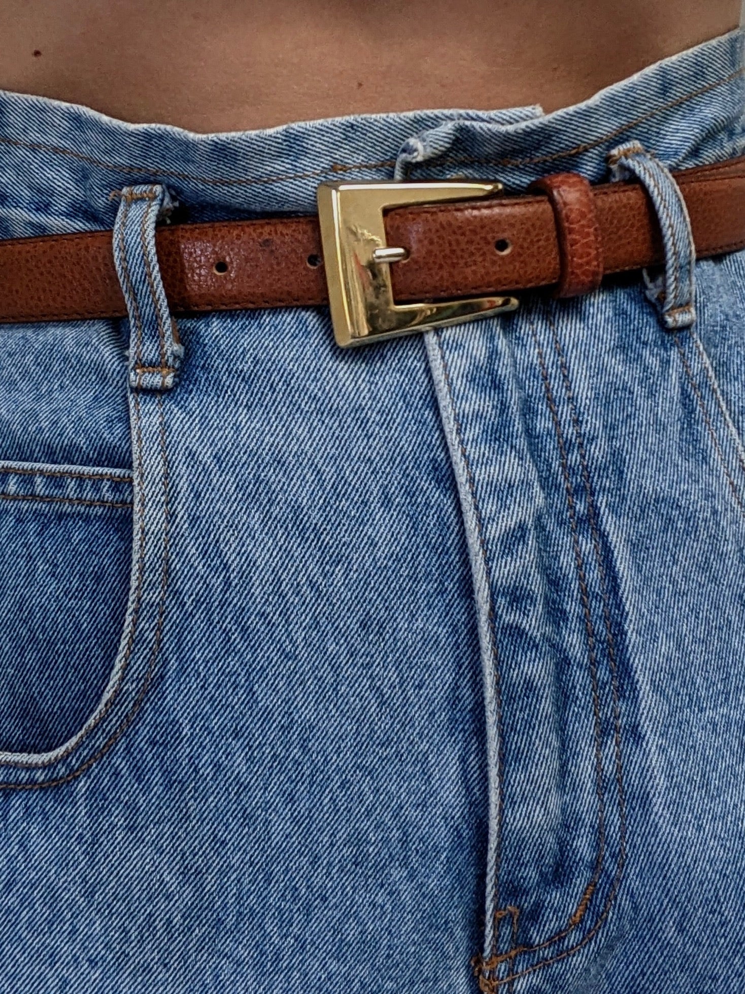 Classic vintage belt in a cognac brown color & our favorite pebbled leather. Belt has a mid-width cut and a bright, gold buckle.
