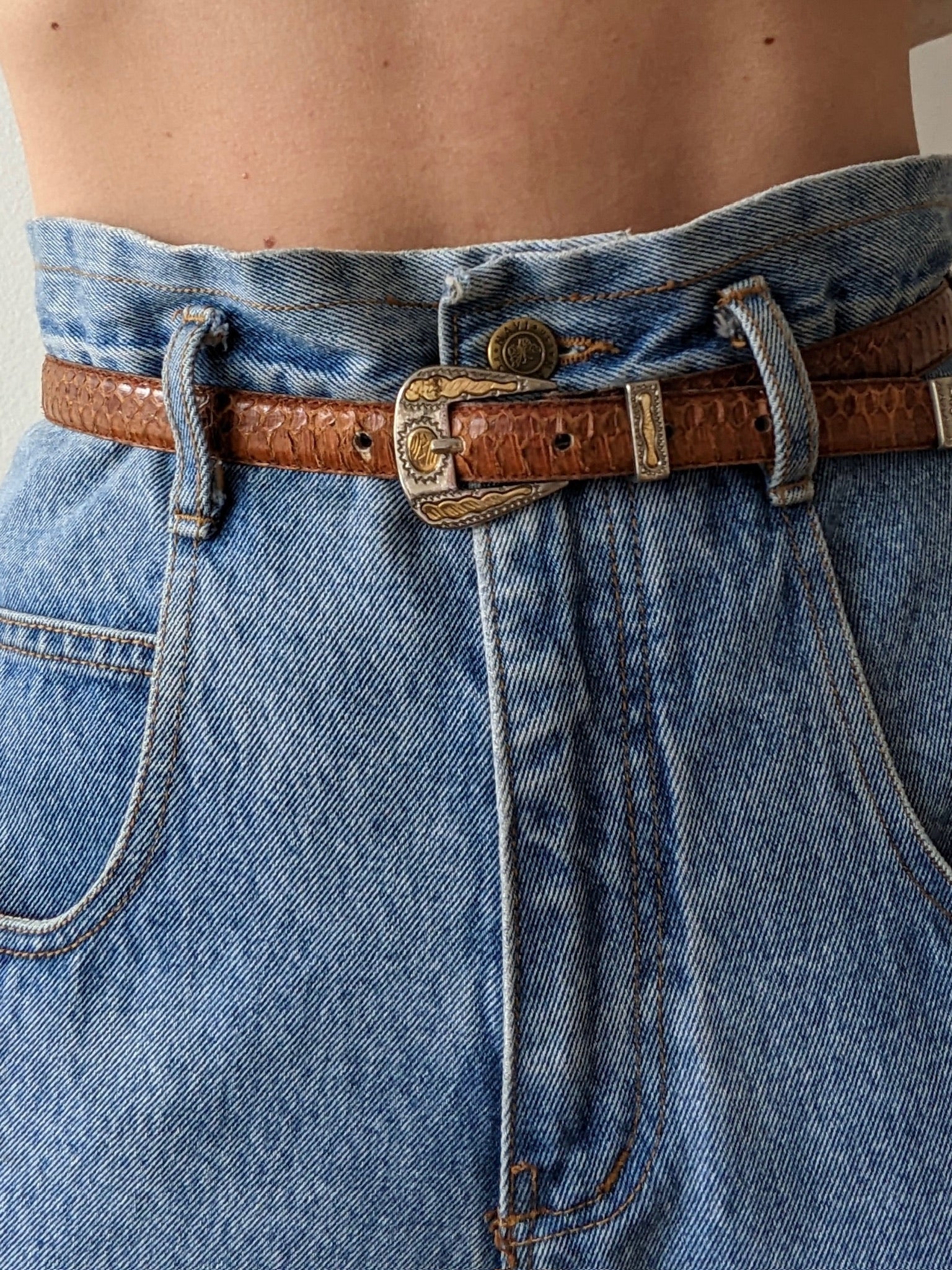 Vintage cognac belt in a genuine snakeskin leather. Belt has a western style to the mixed hardware with sweet etched design! Features a thin width and lovely matching hardware at loop & tail end.