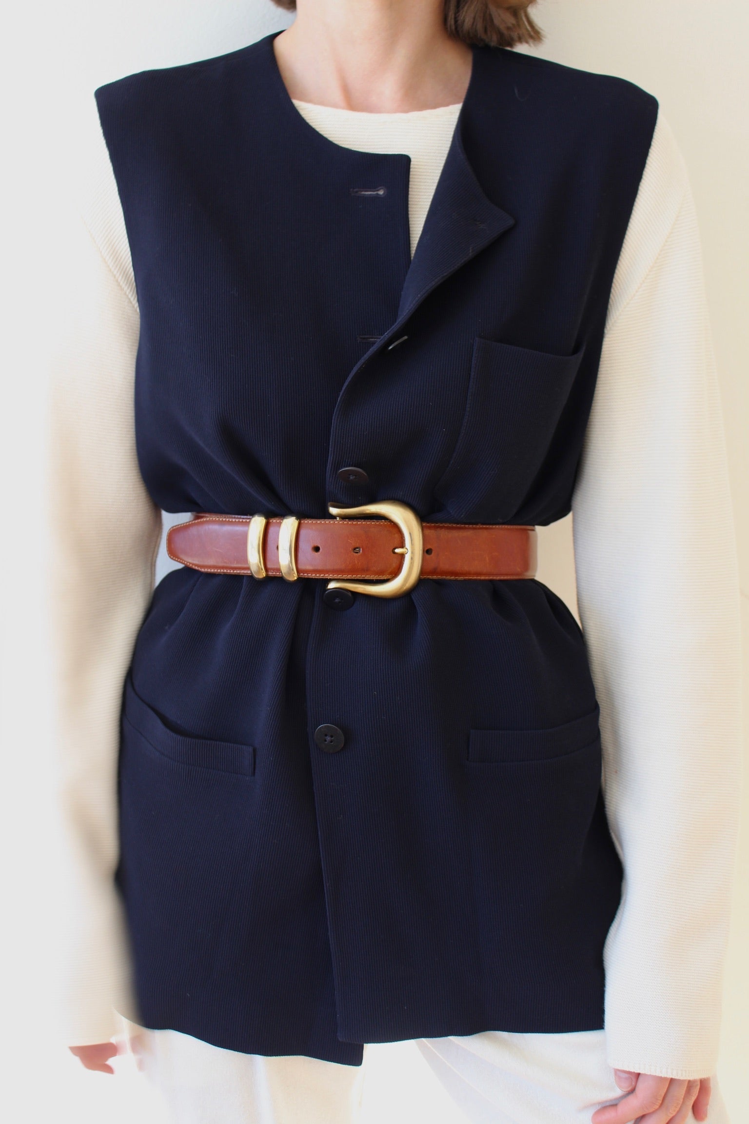 Beautiful midnight ribbed silk vest in a button up design and long tunic drape. The vest has a patch chest pocket and two slit pockets at the lower. The vest is fully lined and has matching midnight buttons at the front. A great style belted with your favorite leather piece!