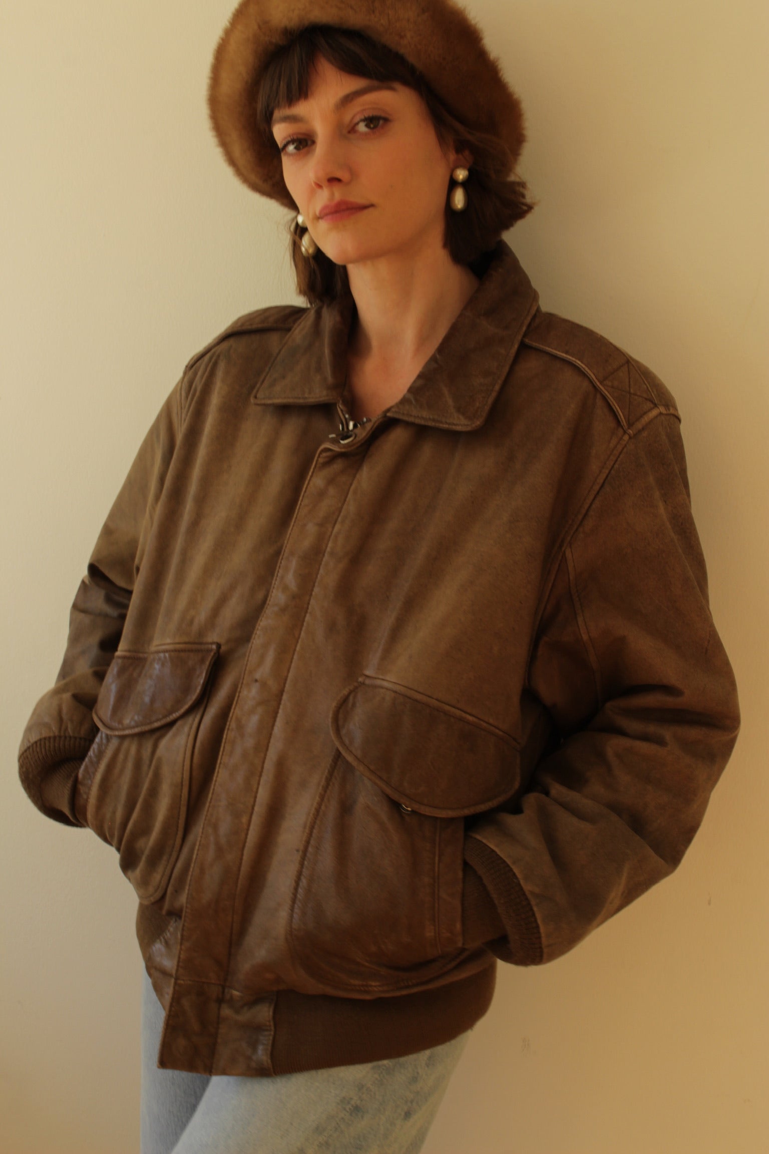 Vintage bomber jacket in a faded cappuccino brown tone and smooth leather fabric. Bomber has four front pockets, cinched knit accents and a soft cotton liner.