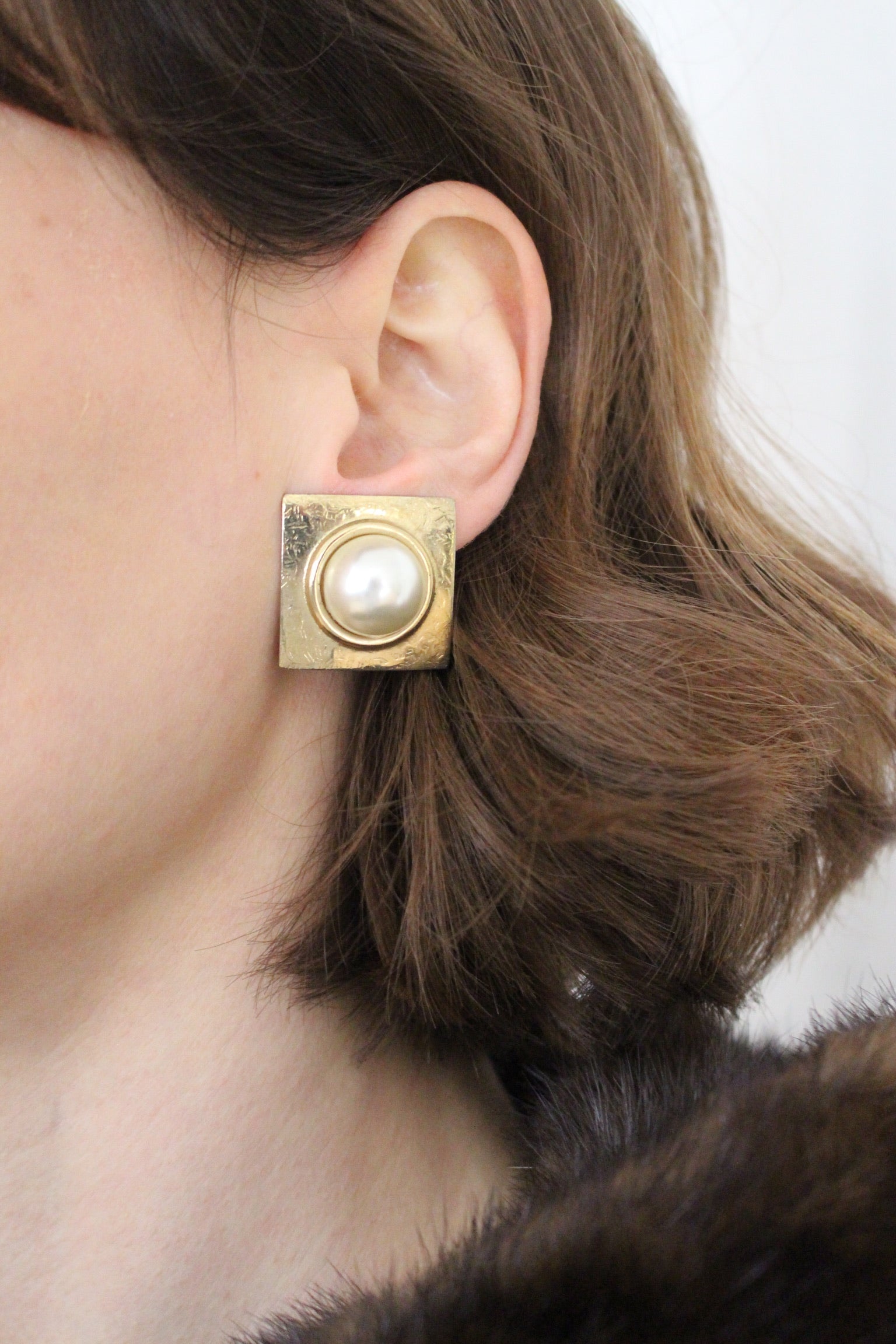 Beautiful vintage post-back earrings with a subtley embossed gold plate frame and a large, faux pearl cabochon center.