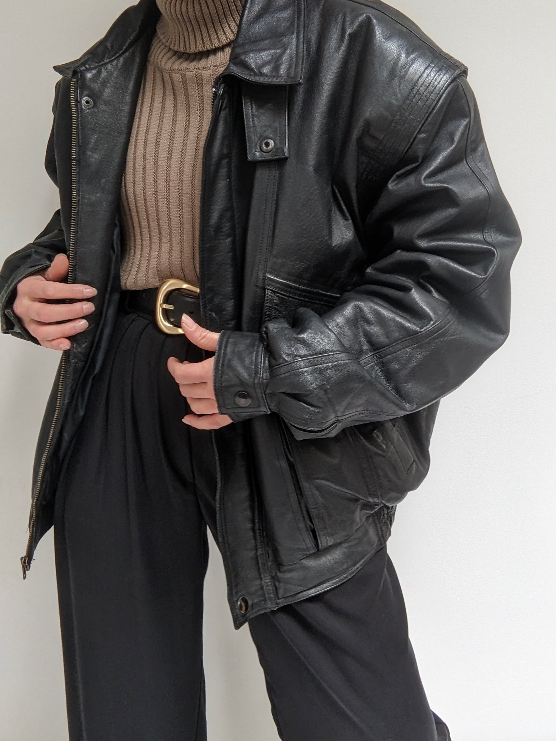 Padded bomber jacket in the darkest ink black color & pebbled leather fabric. Jacket has a cinched elastic waist hem, a zipper closure up the front, a collared neckline and four front pockets. Includes a lined interior.