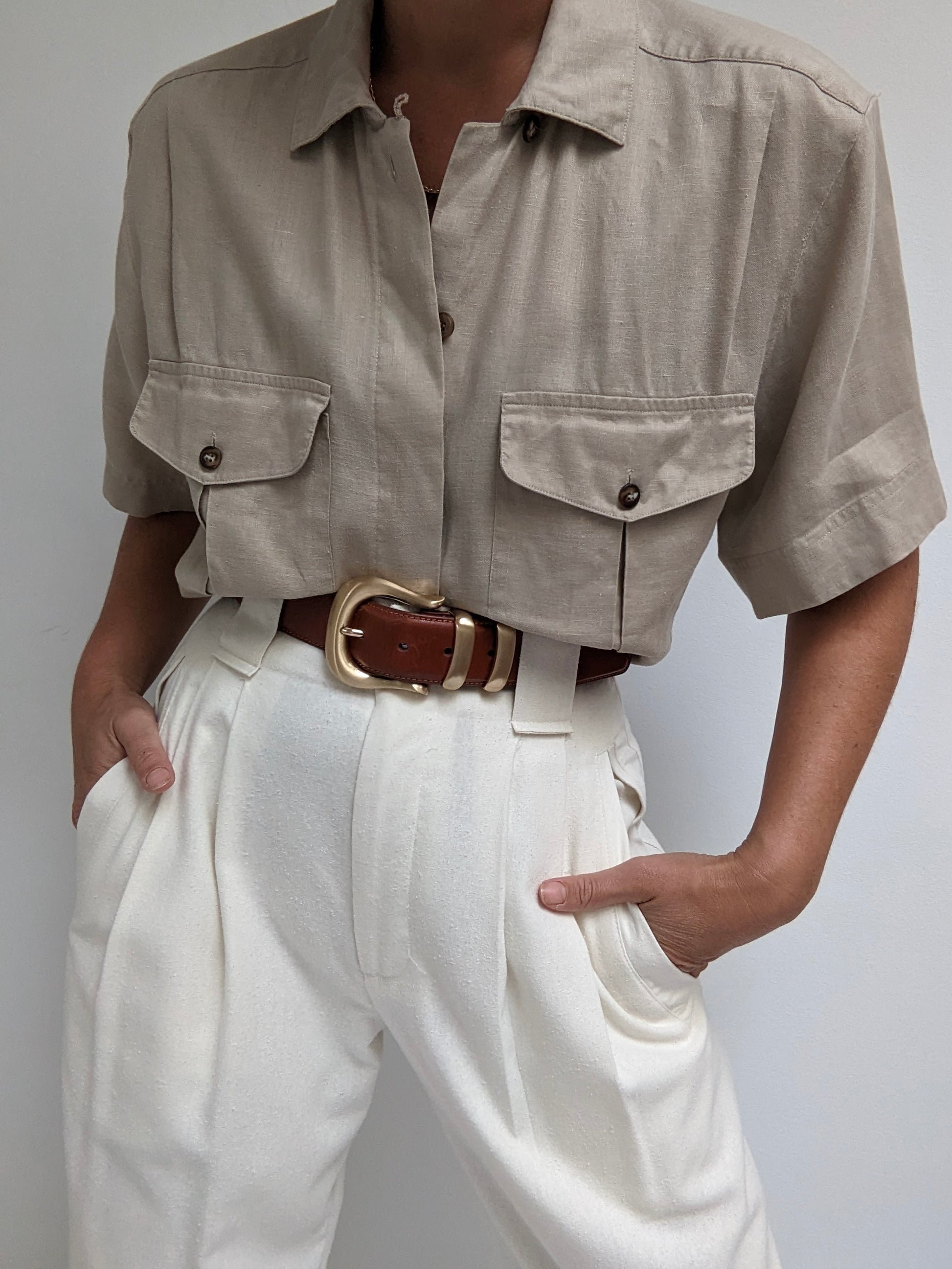 Beautiful, classic blouse in a tightly woven linen fabric. Blouse has a collared neckline, double chest pockets with buttoned flaps and a box fit.