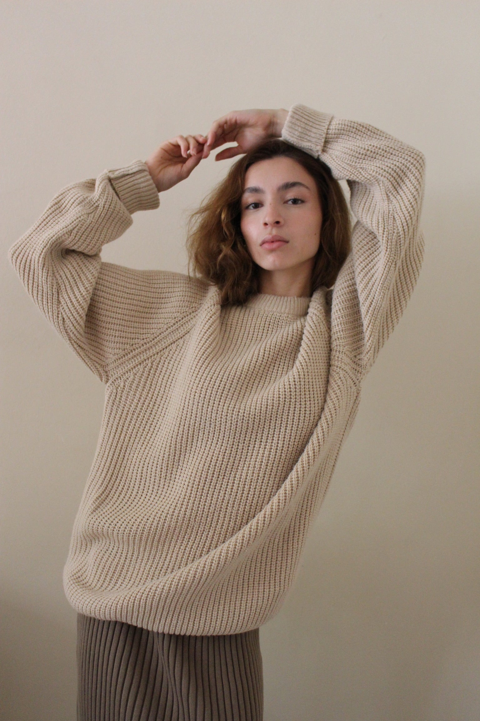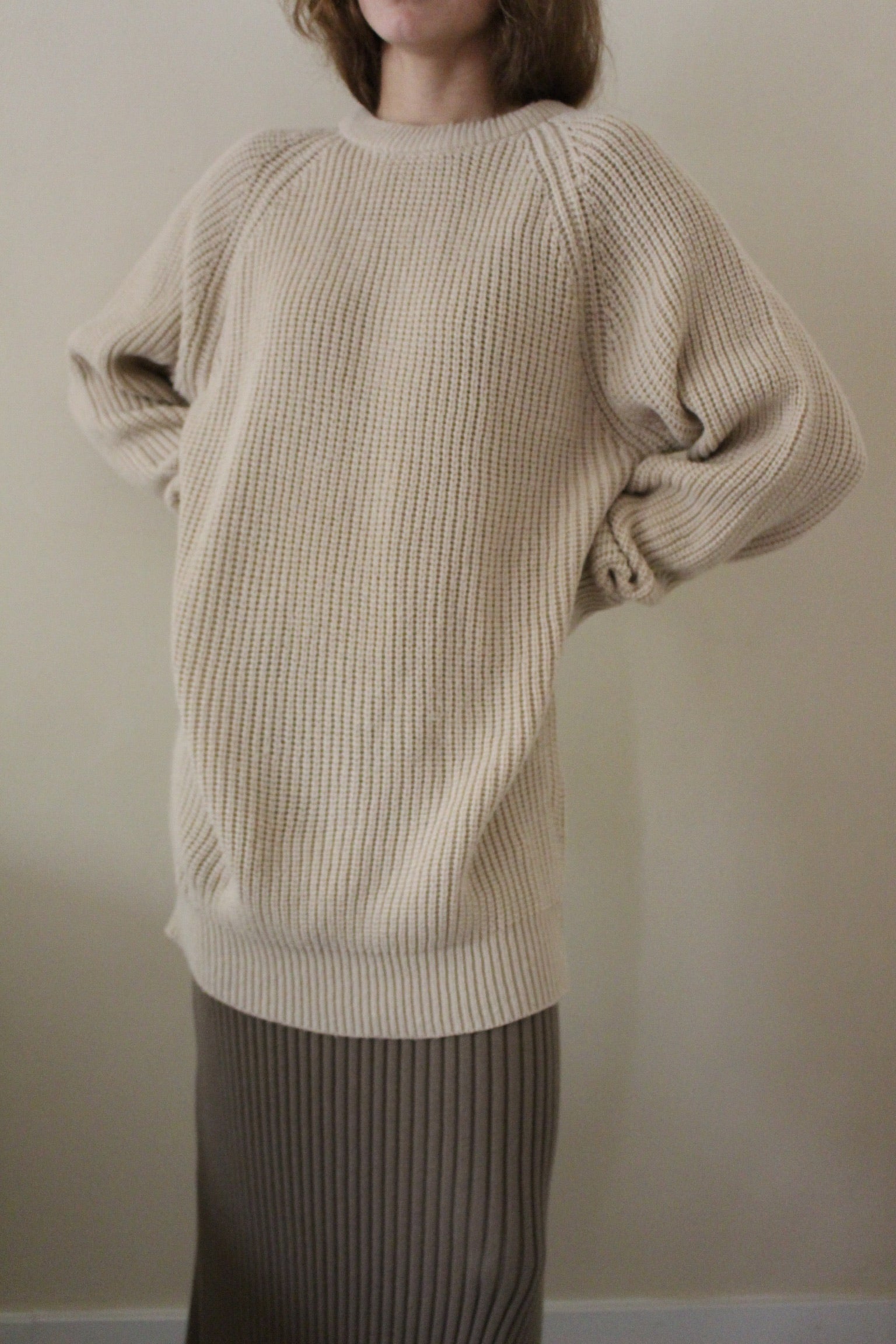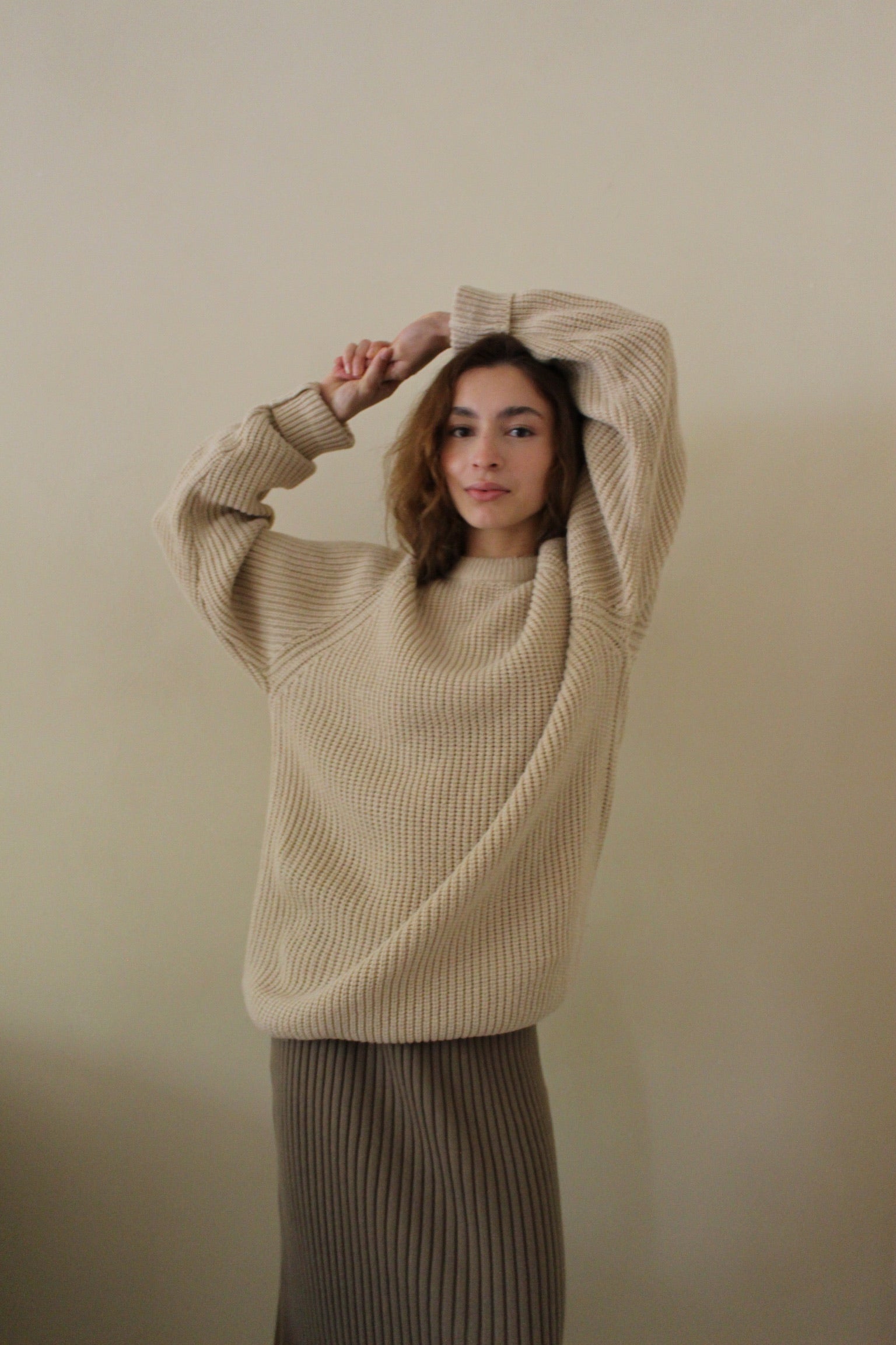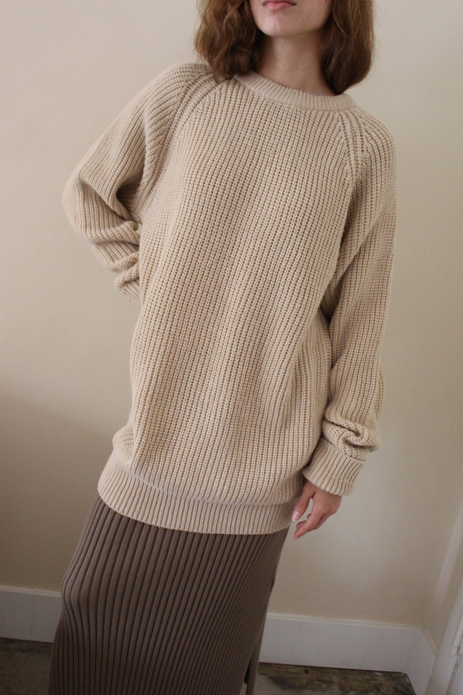 Soft knitted sweater in a pale latte brown. Sweater has our favorite raglan seams, crew neckline and a longer, relaxed fit.