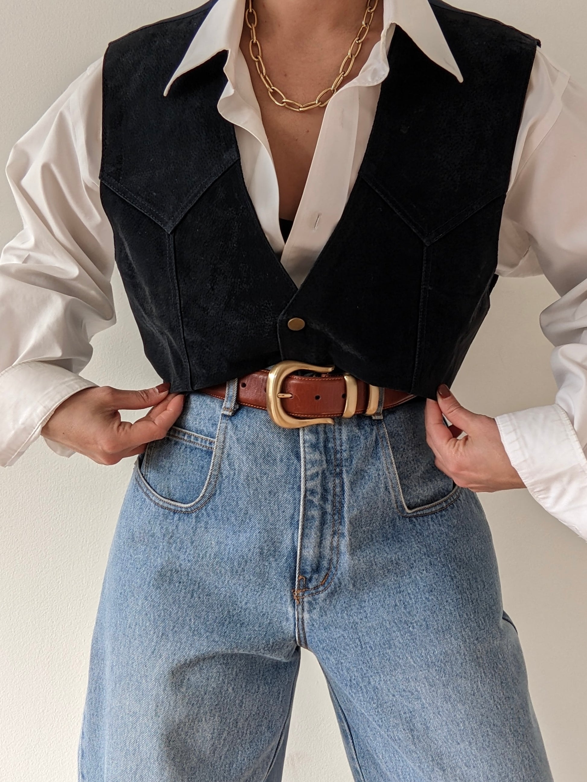 Faded midnight blue vest in a smooth sueded leather. Vest has snap closures up the front, a collarless v-neckline and petite pockets. Features a back belt for an adjustable fit.