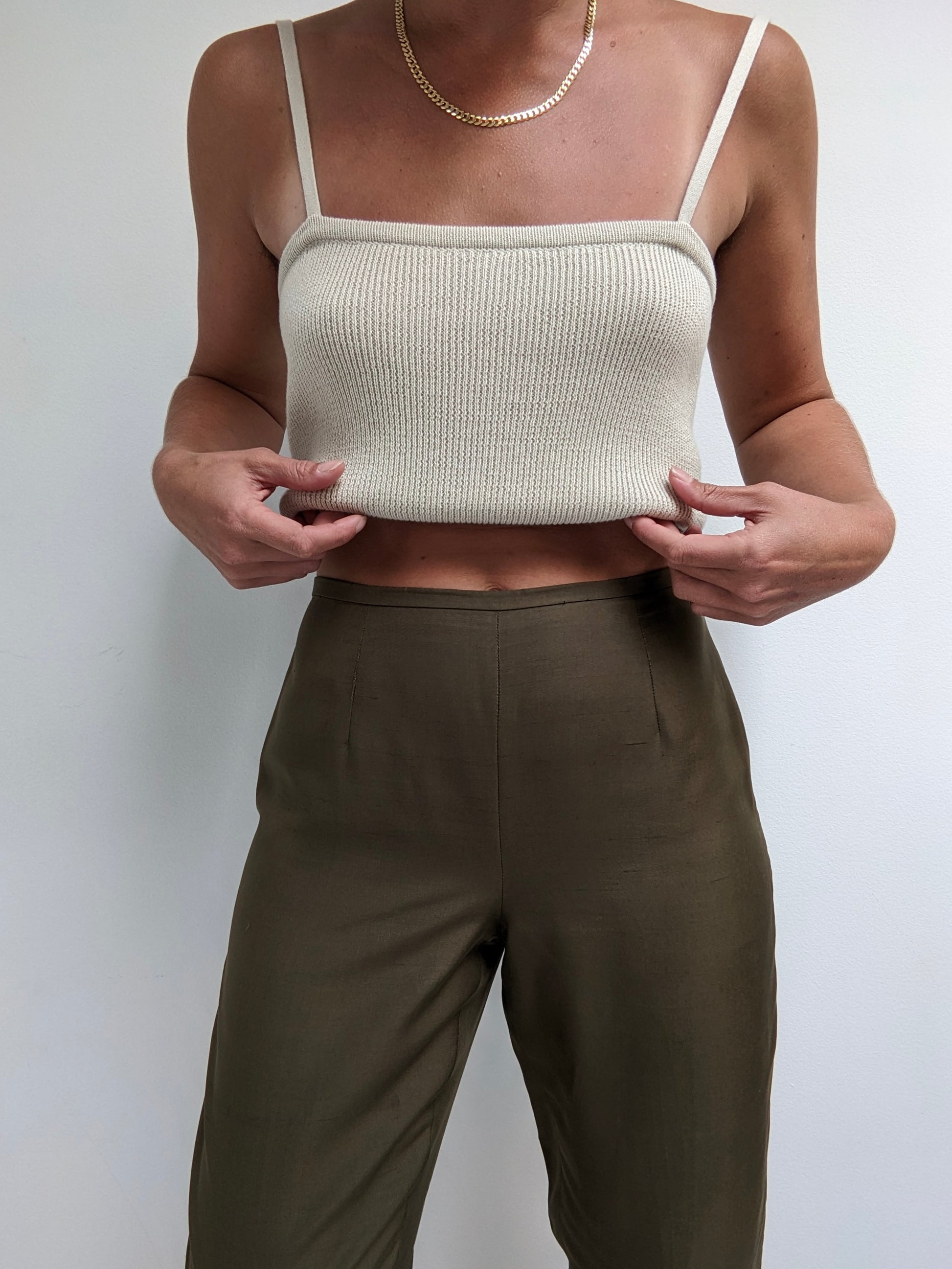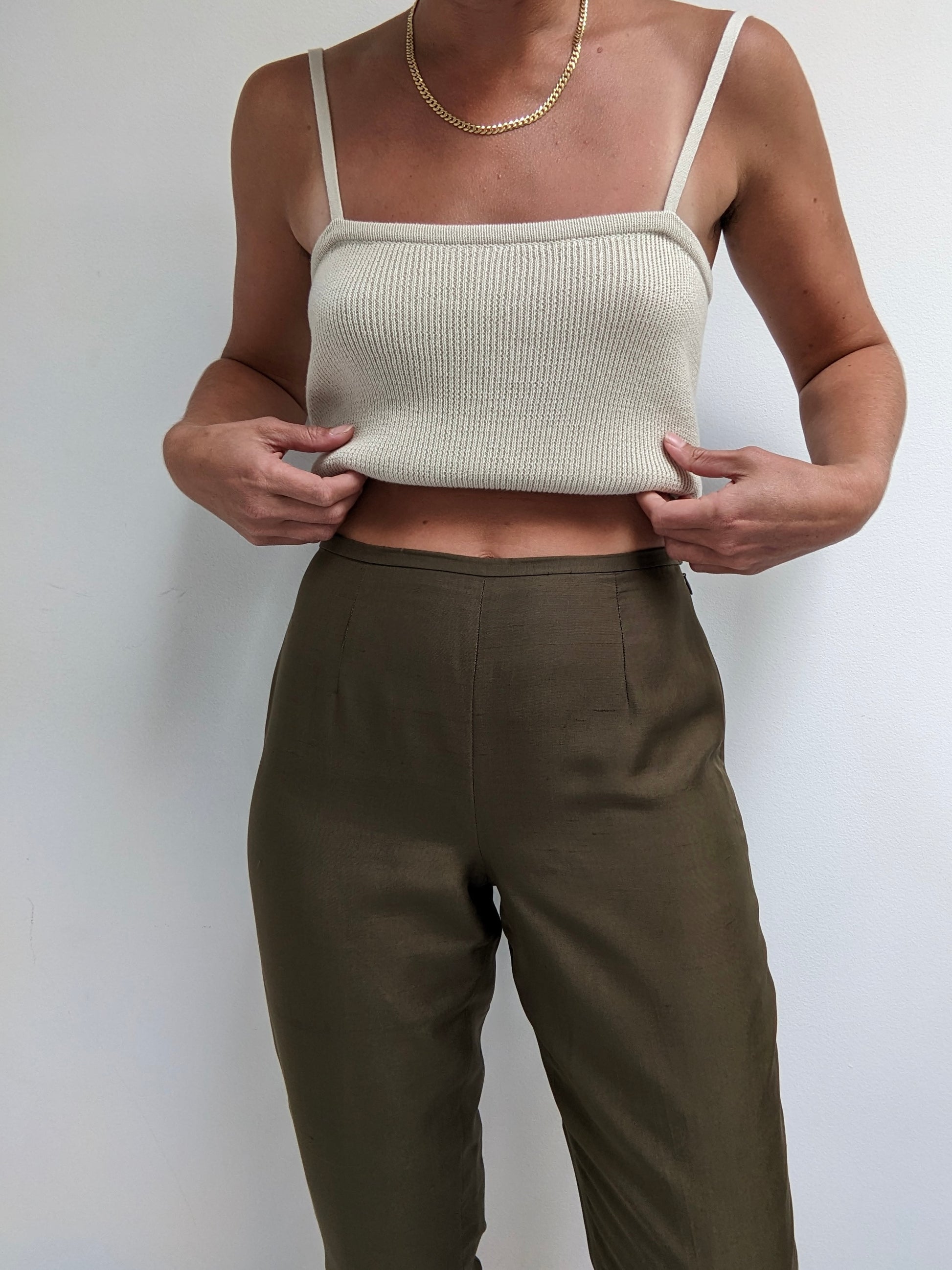 Thin, brushed silk pants in a stunning olive green. Pants have a mid-rise fit with side zipper/button closure. Features a petite side slits at the ankles and a cropped leg.