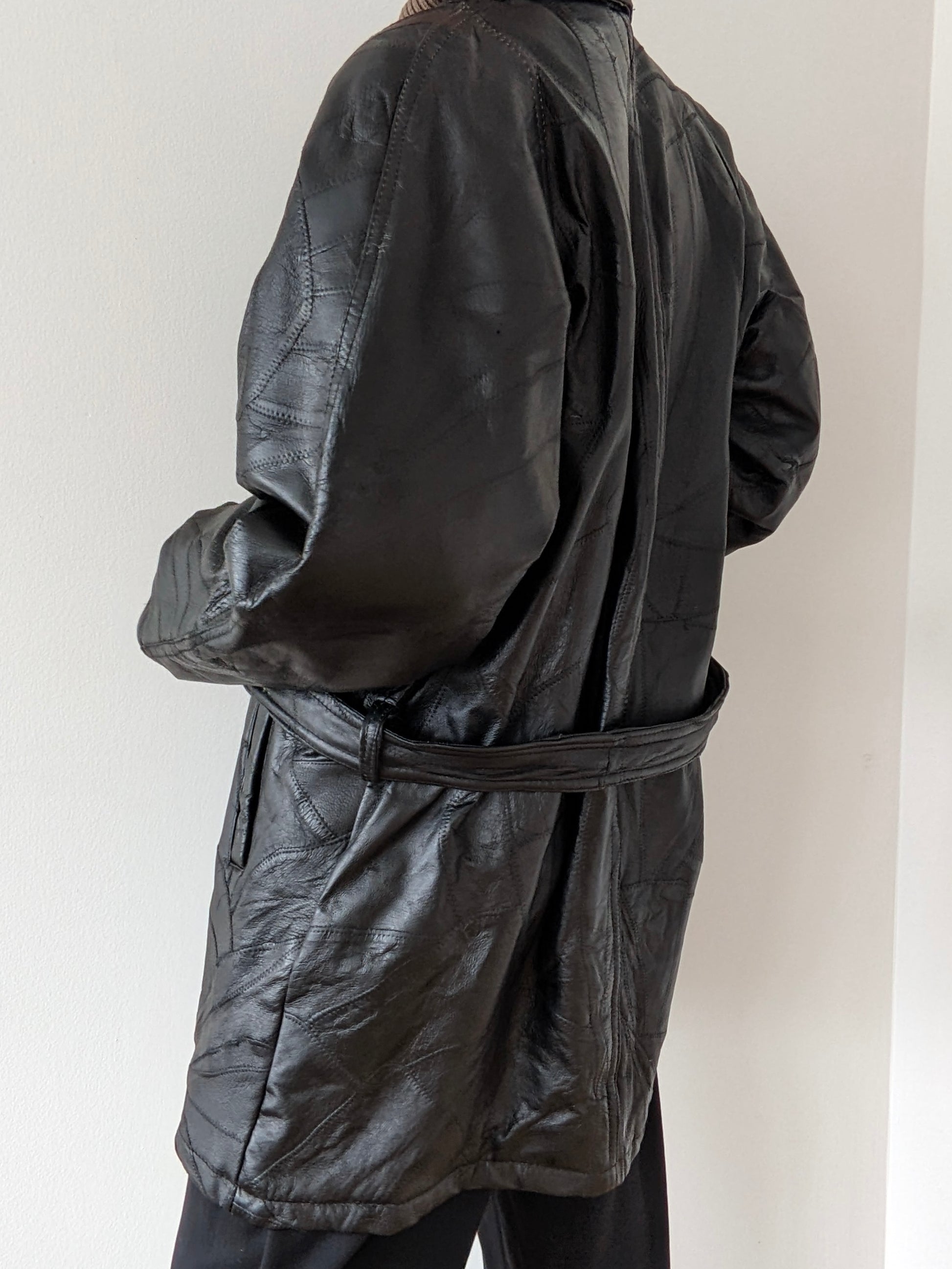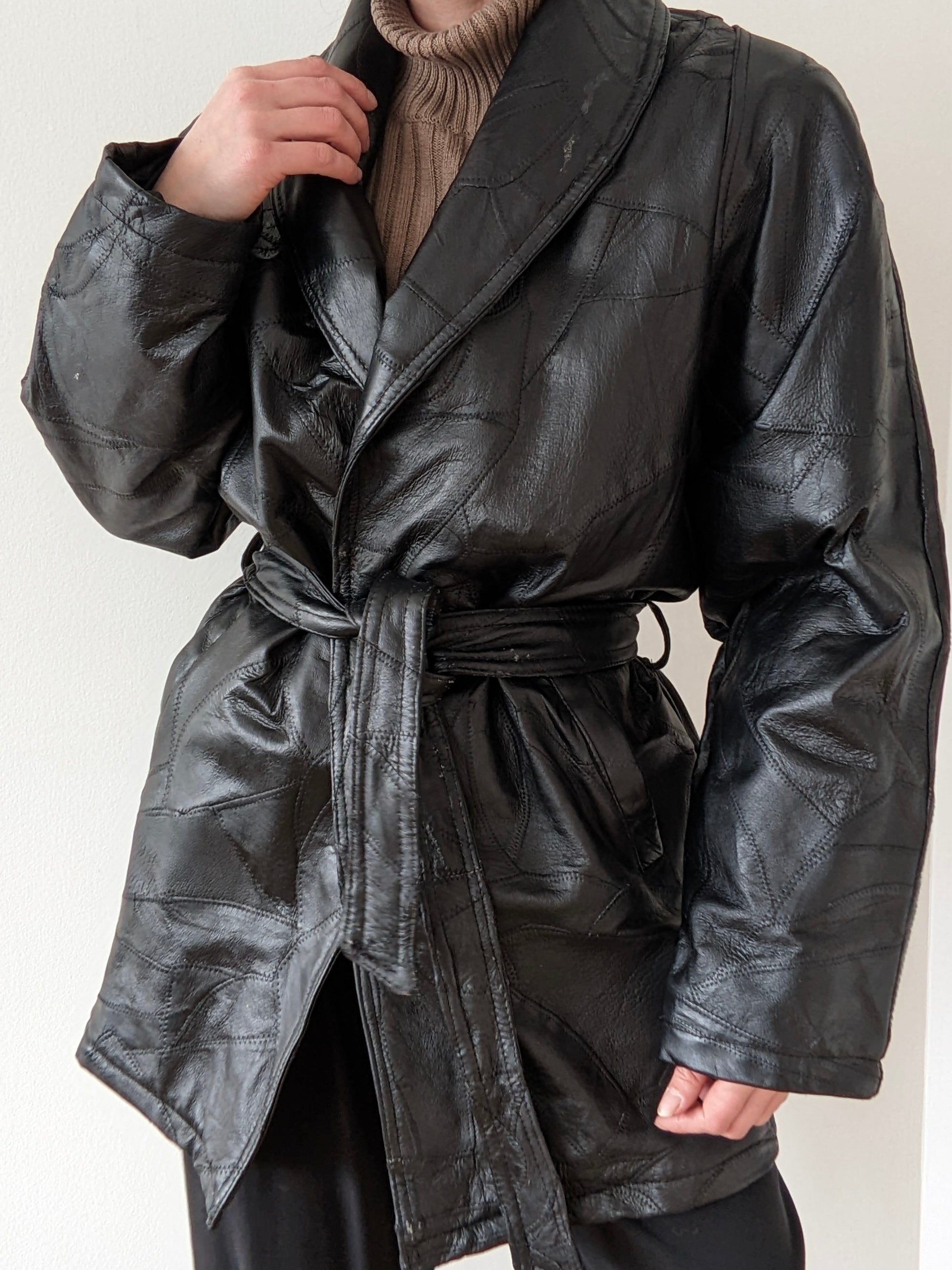 Vinatge onyx coat in an amazing, patchworked leather! Coat has our favorite belted design with a shawl collar and side pockets. Includes a lined interior for added comfort.