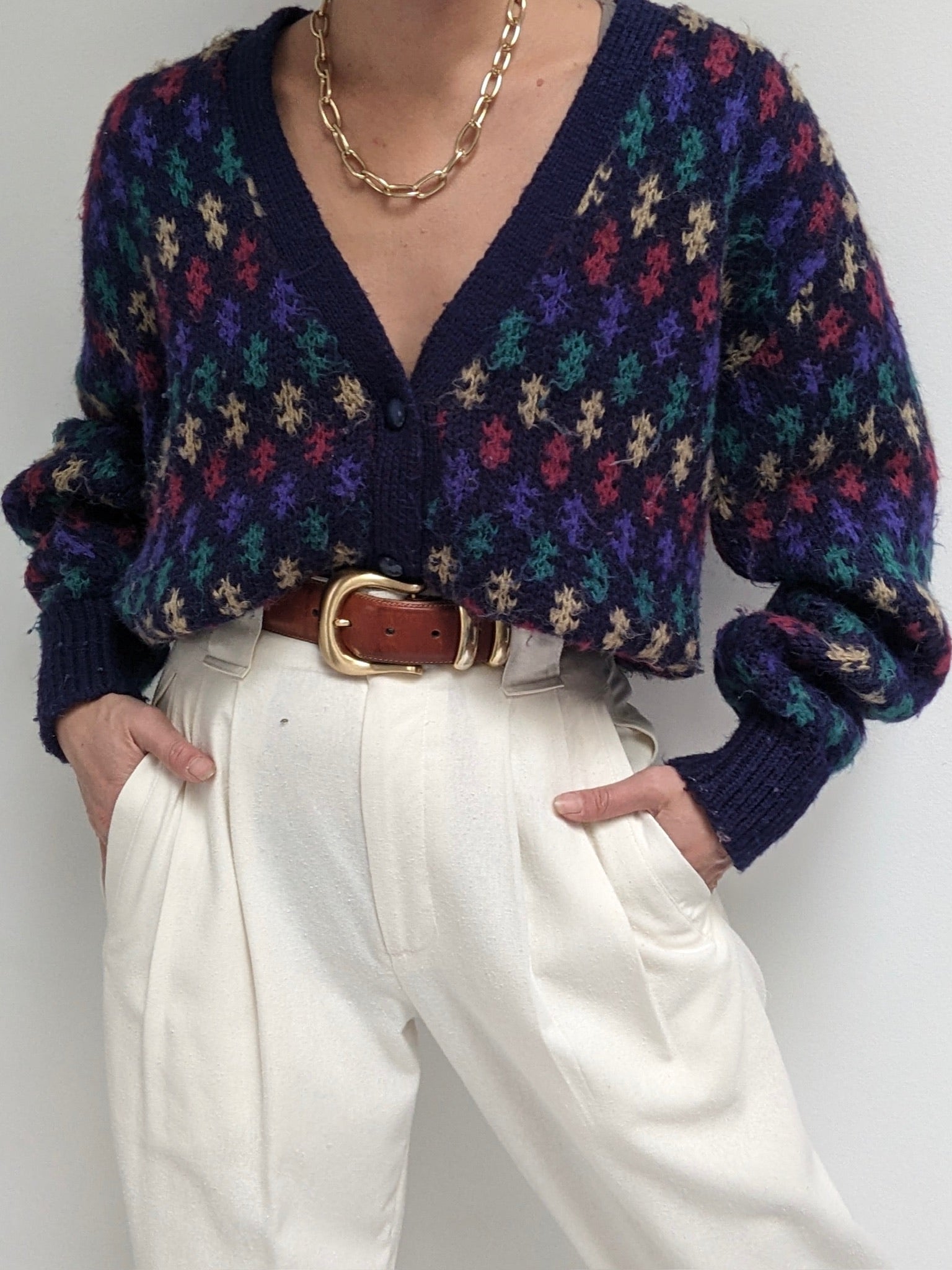 Cozy vintage sweater in a cardigan design with a fun pattern throughout. Sweater has a deep v-neckline with buttons up the front and a cinched waist hem.