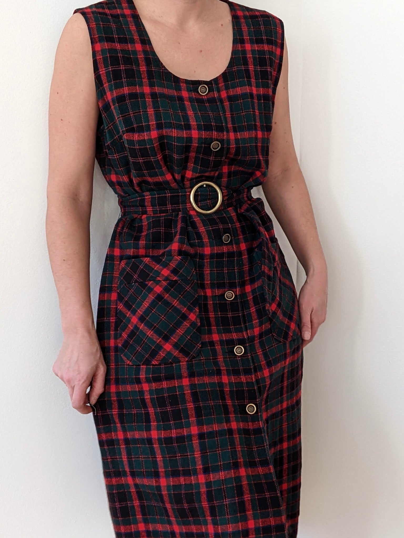 Lovely vintage wool dress by Pendleton in a classic red, green & black plaid. Dress has a sleeveless design with button closures up the front and a matching waist belt. Includes a lined interior for added comfort.
